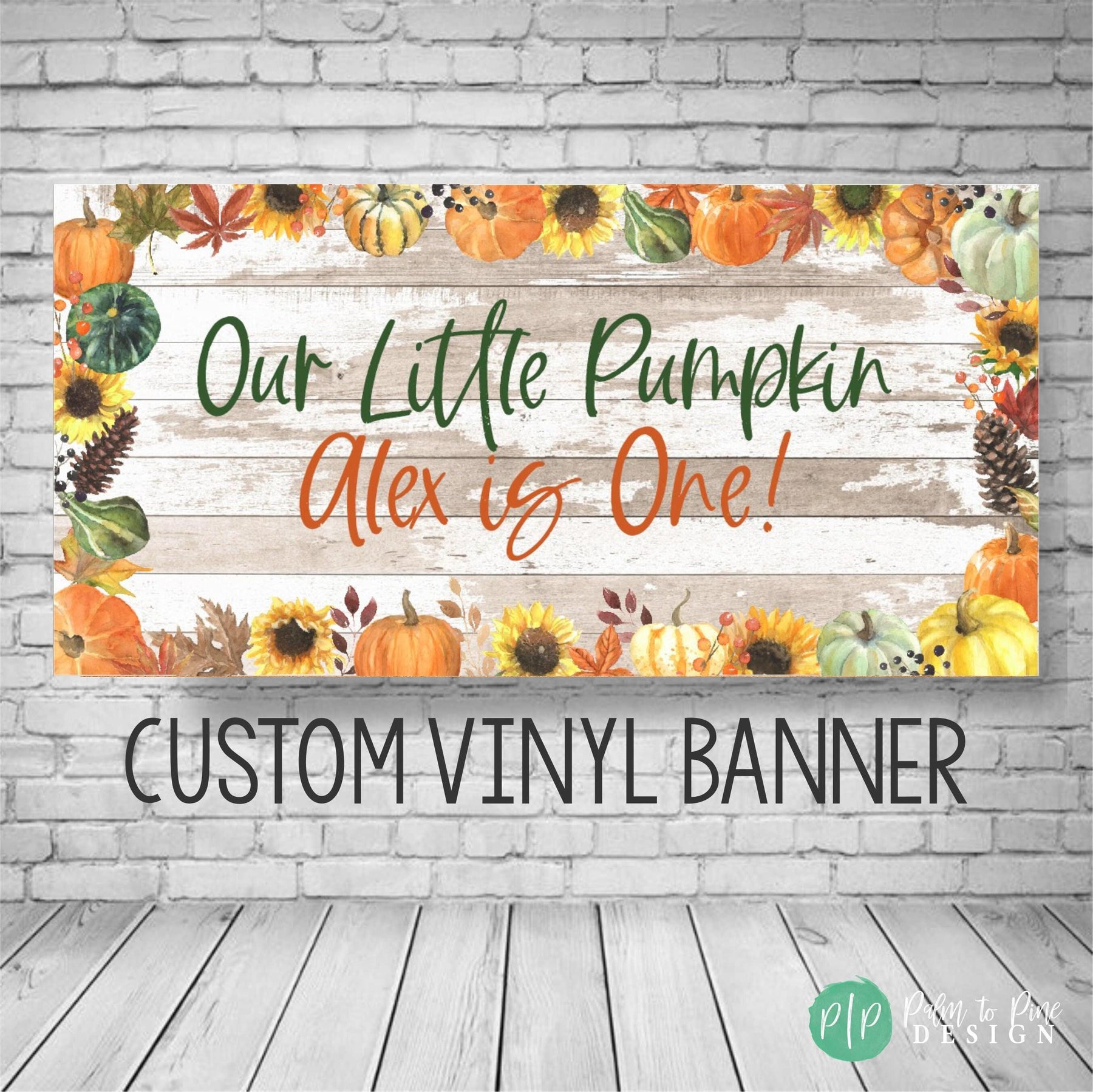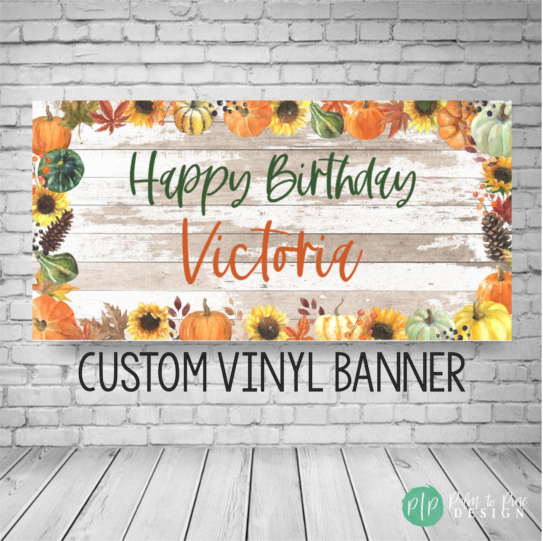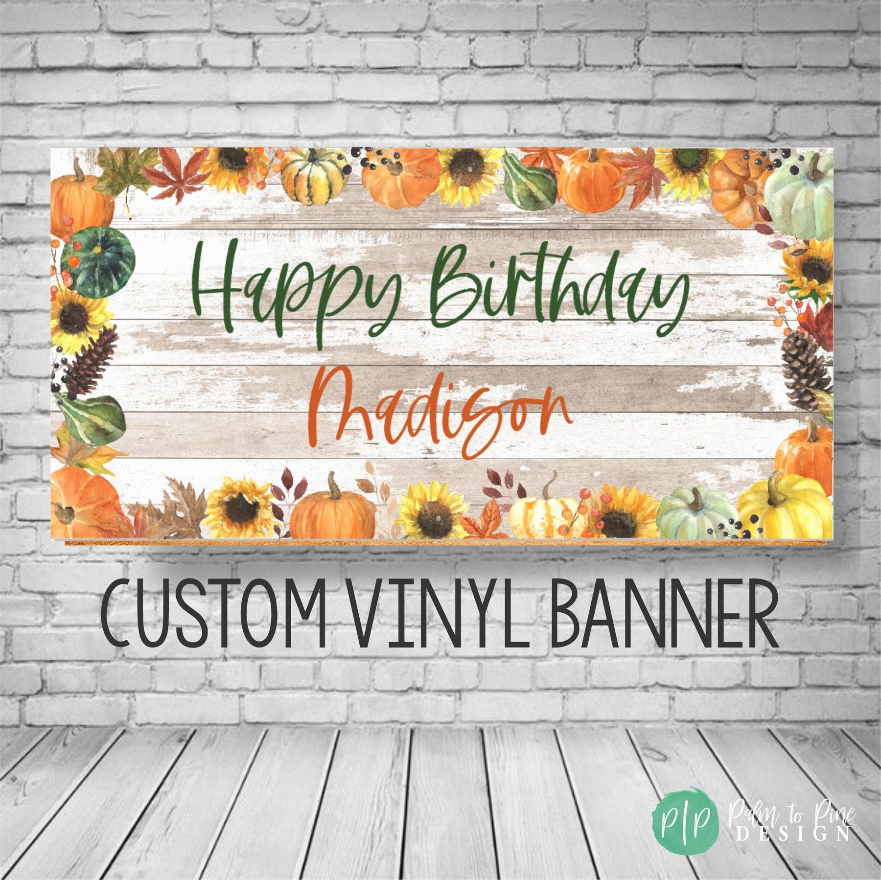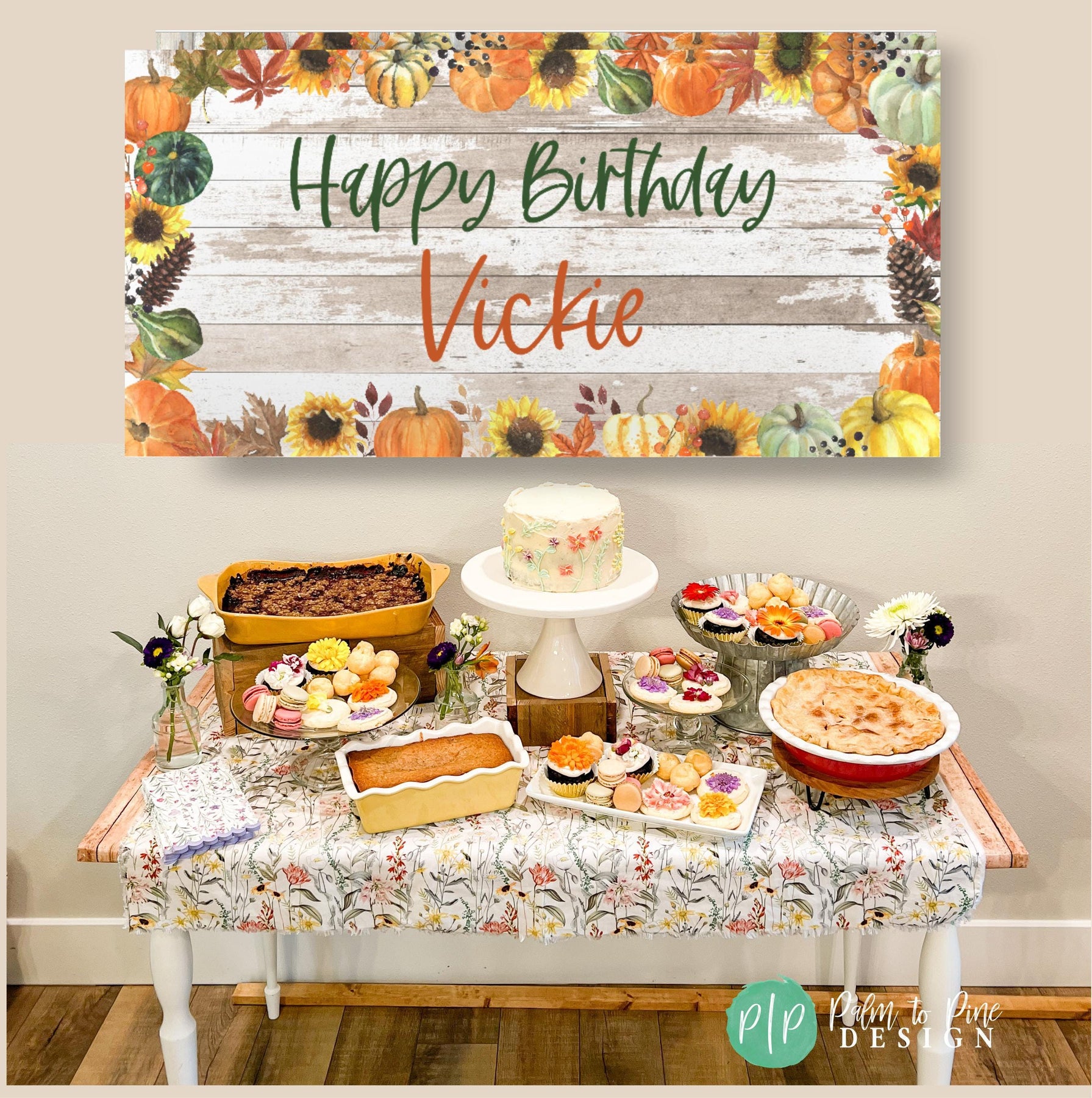 This custom Fall thanksgiving or birthday banner with sunflowers, pumpkins and fall leaves is the perfect personalized backdrop for your little pumpkins Birthday party, fall baby shower, Friendsgiving party decor or Thanksgiving photo backdrop. This Happy birthday Fall banner can be personalized for a boy, girl or twins and the wording on this pumpkin Banner can also be customized to say anything, like "Happy Thanksgiving" or "Happy Friendsgiving" with a personalized family name, just include your wording request in your notes to seller section at checkout!