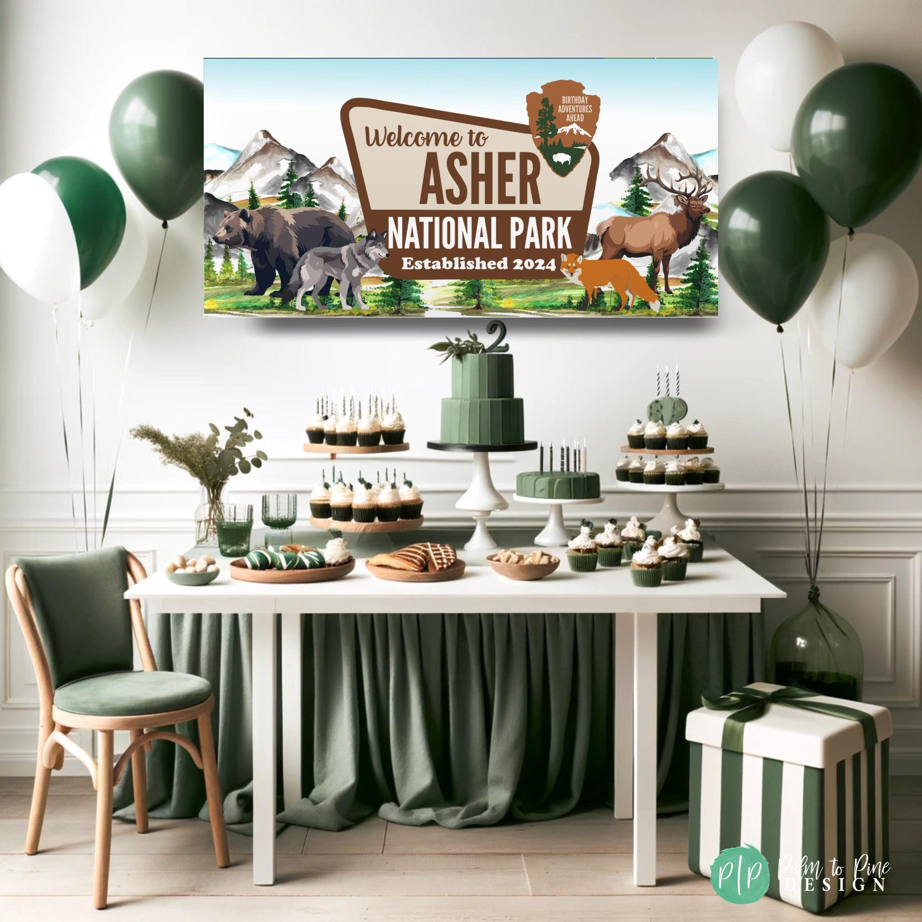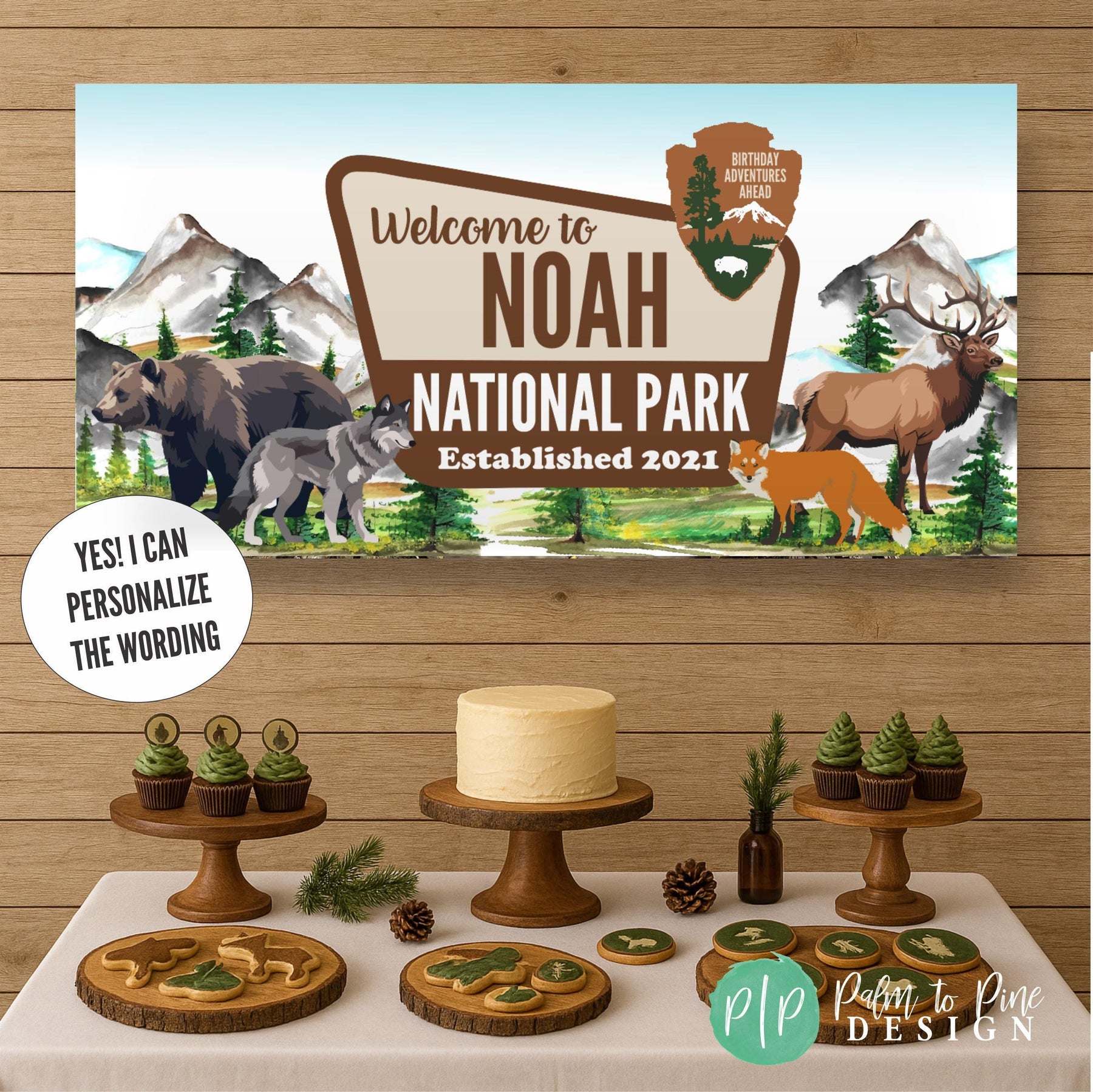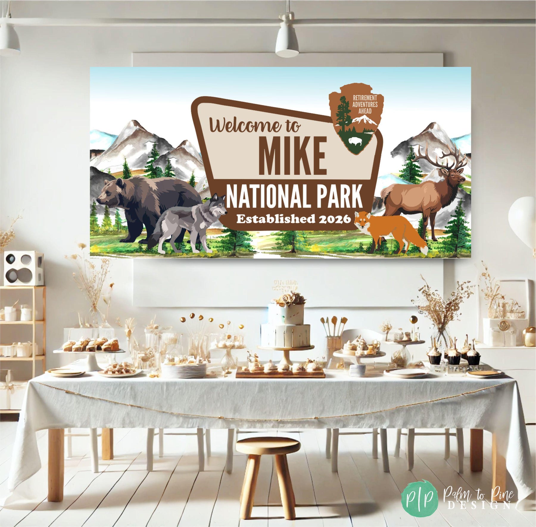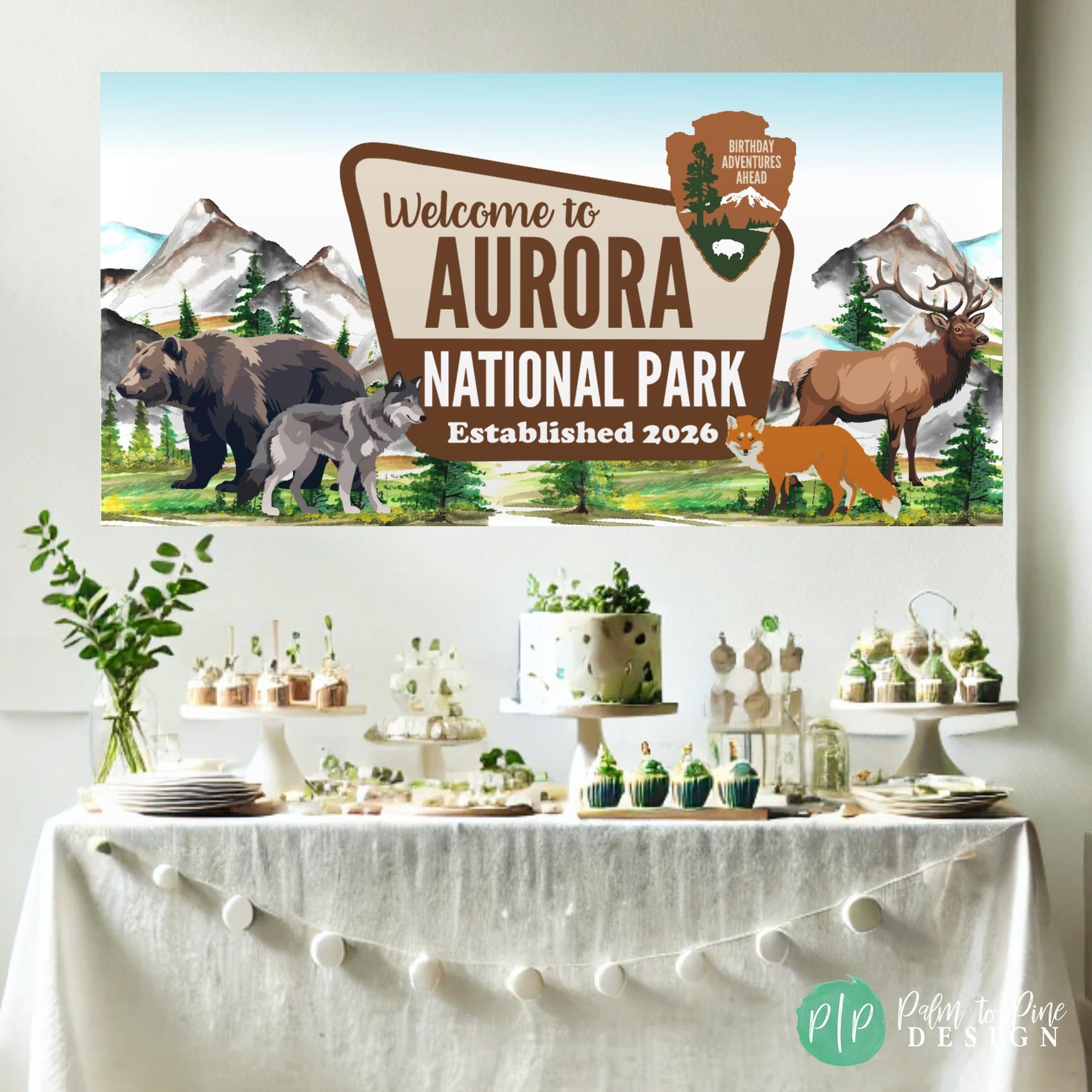 Celebrate at a mountain themed camping birthday with this personalized National Park banner. Transport party guest to the great outdoors for a wilderness inspired celebration. Designed with watercolor mountains, forest scenery, and animal wildlife, this custom banner creates an adventure-ready backdrop that feels both playful and timeless for kids and adults. This personalised vinyl banner is designed to look like an official National Park sign, making it a standout focal point for your celebration! Fully customizable with your name and year, it’s perfect for camping birthdays, woodland baby showers, and outdoor adventure retirement parties.