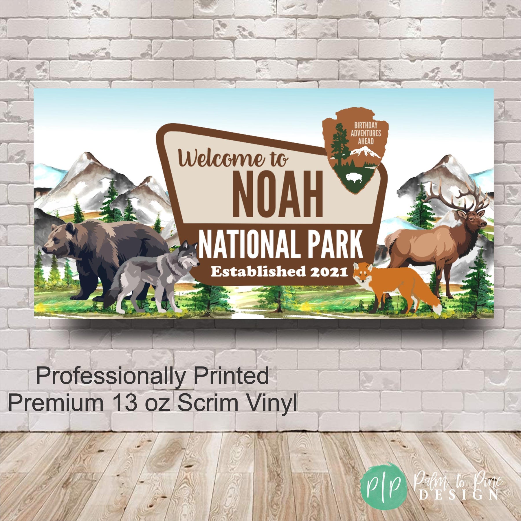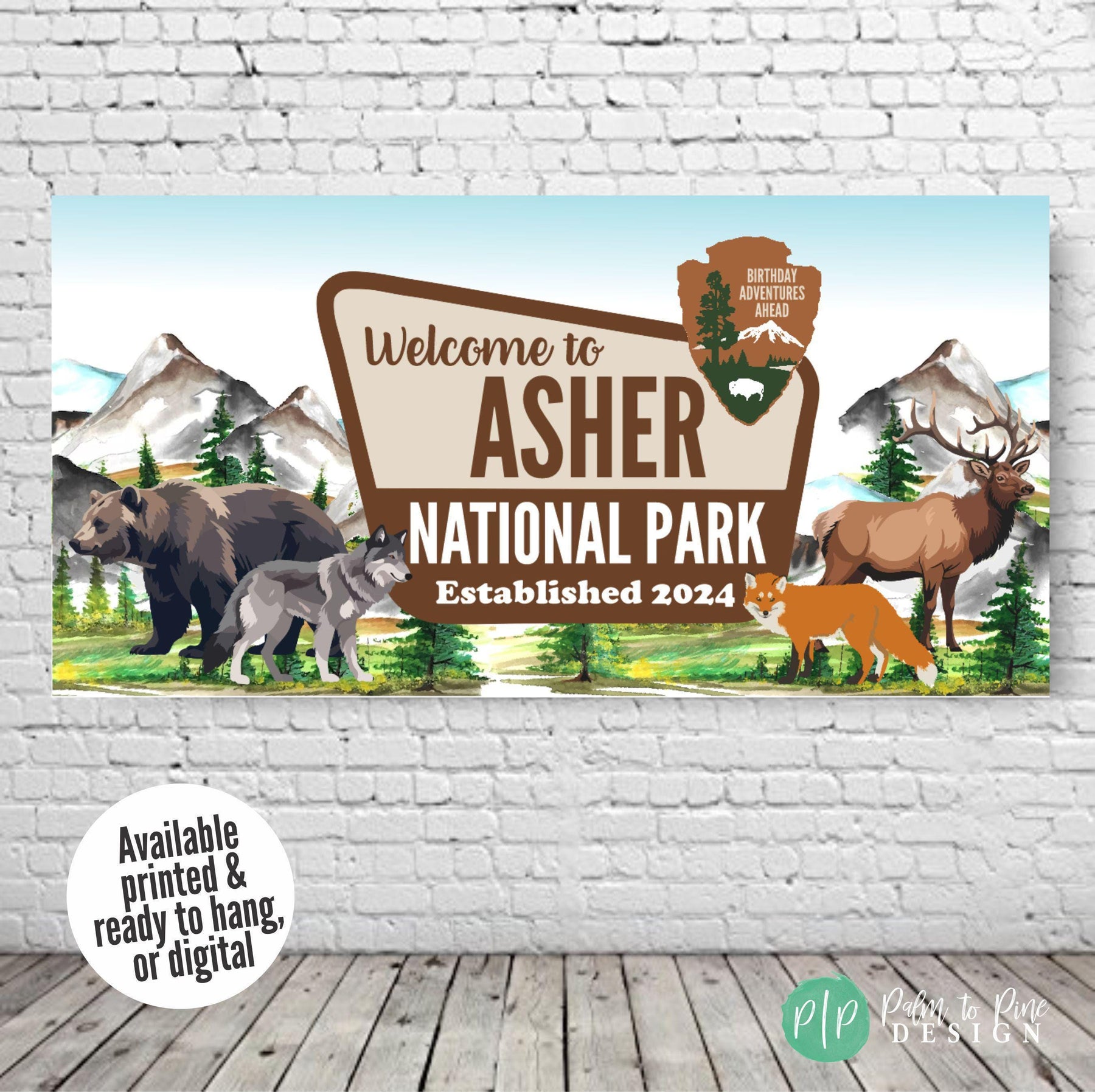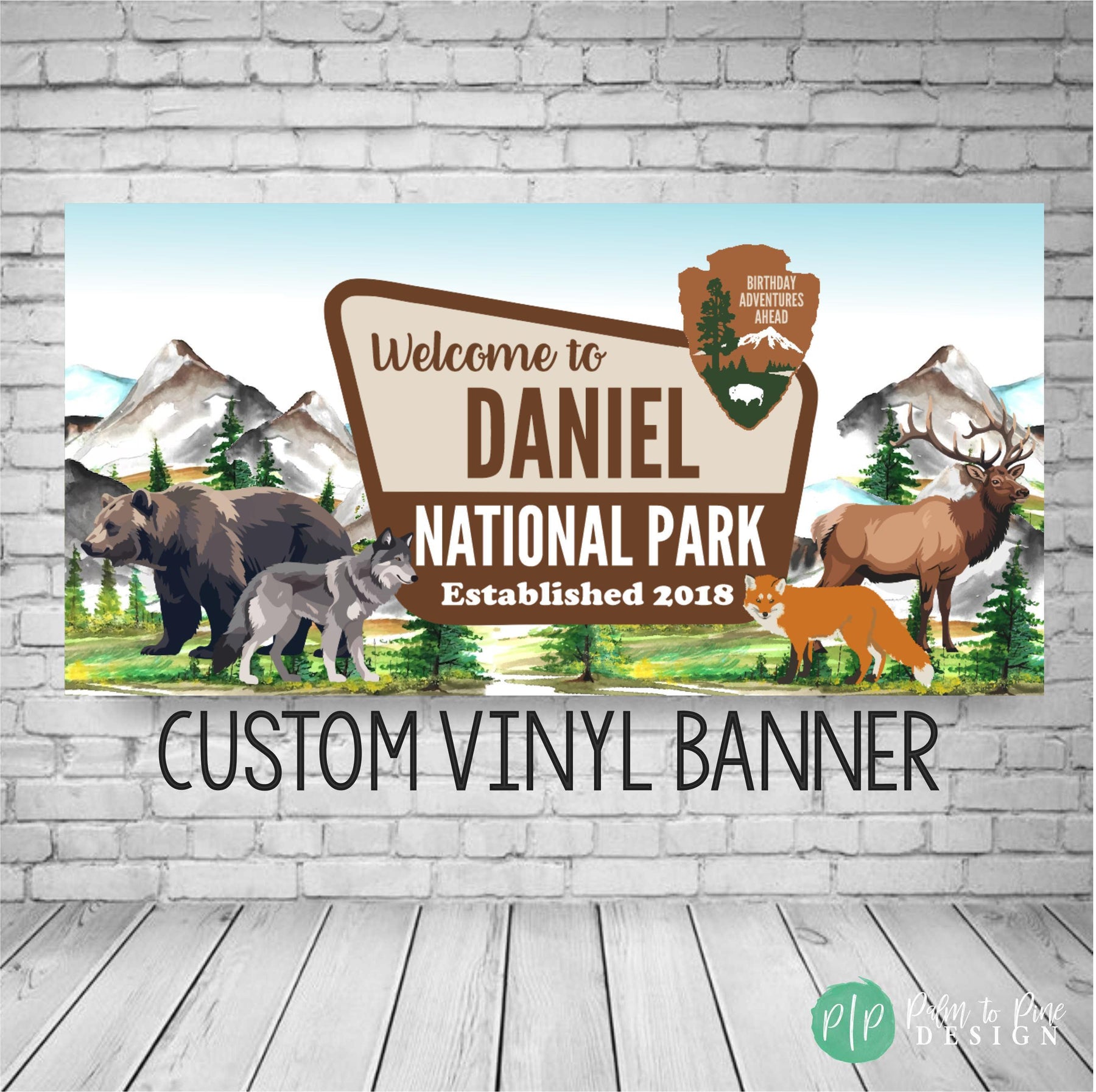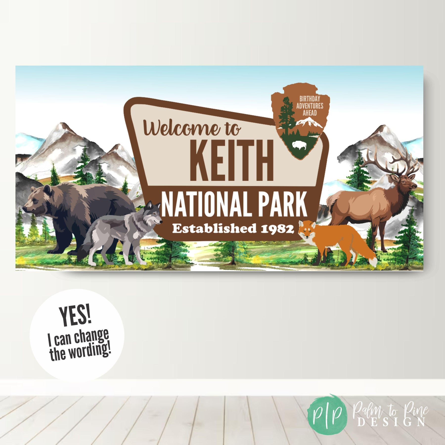 Celebrate at a mountain themed camping birthday with this personalized National Park banner. Transport party guest to the great outdoors for a wilderness inspired celebration. Designed with watercolor mountains, forest scenery, and animal wildlife, this custom banner creates an adventure-ready backdrop that feels both playful and timeless for kids and adults. This personalised vinyl banner is designed to look like an official National Park sign, making it a standout focal point for your celebration! Fully customizable with your name and year, it’s perfect for camping birthdays, woodland baby showers, and outdoor adventure retirement parties.