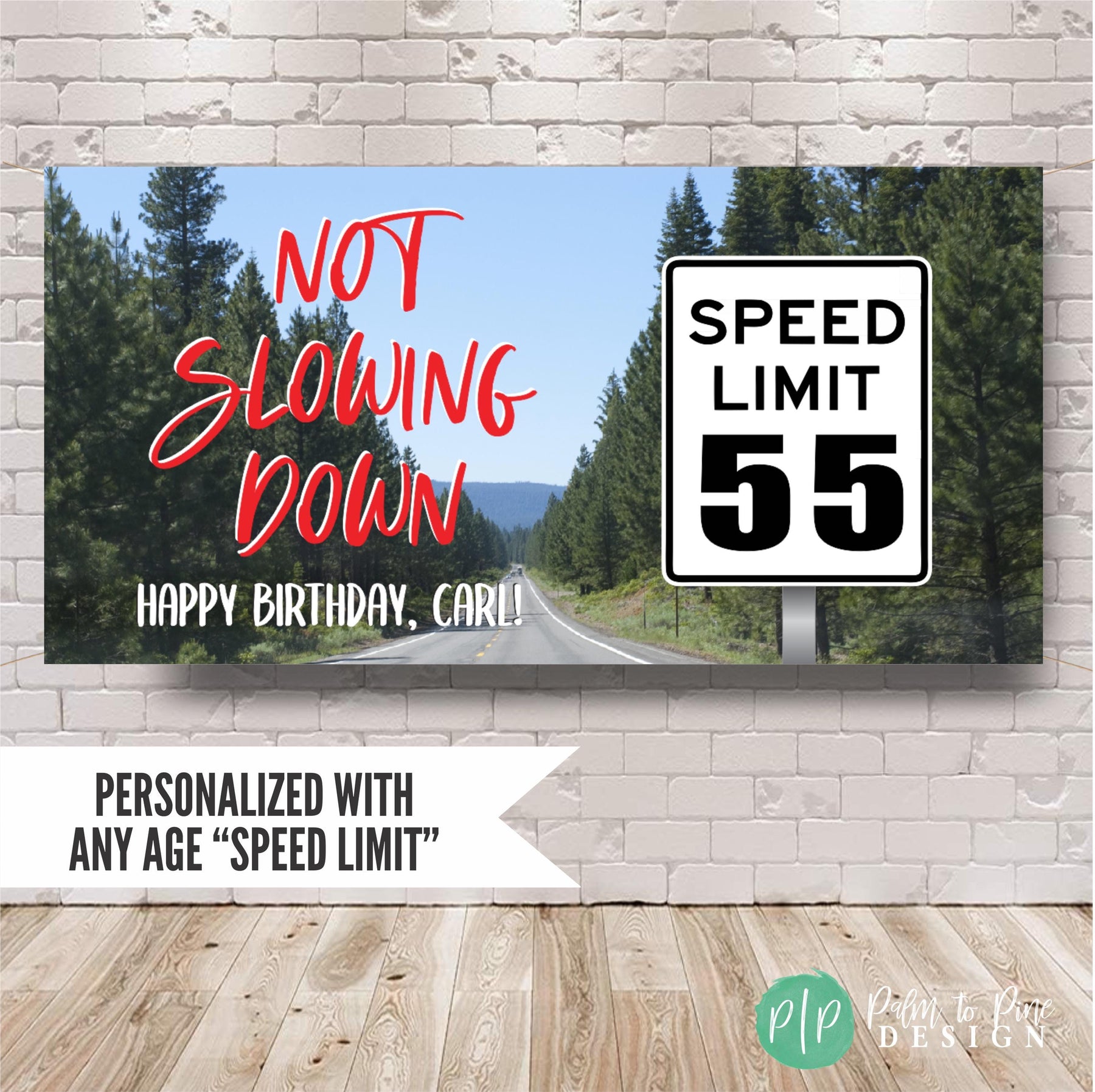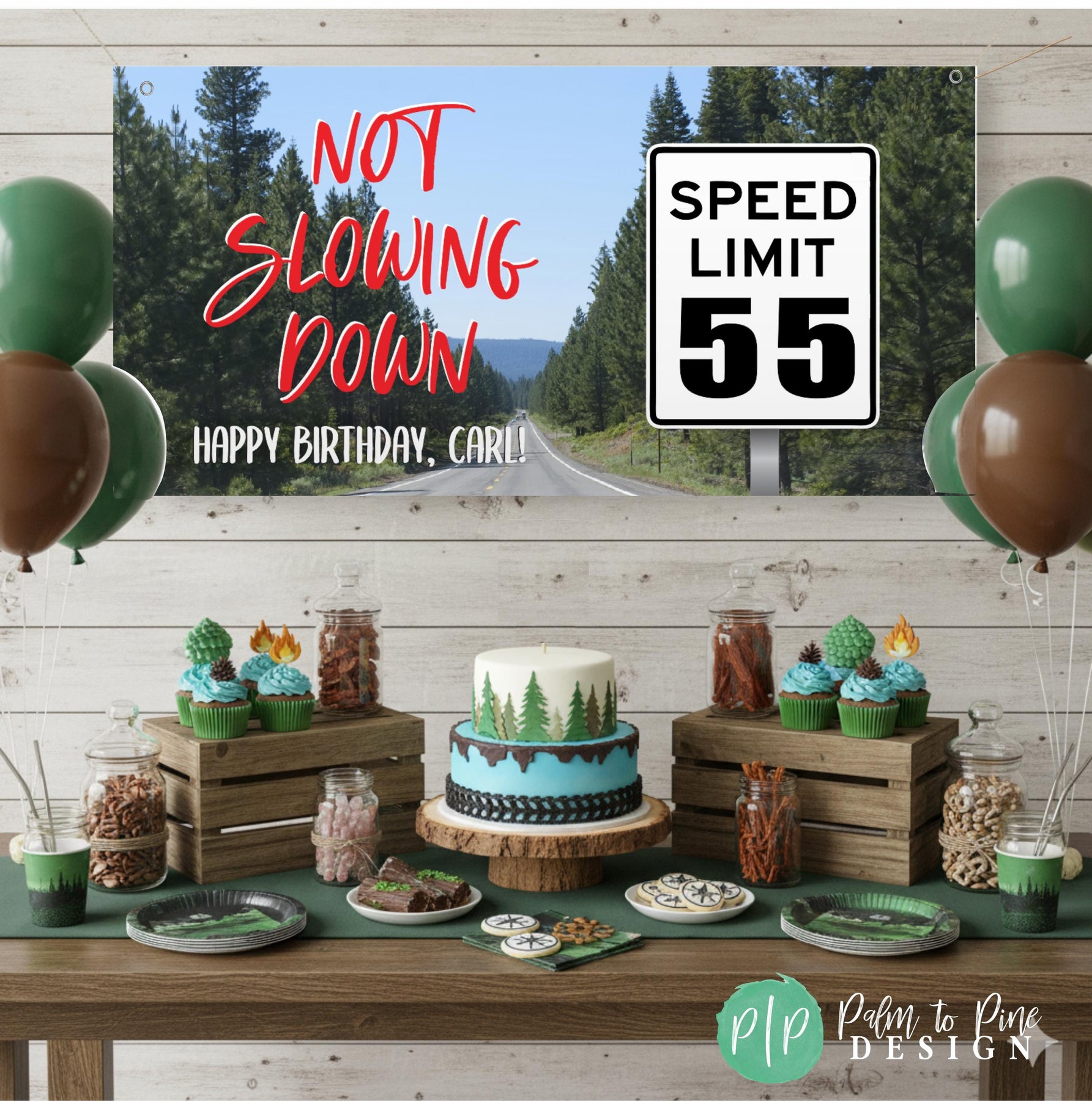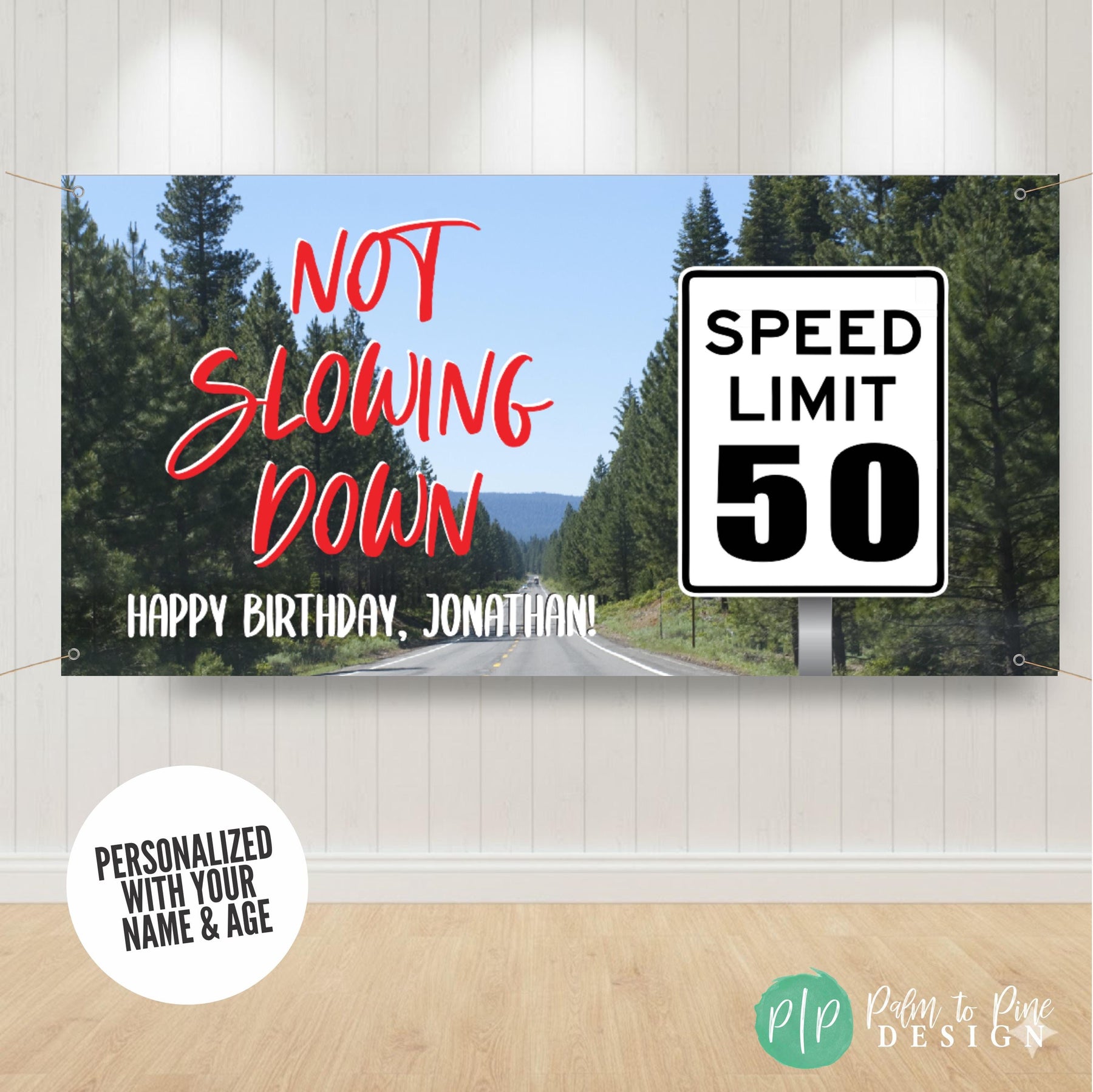 This Speed limit birthday backdrop is designed for men celebrating a milestone birthday with humor and style. This custom road sign inspired banner features the phrase “Not Slowing Down” paired with a personalized speed limit age, making it a fun and memorable backdrop for milestone birthday parties, surprise celebrations, and photo displays.