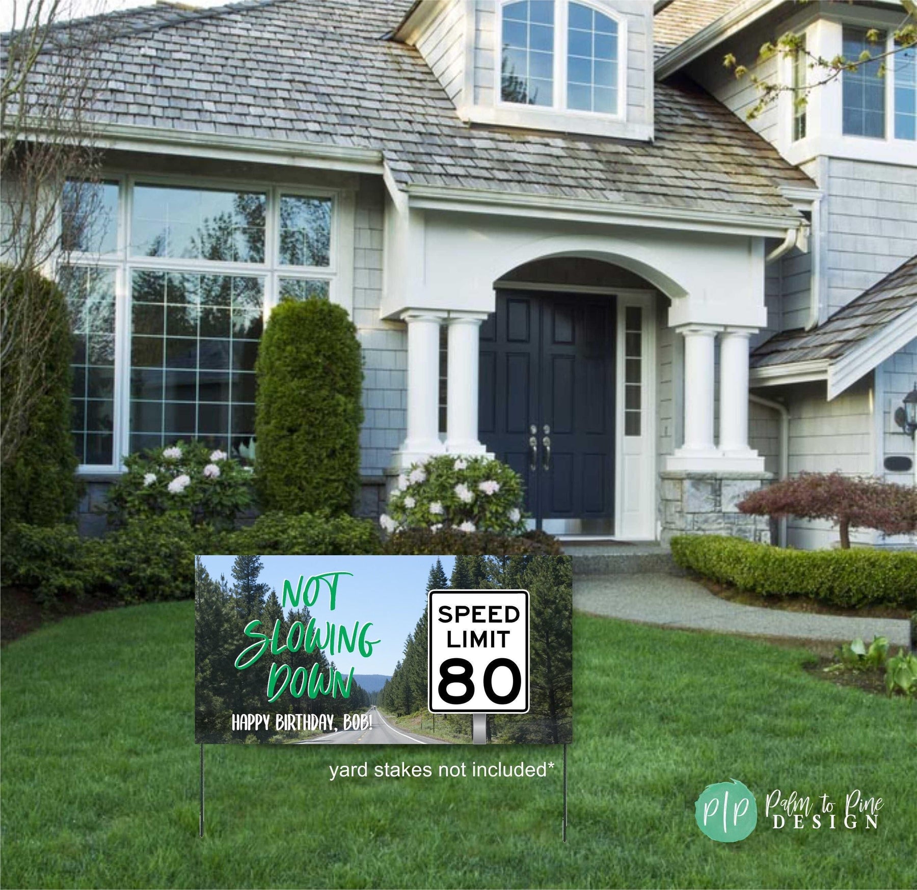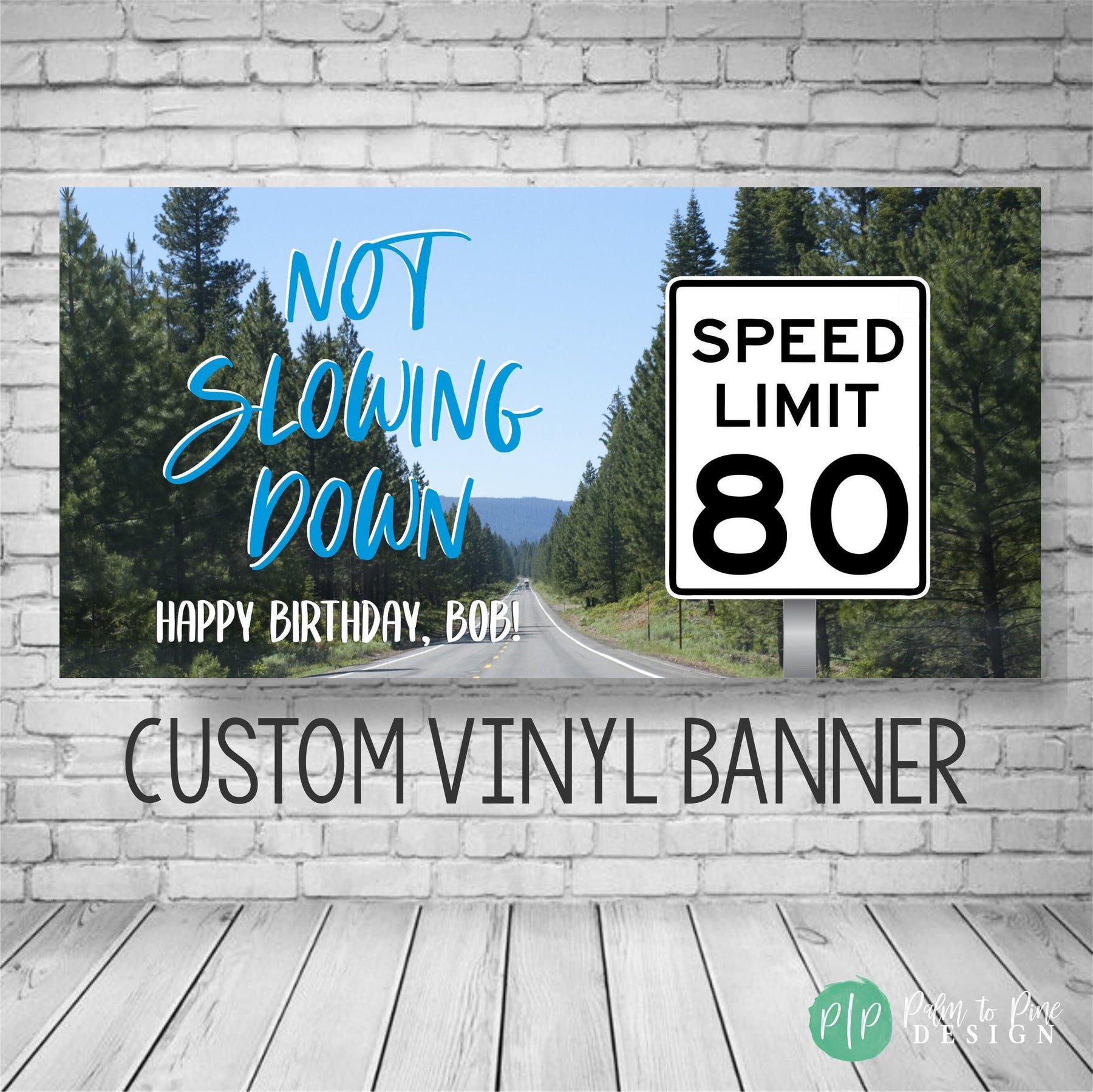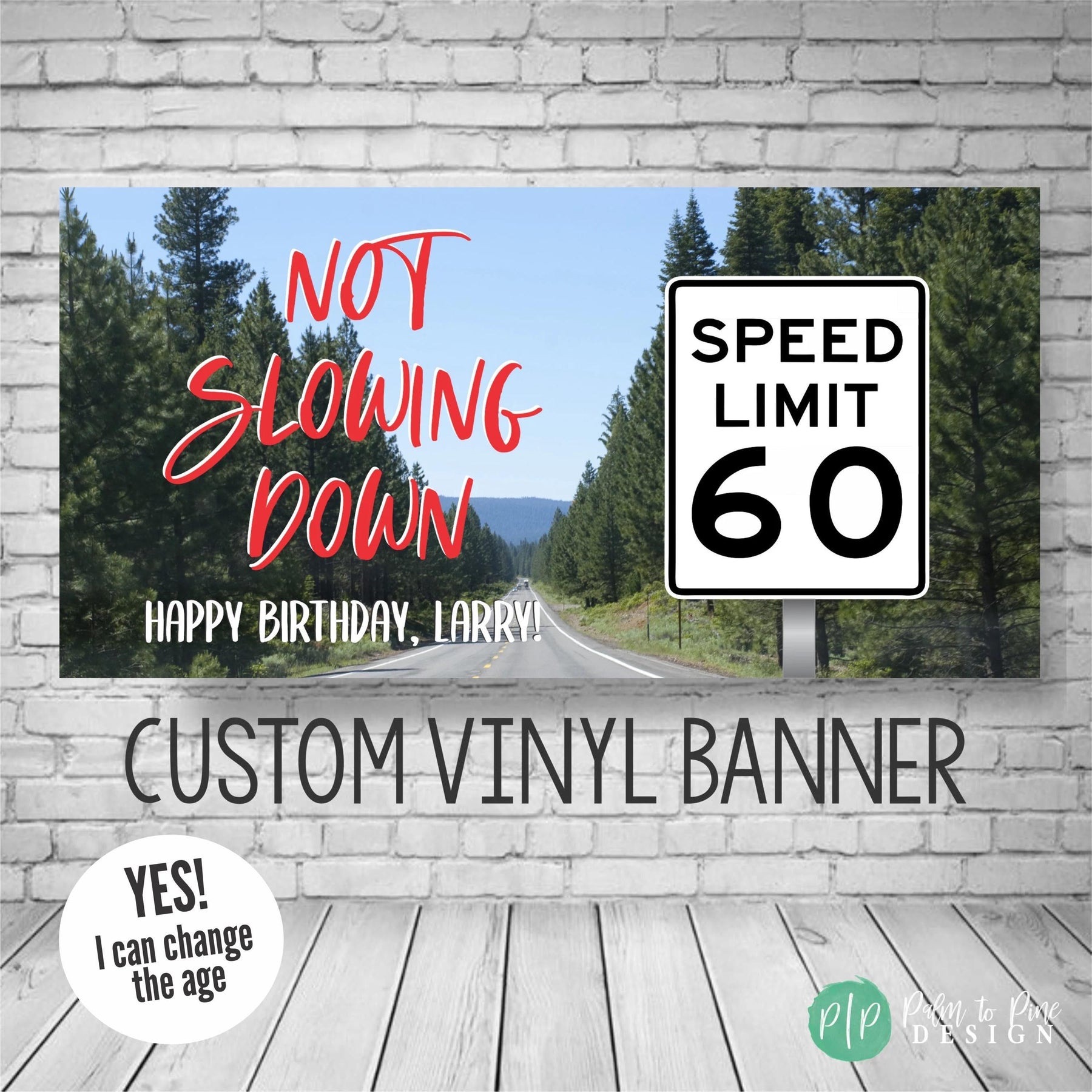 This Speed limit birthday backdrop is designed for men celebrating a milestone birthday with humor and style. This custom road sign inspired banner features the phrase “Not Slowing Down” paired with a personalized speed limit age, making it a fun and memorable backdrop for milestone birthday parties, surprise celebrations, and photo displays.