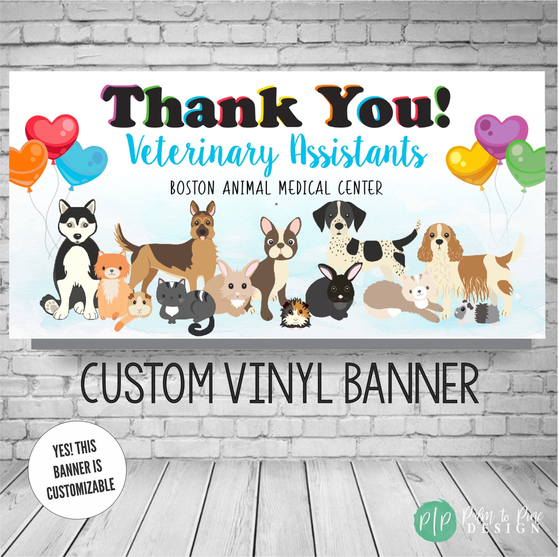 Express your appreciation with our exceptionally made Veterinary Appreciation Banner which can be personalized for any office position like Practice Managers, CSR appreciation, Veterinary Assistants, Vet Techs etc. This high-quality banner is the perfect way to acknowledge the hard work, dedication, and care that they bring to their profession. It's more than just a gift, it is a heartfelt thank you. Crafted from durable material, the vibrant colors of the design are sure to catch everyone's eye and the message of appreciation will resonate with every veterinary technician who sees it. Each banner is easy to hang and built to last, ensuring its presence for years.