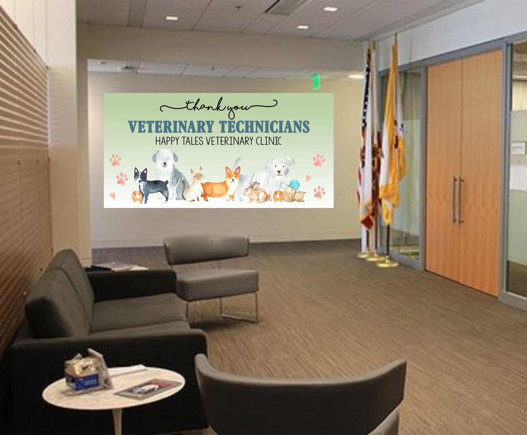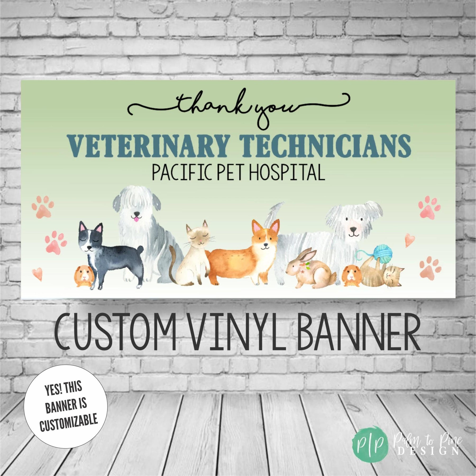 This Veterinary Practice Manager Appreciation Week, Vet Tech week, or vet hospital staff appreciation banner with pet clipart is the perfect way to display your appreciation for Veterinary Techs, Veterinarians, Receptionists and staff providers! This banner is customizable to celebrate the specific pet holiday you are wanting to honor. This sturdy and thick vinyl banner can be used indoors or outdoors and is great in a reception area, breakroom, cafeteria or workspace and can be used year after year in your vet hospital!