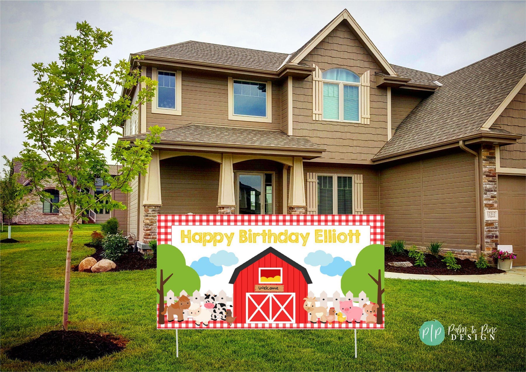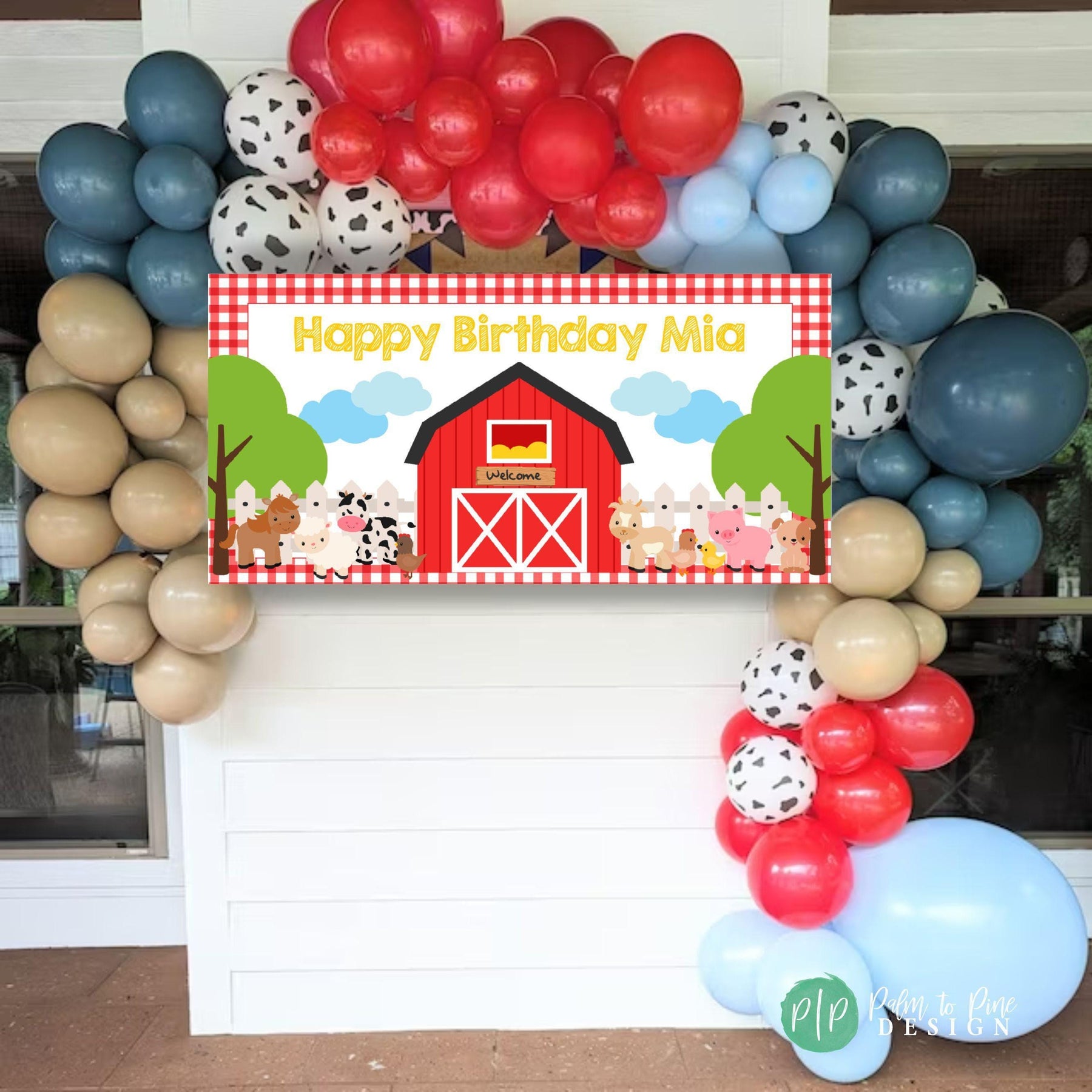 farm birthday welcome banner in front of house, includes cute red barn with farm animal graphics on a gingham background