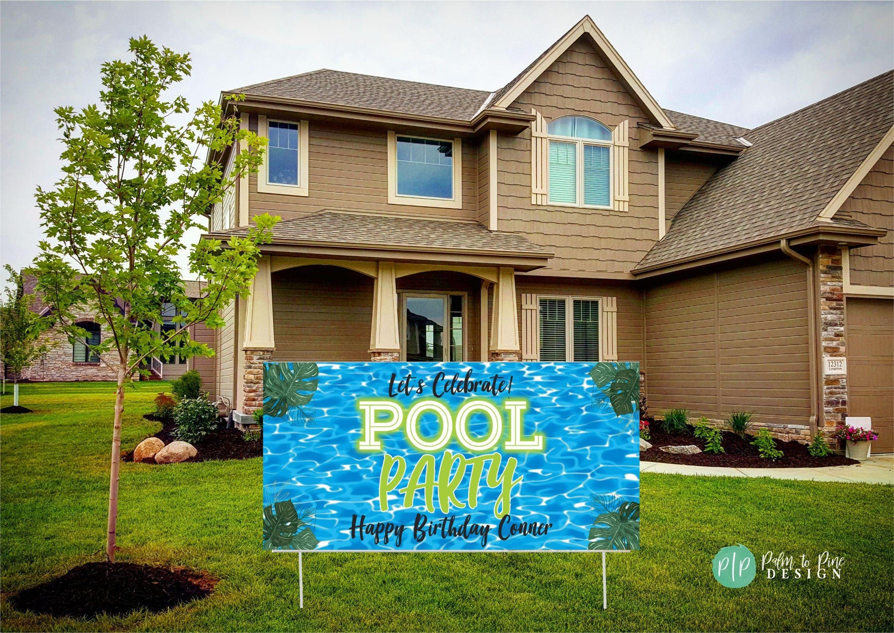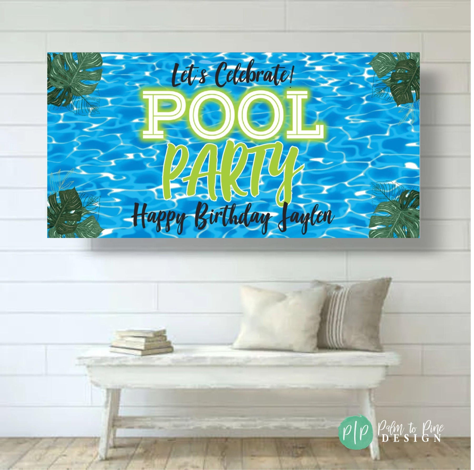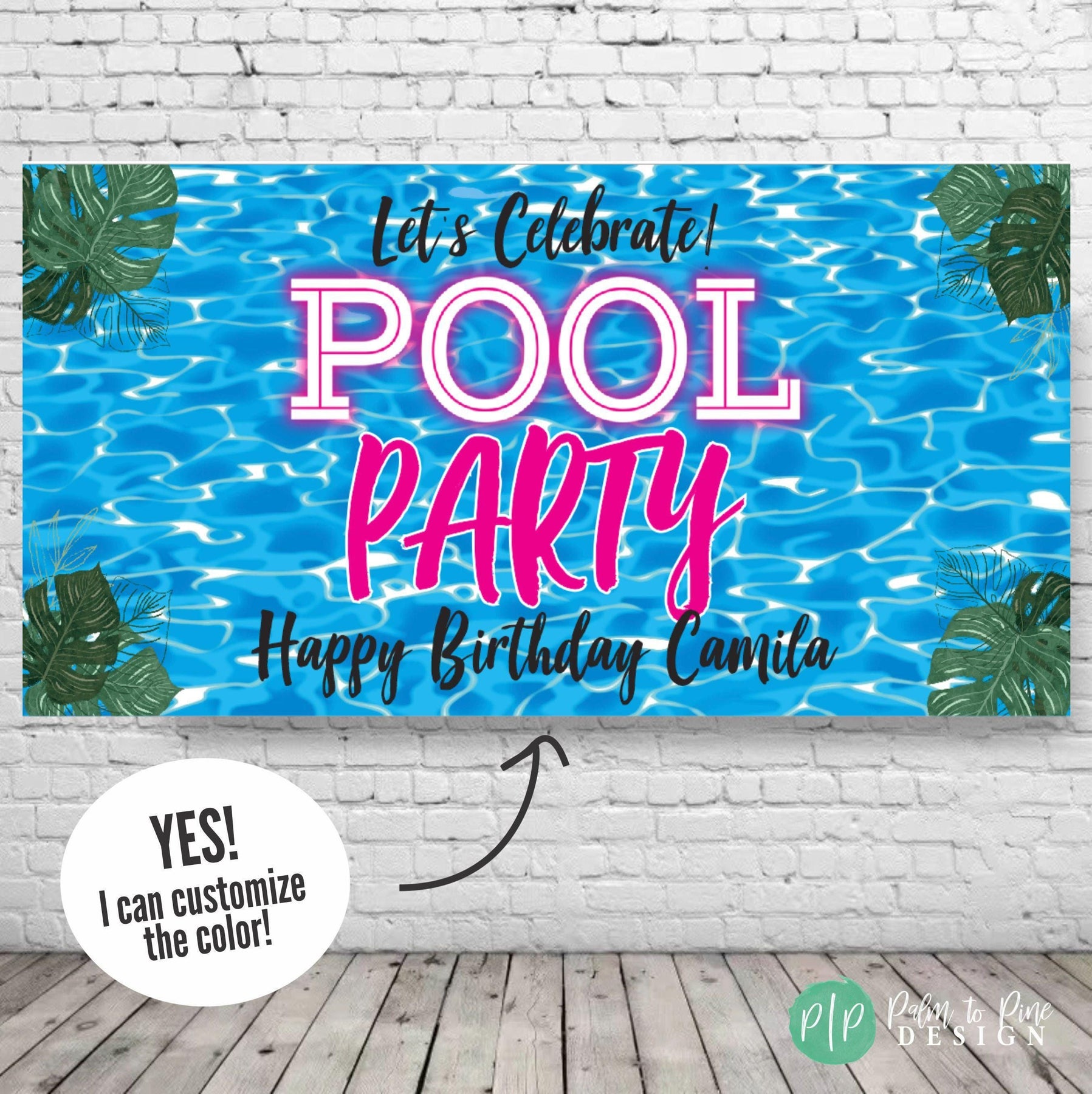 This customizable summer birthday banner is PERFECT for a pool party and great to celebrate a teen or tween birthday! The vibrant "neon lights" colors, palm leaves with the swimming pool water background make the perfect decoration for your splash birthday party. Use this durable waterproof vinyl banner for a outdoor welcome sign at a water or pool birthday, as a photo backdrop for pictures or this vinyl banner makes the perfect decoration for behind a dessert table or as a lawn sign. The colors won't fade in the sun and the banner can be used year after year!