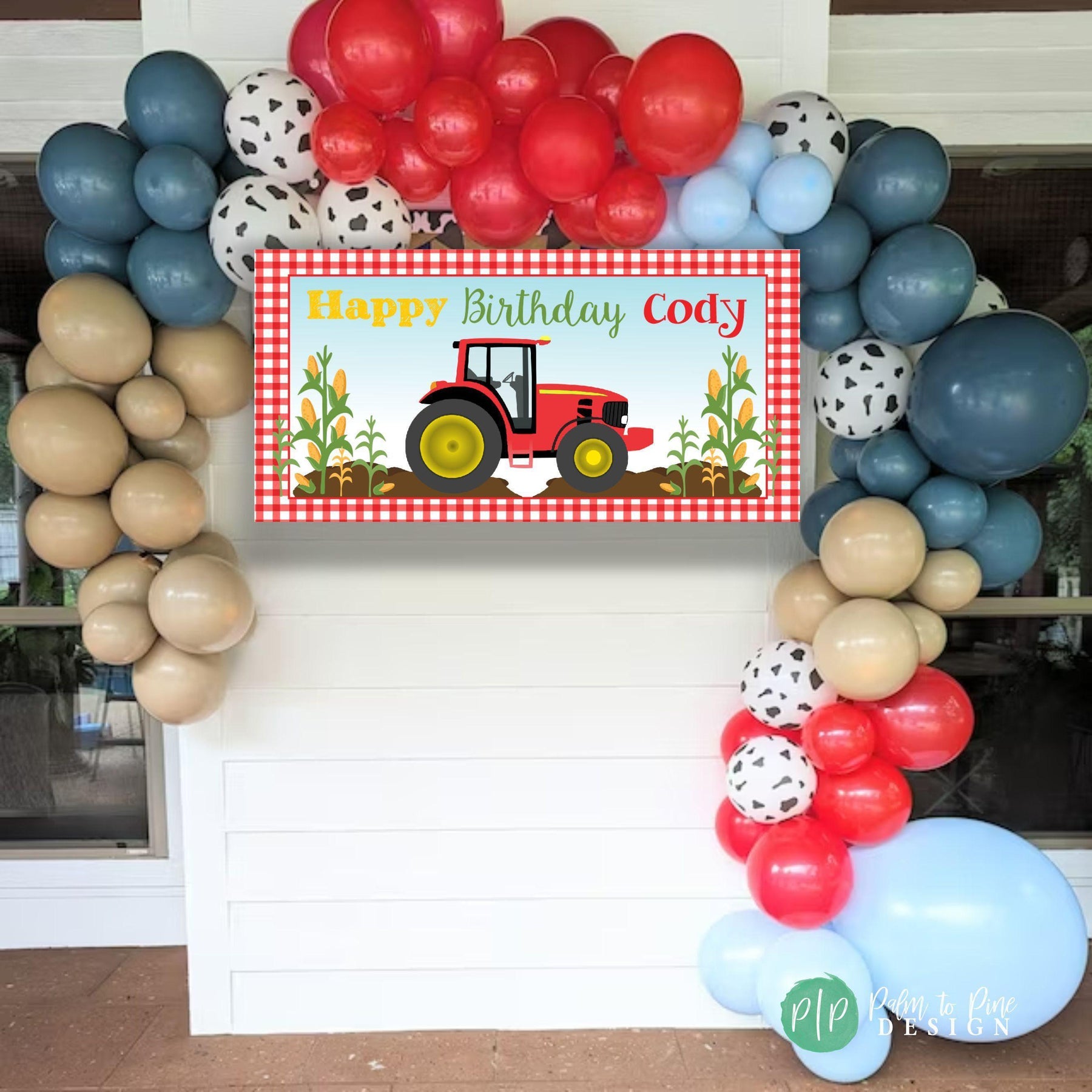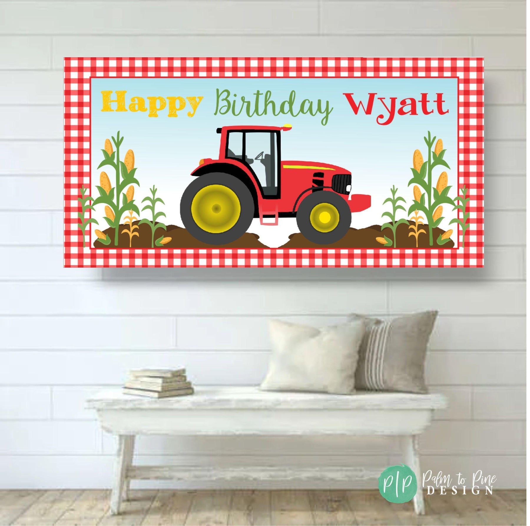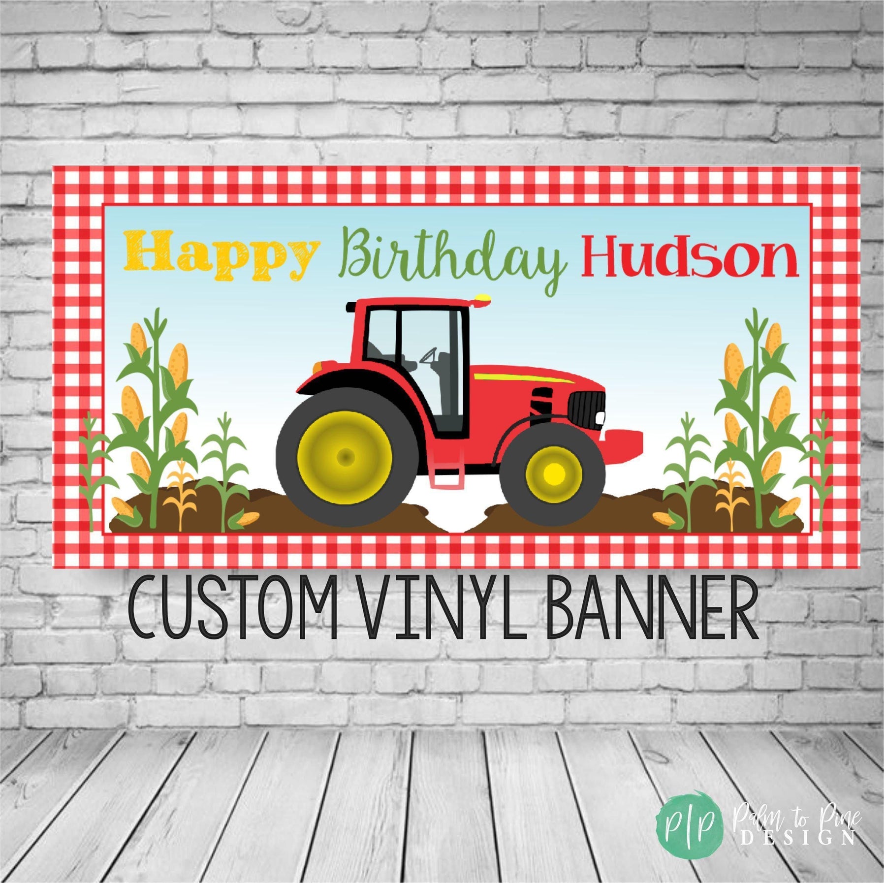 Spice up your farm loving kiddo's special birthday with this vibrant Tractor Birthday banner! Featuring a red gingham border, corn stalks and a red tractor at the center, this banner is the perfect way to welcome guests to the birthday party. Made from high-quality vinyl this handcrafted piece will last for years to come and provide a memorable reminder of an unforgettable day. This sturdy and thick vinyl banner can be used indoors or outdoors and is great above a dessert table, as a welcome banner or outdoors at your Farm Birthday Party!