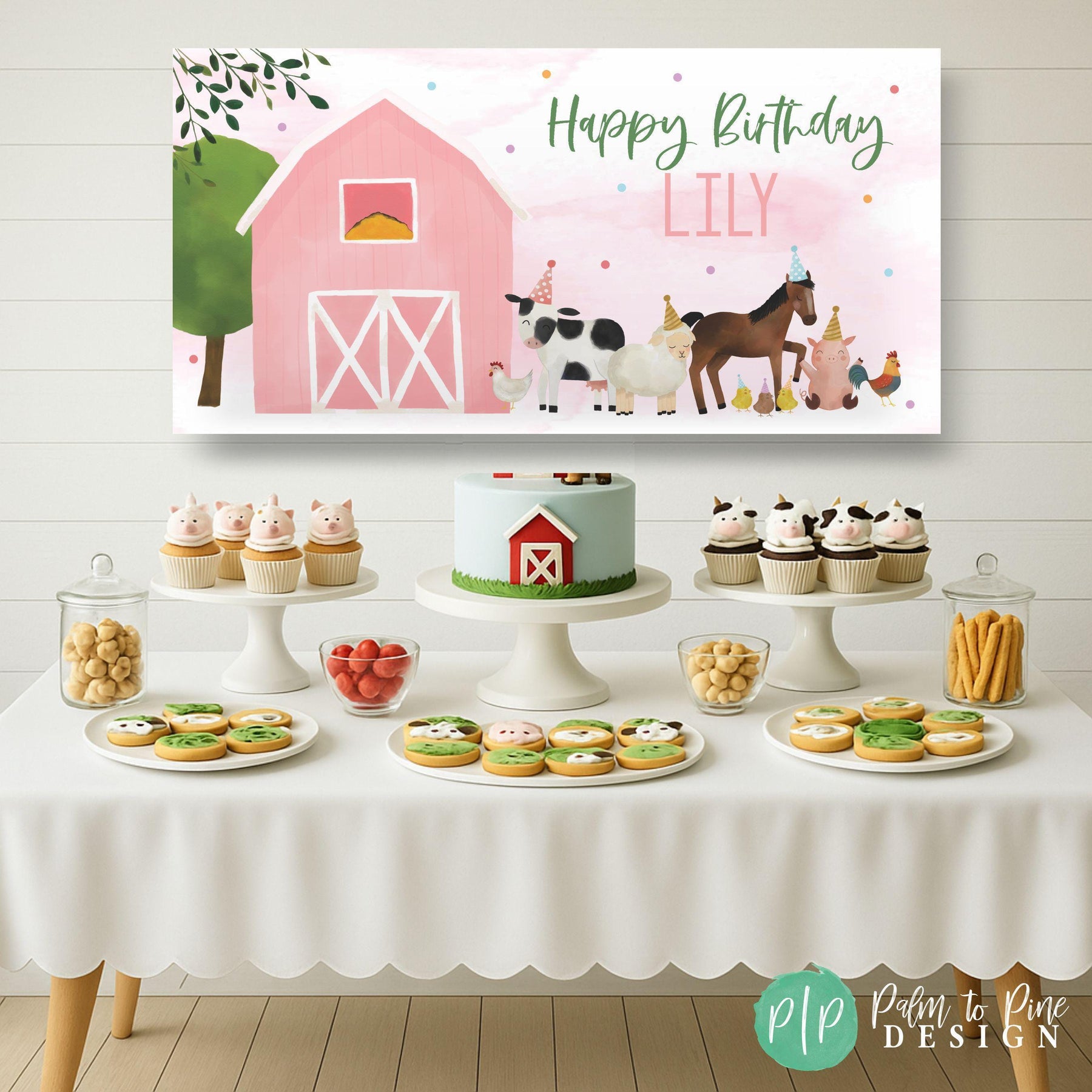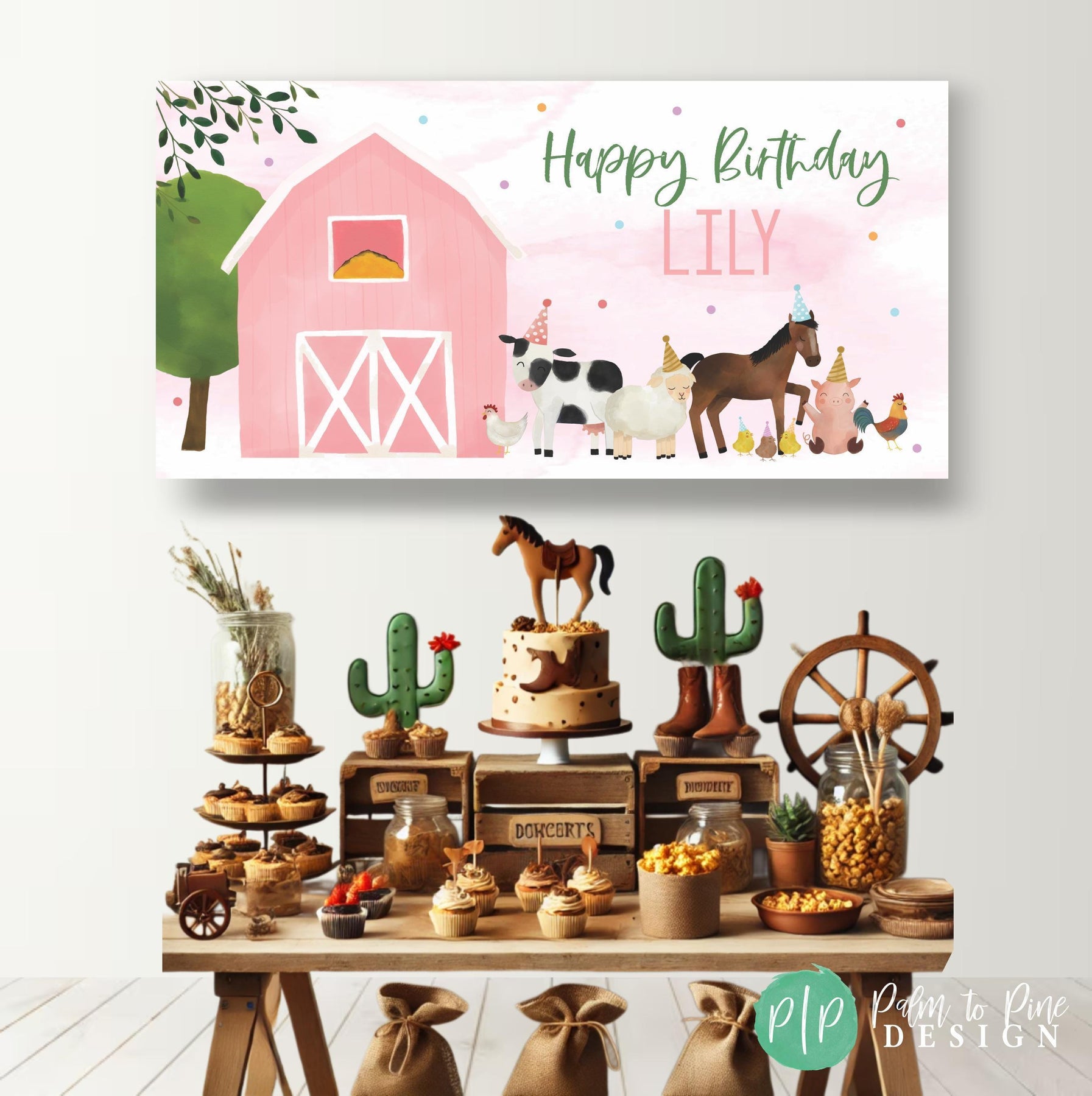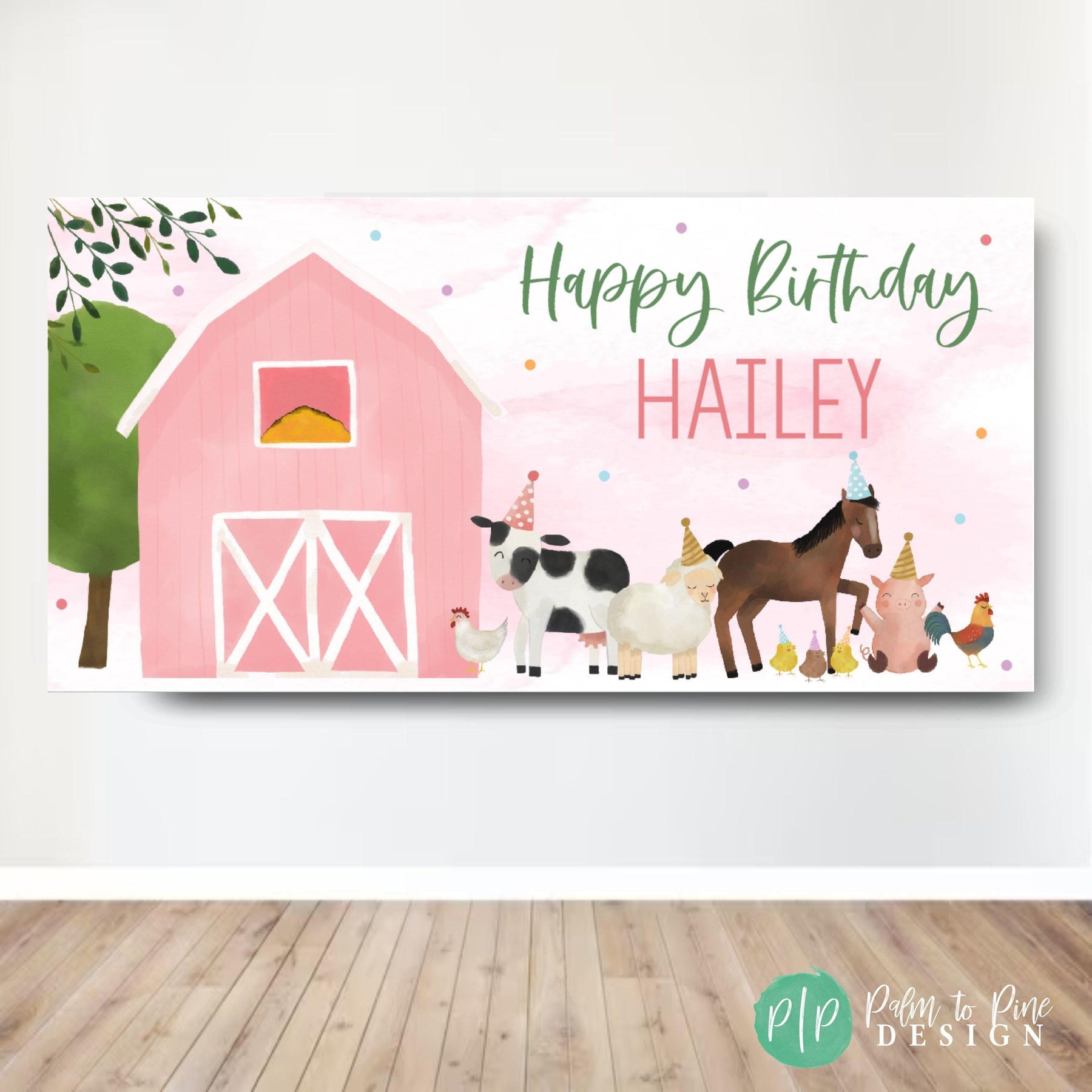 Oink, Cluck, Baa Moo, our Pink Barn Farm Birthday Banner is perfect to celebrate your little girl or boys birthday party with a farm party animal theme. This personalized birthday banner is perfect for adding a special touch to a little girl's farm-themed party. Crafted with attention to detail, the design features cute watercolor farm animal designs that are sure to catch the eye and light up any room, petting zoo or backyard. The banner is made from durable vinyl material, making it suitable for both indoor and outdoor use. To make your celebration even more unique, the banner can be personalized to honor the birthday girl. The Pink Barn Farm Birthday Banner truly encompasses joy, fun, and a spirit of celebration, perfectly capturing the essence of a little girl's dream farm party.