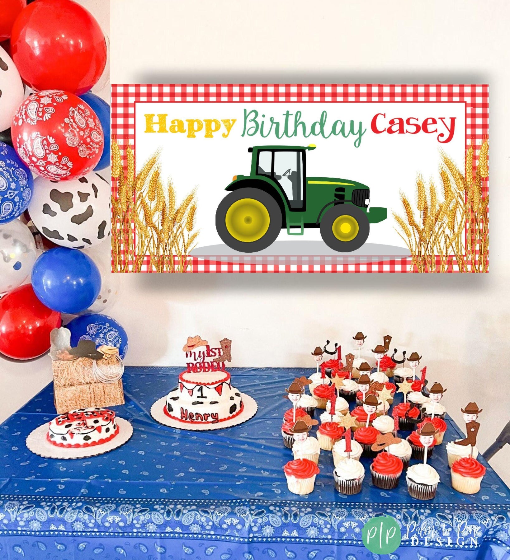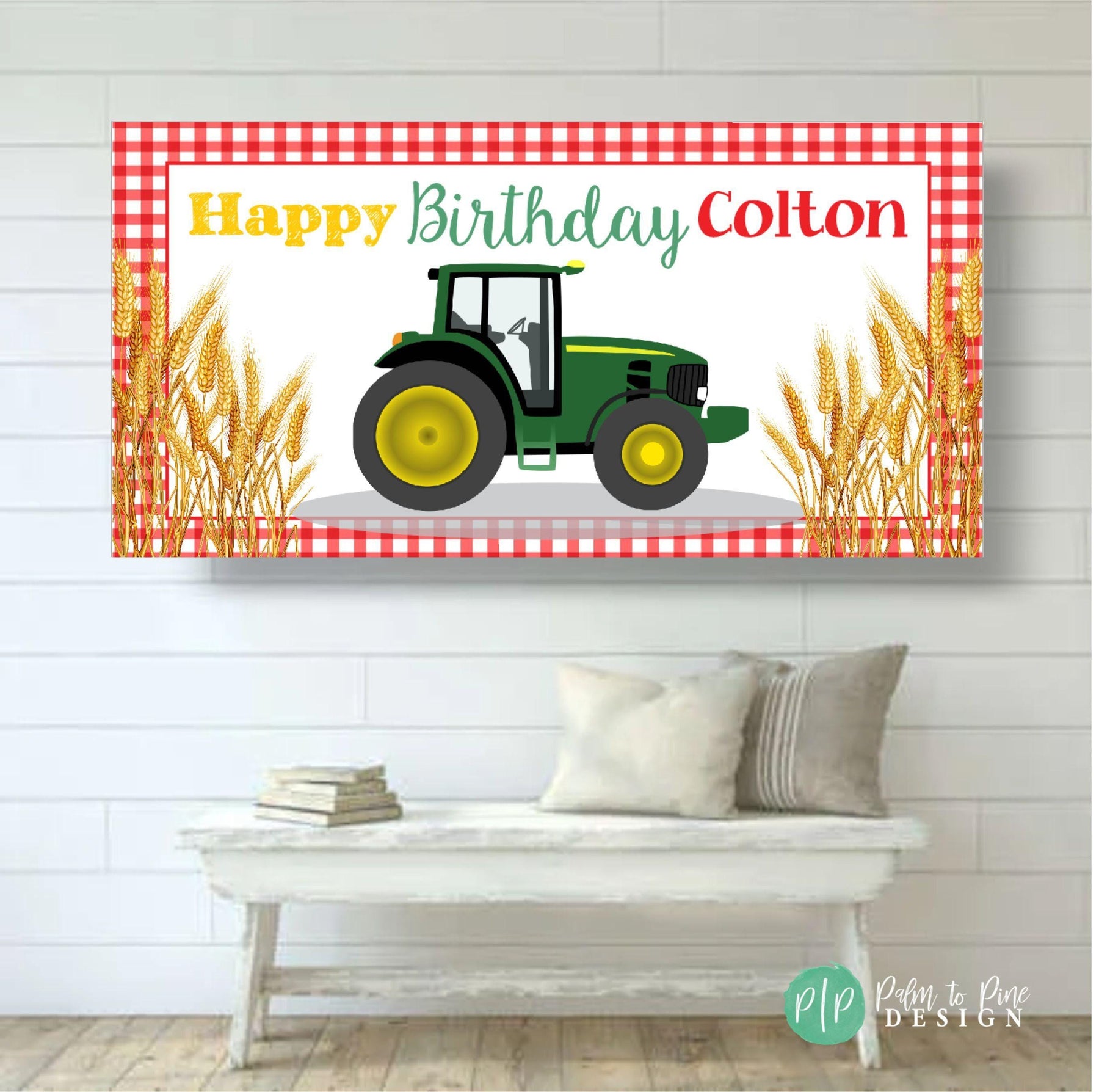 Celebrate your farm loving kiddo's special birthday with this personalized Tractor Birthday banner! 🚜🌾 Featuring a red gingham border, tractor and stalks of wheat (or corn or other crop) this banner is the perfect way to welcome guests to the birthday party. Made from high-quality vinyl and professionally printed, this kids birthday decoration will last for years to come and can be used indoors or outdoors. Use your custom barnyard birthday banner behind a dessert table, as a welcome banner or outdoors at your Farm Birthday Party!
