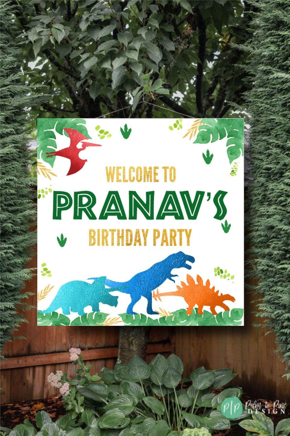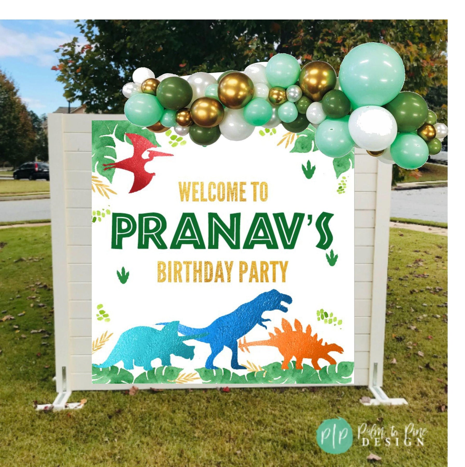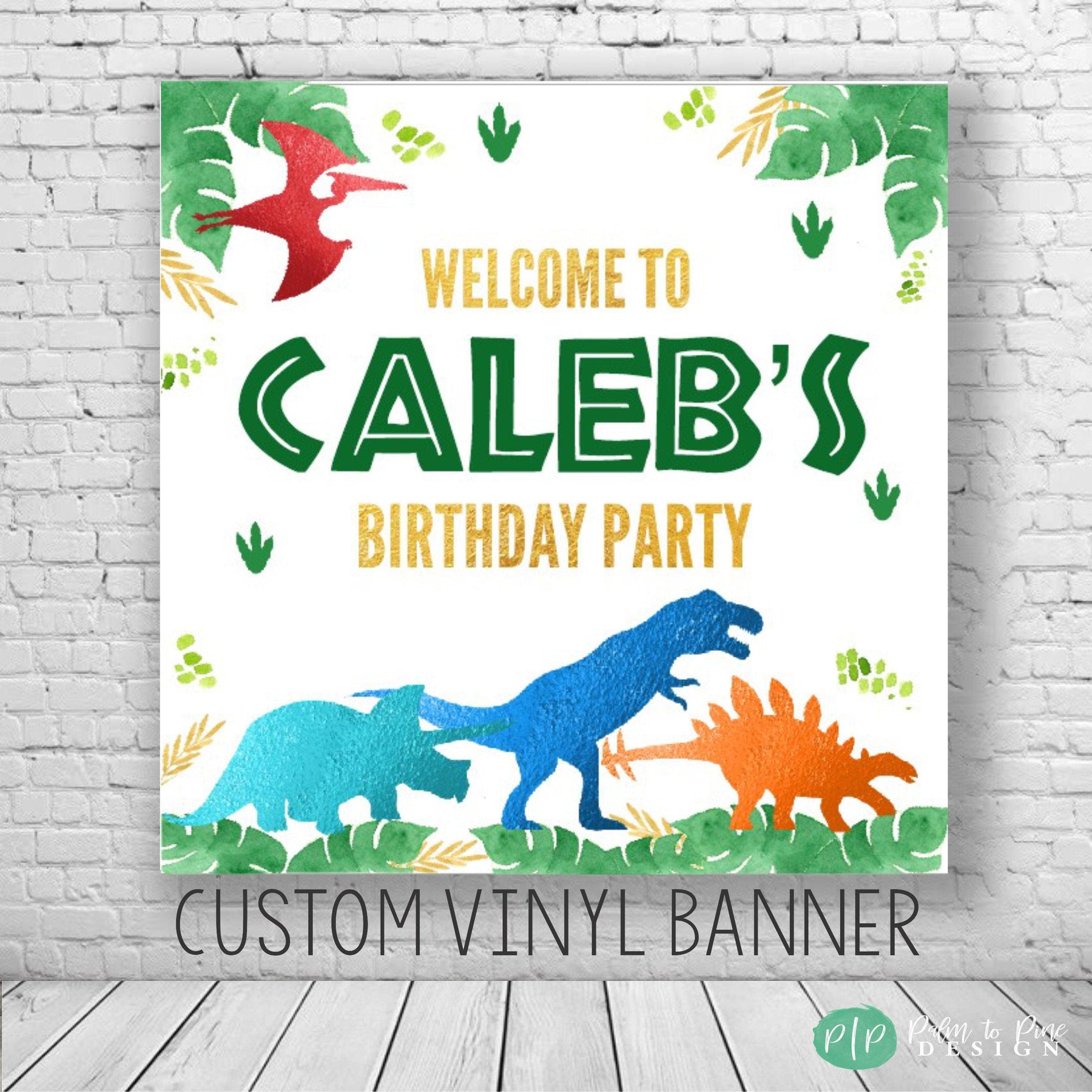 This dinosaur birthday backdrop banner is perfect for your dino lover's birthday party. The T-Rex and dinos with palm leaves are the perfect personalized decoration for your boys or girls birthday party. Use this high quality vinyl banner as a step and repeat banner on a banner stand (not included), or for an indoor or outdoor birthday backdrop at a dinosaur party. This vinyl banner makes the perfect decoration for behind a dessert table or as a lawn sign. The colors won't fade in the sun and the banner can be hung in your little boys bedroom after the party is over!