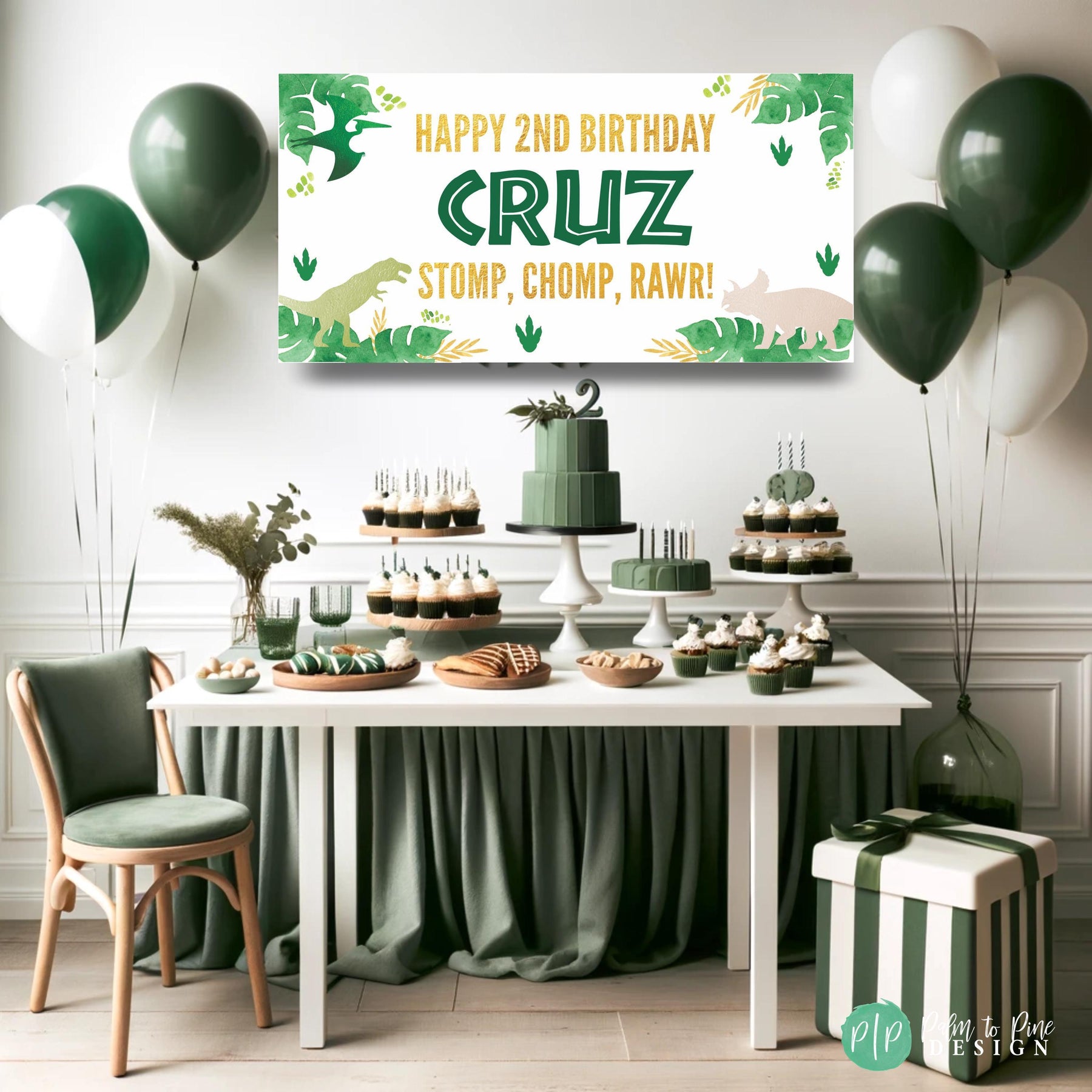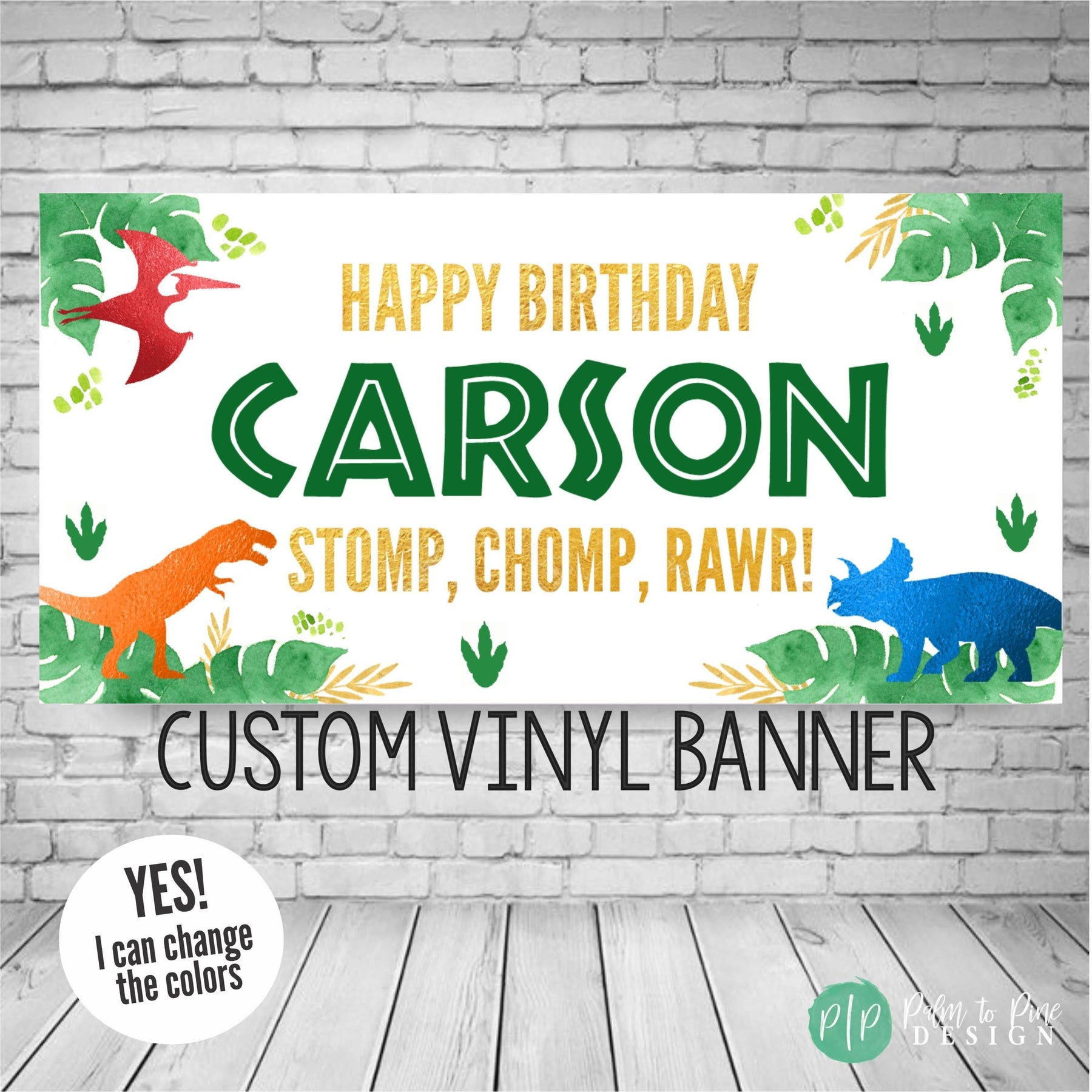 This blue, orange, red, green and gold dinosaur birthday banner is perfect for a little boy, little girl or twins birthday party for your dinosaur obsessed kid's birthday party. The colors can also be changed to match your party decor! The Stomp, Chomp & Rawr Dinosaur banner makes the perfect decoration for your dino birthday party for a boy or girl and the modern and bold green, faux gold and colorful dinosaurs make a statement for any dino birthday party.