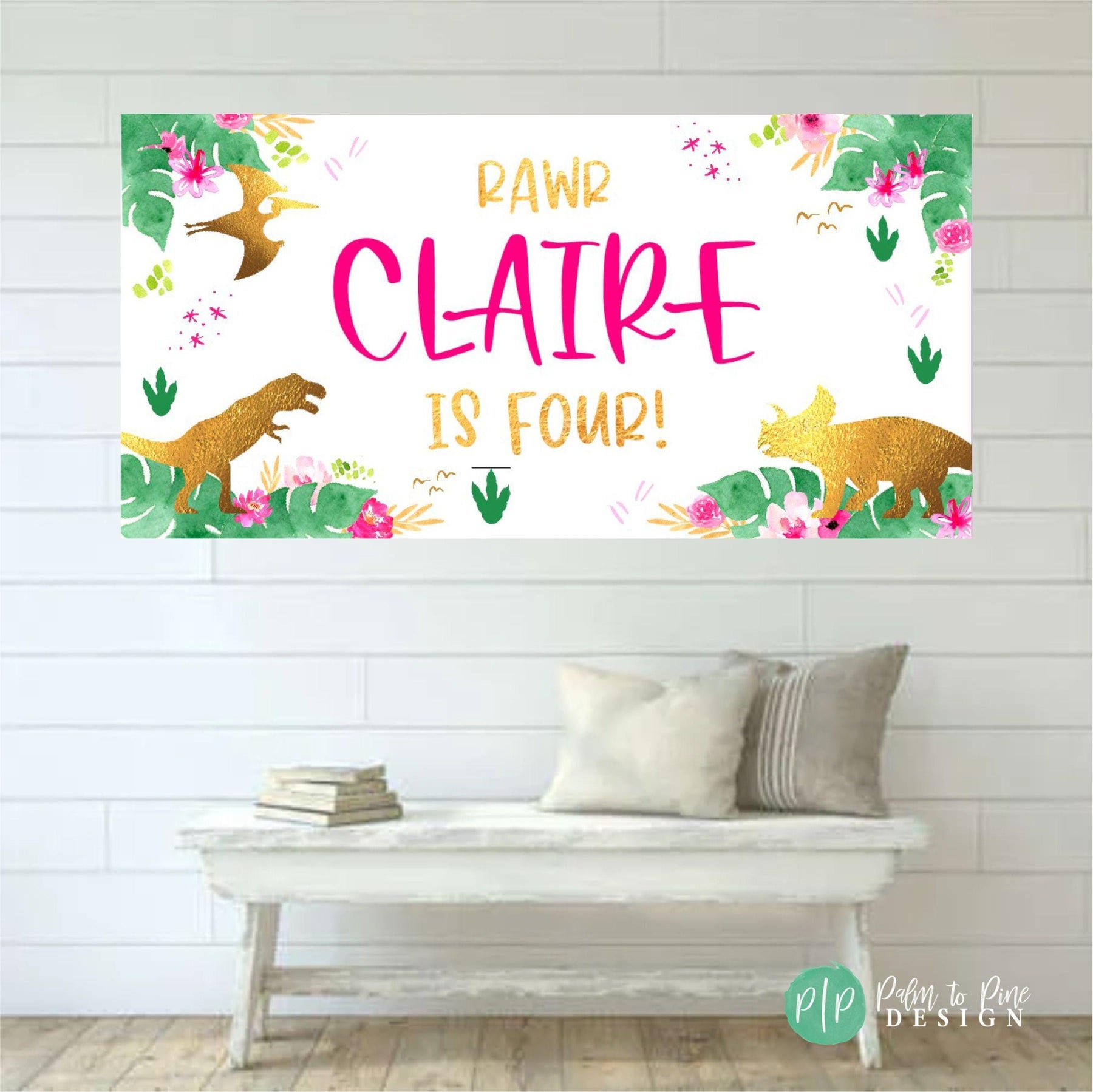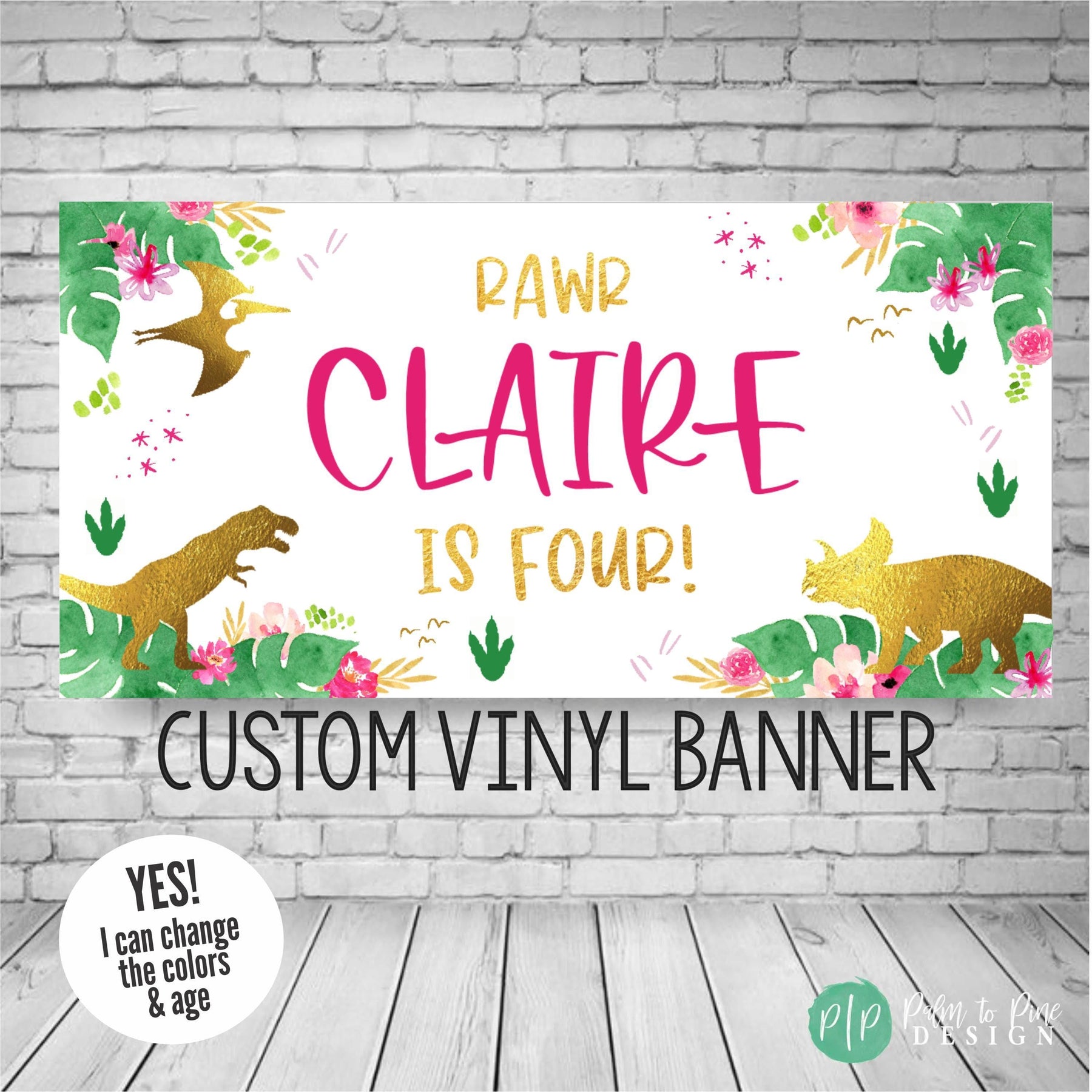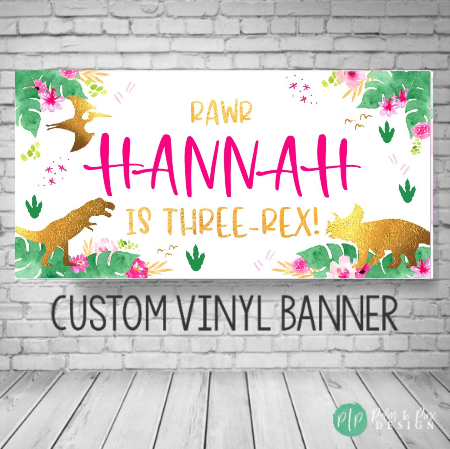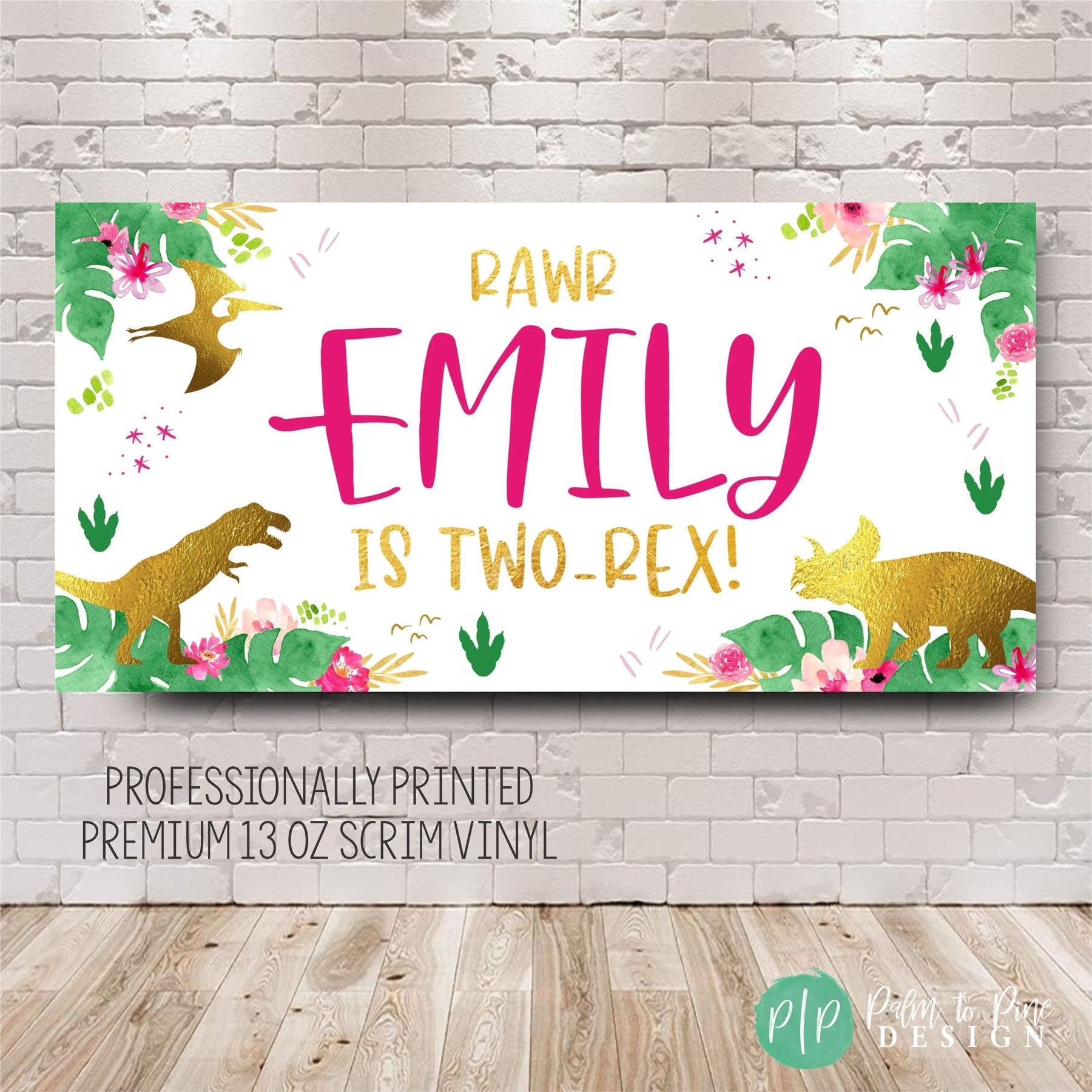 This cute pink and gold dinosaur birthday banner is perfect to celebrate your little dinosaur lover at her birthday party! The colors and wording on this girls dino birthday banner can be changed for any age or occasion too. This banner makes the perfect decoration behind a dessert table, or as a welcome sign for your dinosaur birthday party for your little one! This durable and high quality personalized birthday banner is professionally printed on 13 oz scrim vinyl, or can be sent digitally too for you to print locally.