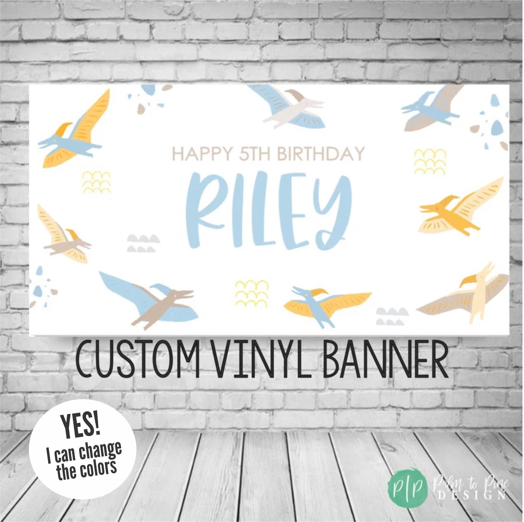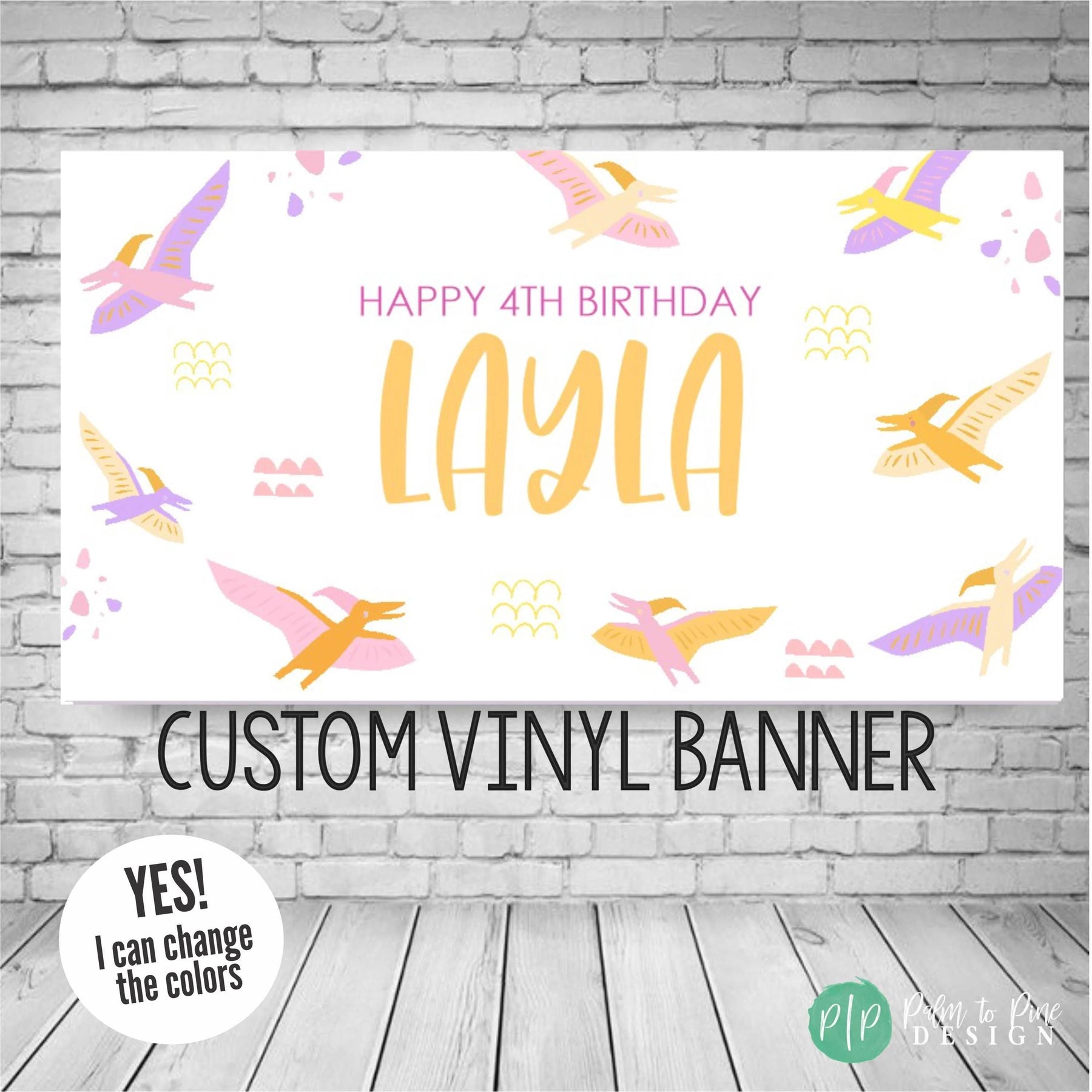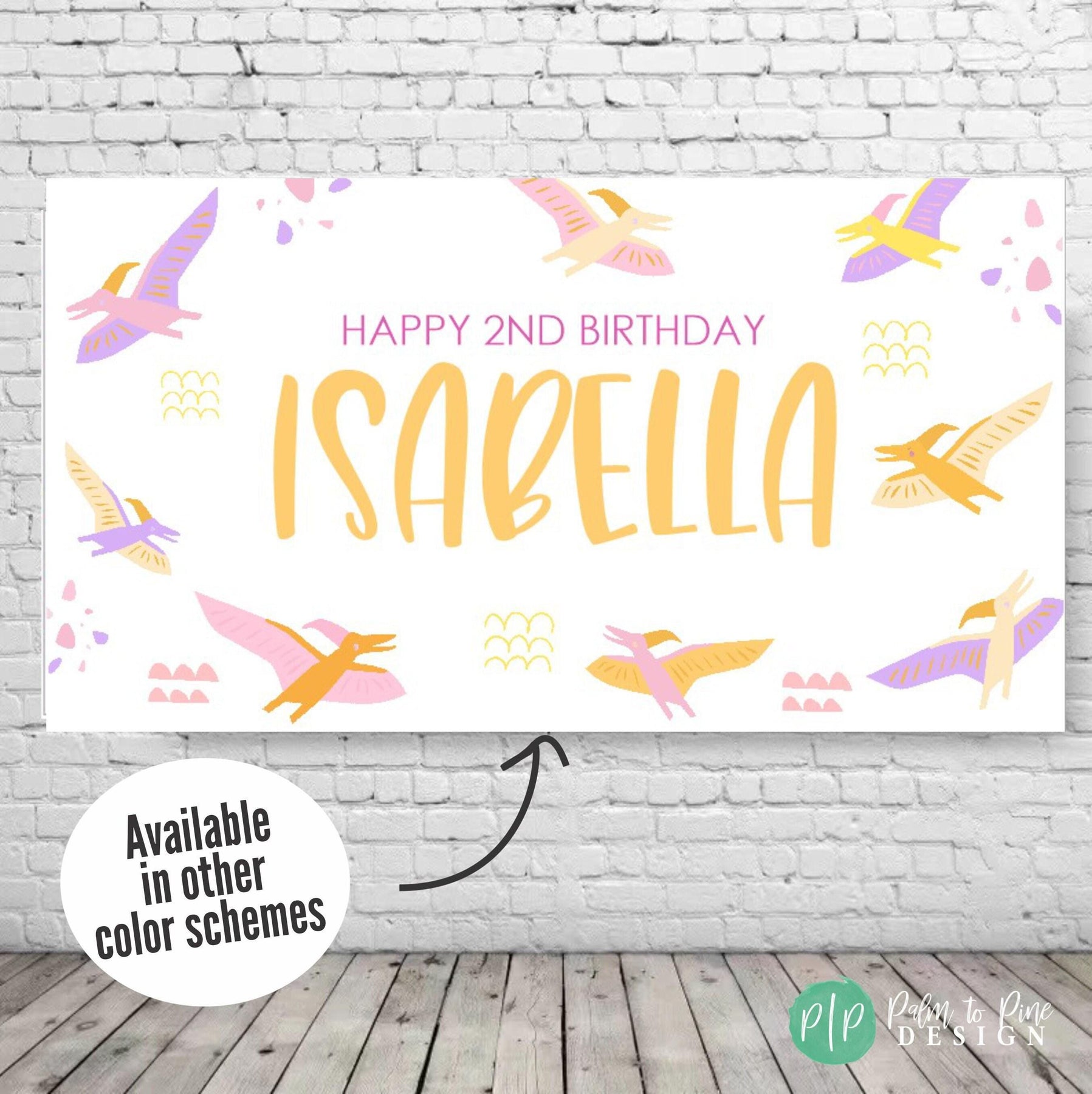 This cute pterodactyl birthday banner is perfect for a little girl or twins dinosaur obsessed birthday party. The pterodactyl banner makes the perfect decoration for your dino birthday party for a boy or girl! Use this durable vinyl banner for a outdoor welcome sign at a Dinosaur birthday, as a photo backdrop for pictures or this vinyl banner makes the perfect decoration for behind a dessert table at a Dino party, even display this durable banner in the yard for a happy birthday yard banner.
