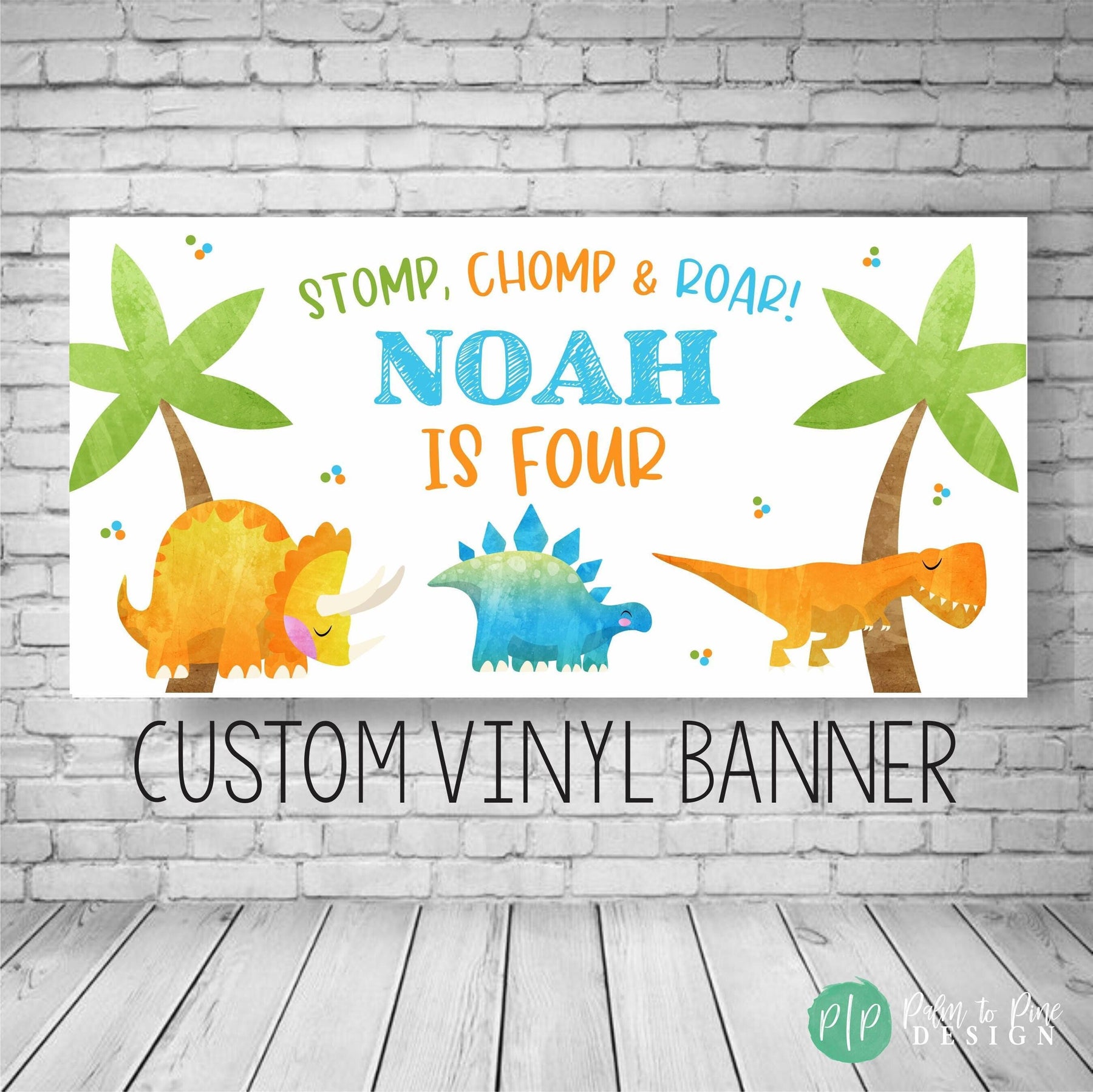 Use this durable vinyl banner for a outdoor welcome sign at a Dinosaur birthday, as a photo backdrop for pictures or this vinyl banner makes the perfect decoration for behind a dessert table at a Dino party, even display this durable banner in the yard for a happy birthday yard banner.