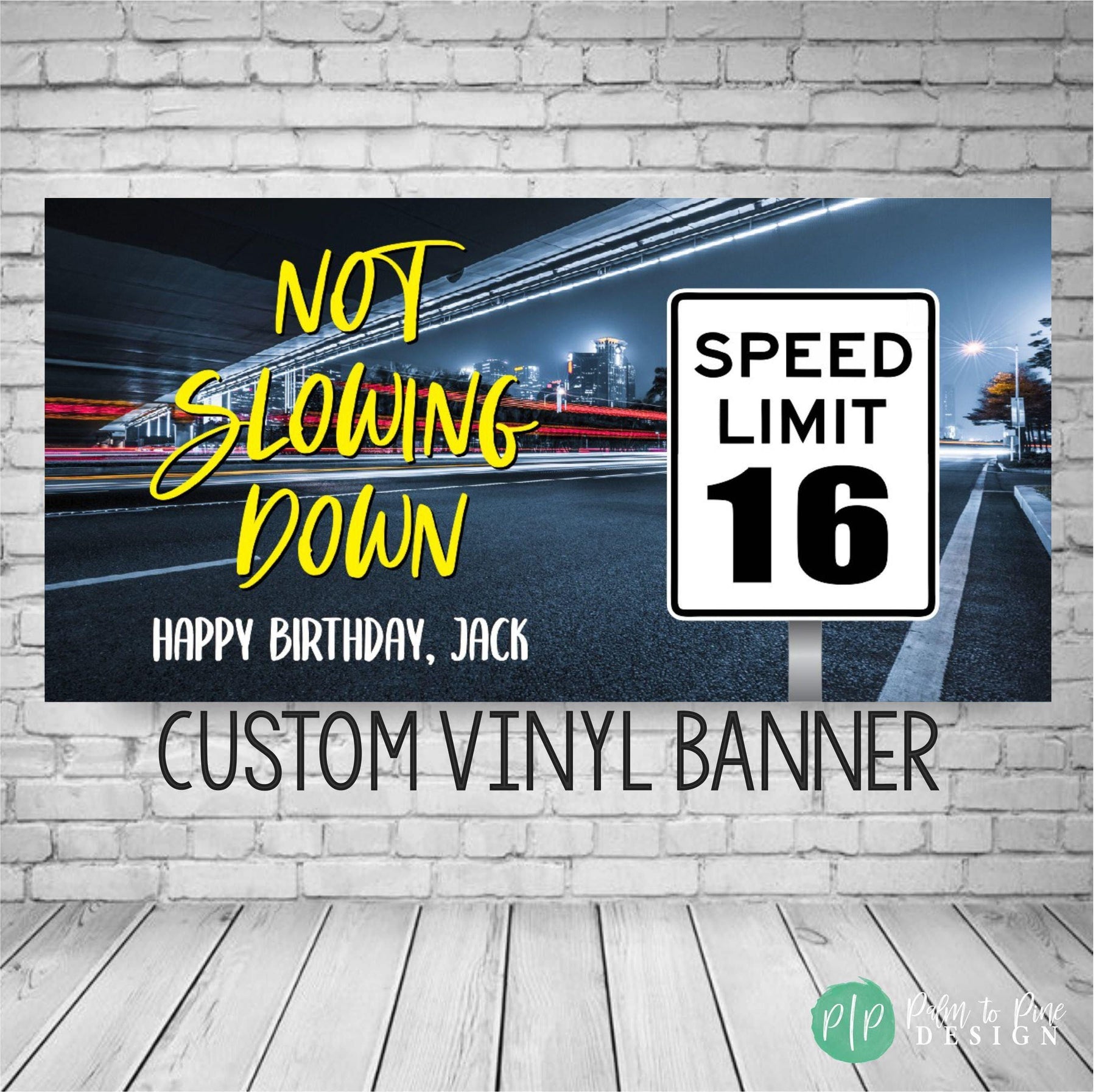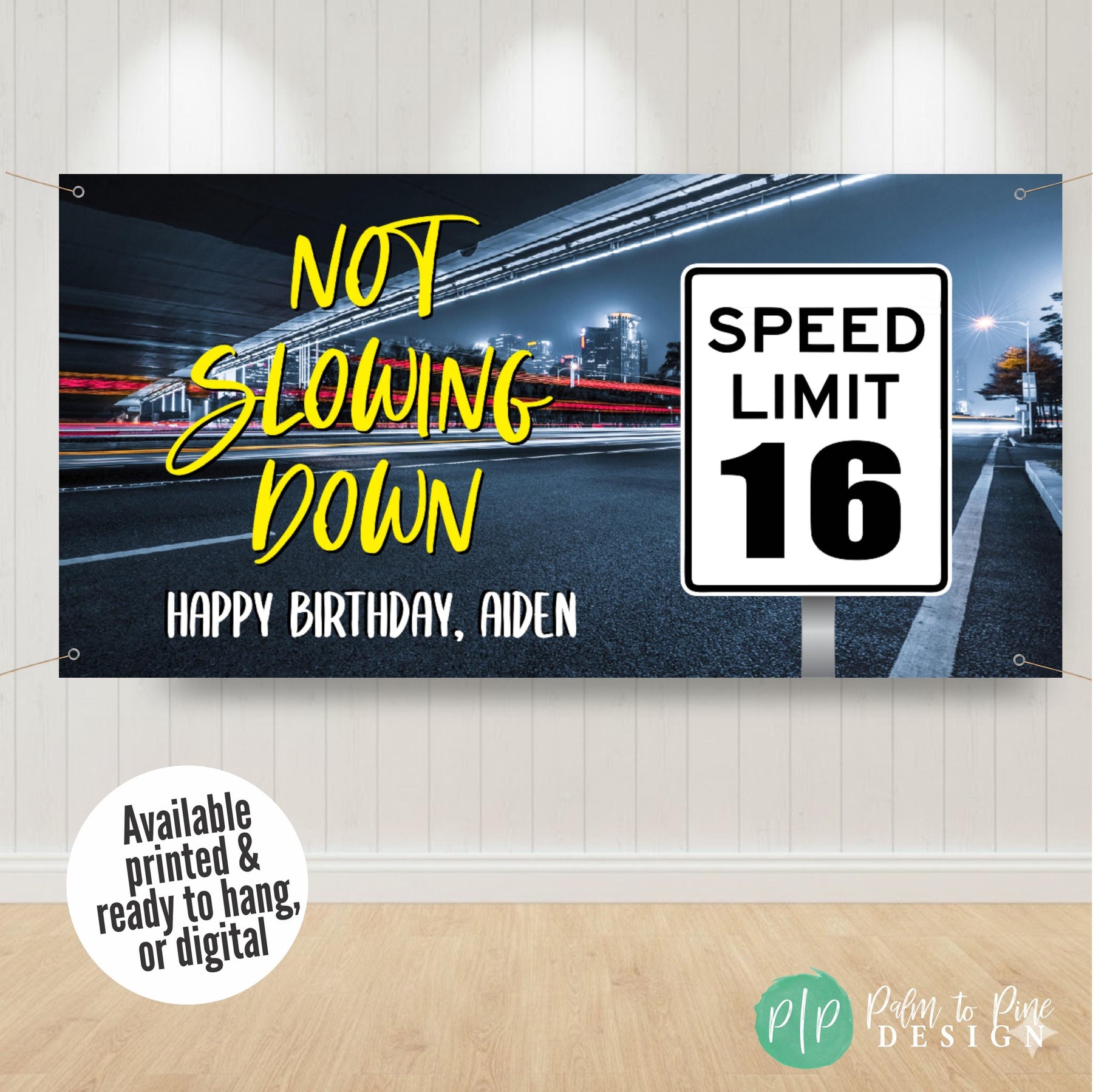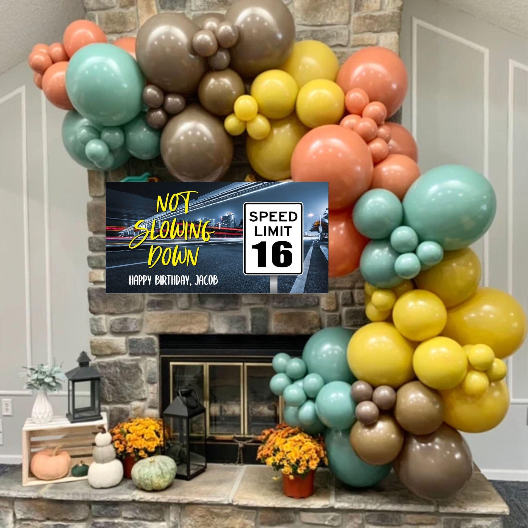 This personalized teen boy birthday banner is perfect for celebrating a new driver's or car lovers 16th birthday party with a custom birthday backdrop! This speed limit sign birthday banner can also be changed to celebrate a 20th, 25th, 30th, 50th or any age with this "not slowing down" speed limit birthday sign. This custom birthday decor is perfect to celebrate a male birthday party, or a woman that lives life in the fast lane too. This personalized speed limit car enthusiast Happy Birthday Banner is the perfect way to celebrate a birthday right now!