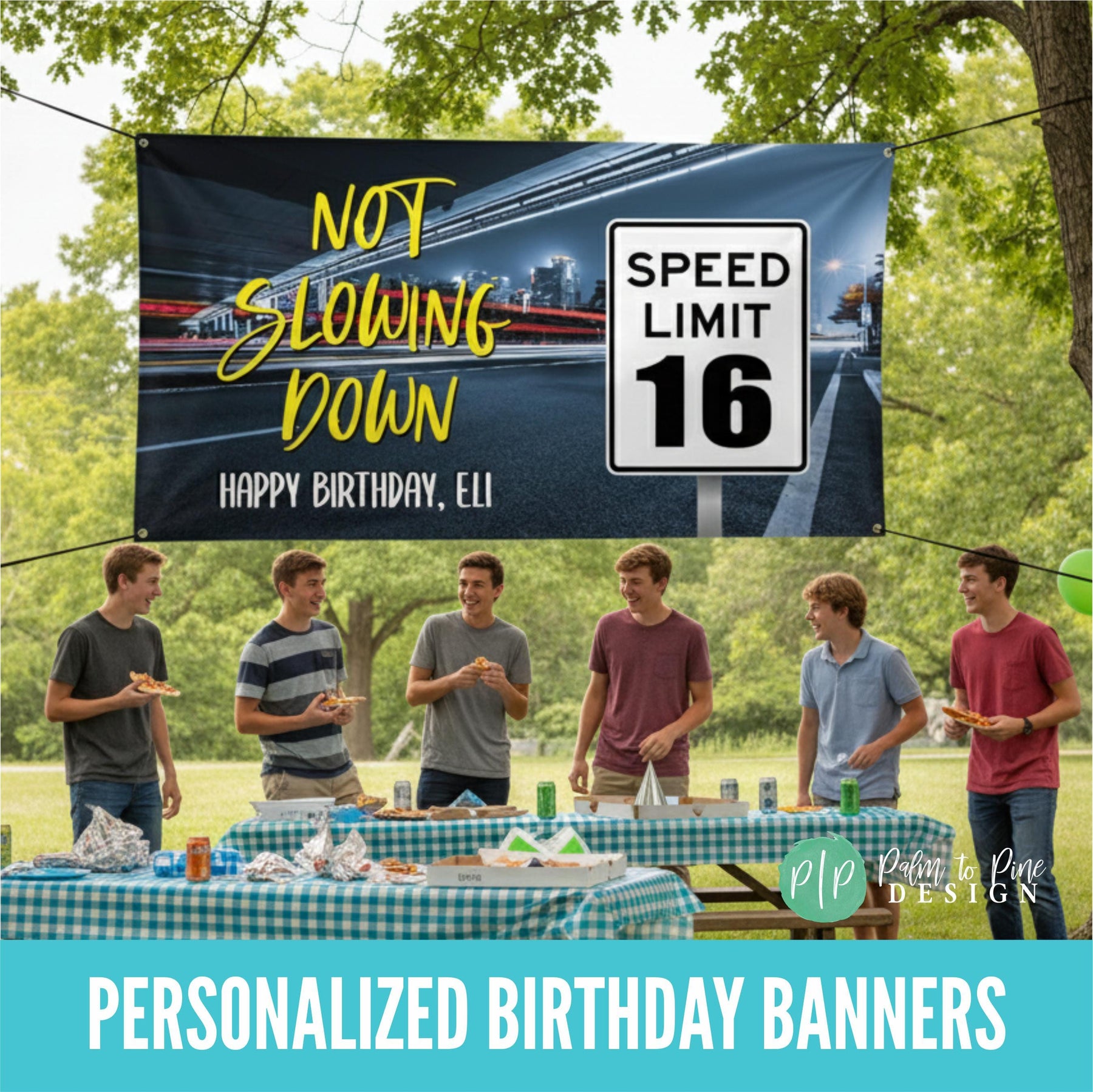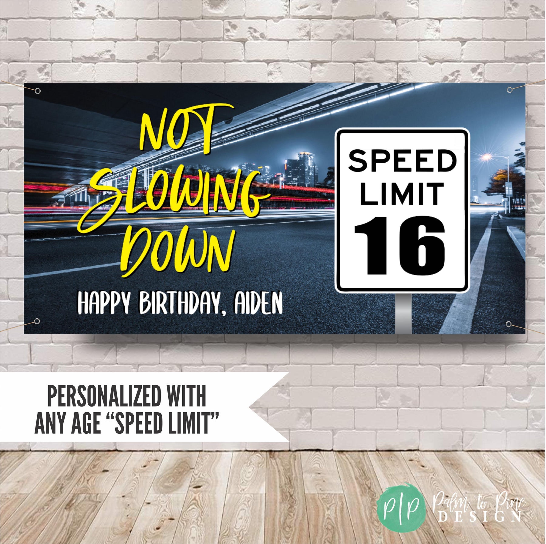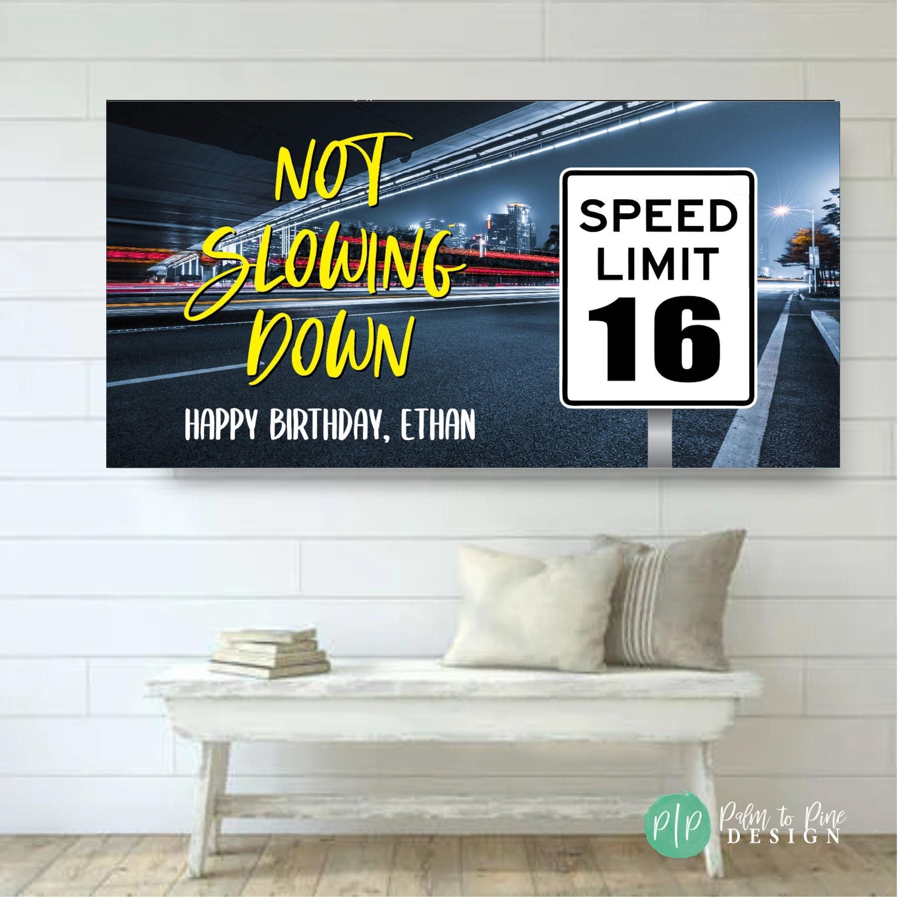 This personalized teen boy birthday banner is perfect for celebrating a new driver's or car lovers 16th birthday party with a custom birthday backdrop! This speed limit sign birthday banner can also be changed to celebrate a 20th, 25th, 30th, 50th or any age with this "not slowing down" speed limit birthday sign. This custom birthday decor is perfect to celebrate a male birthday party, or a woman that lives life in the fast lane too. This personalized speed limit car enthusiast Happy Birthday Banner is the perfect way to celebrate a birthday right now!