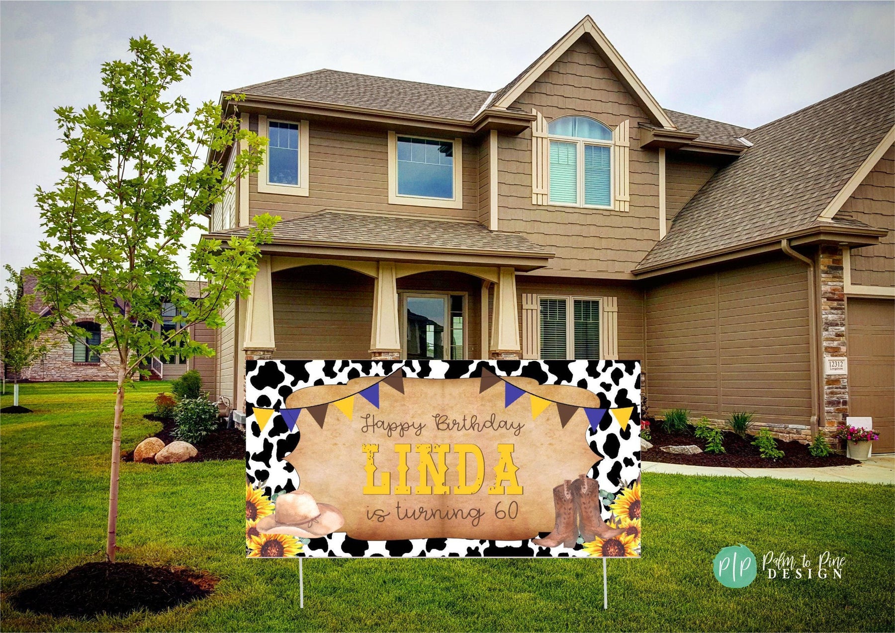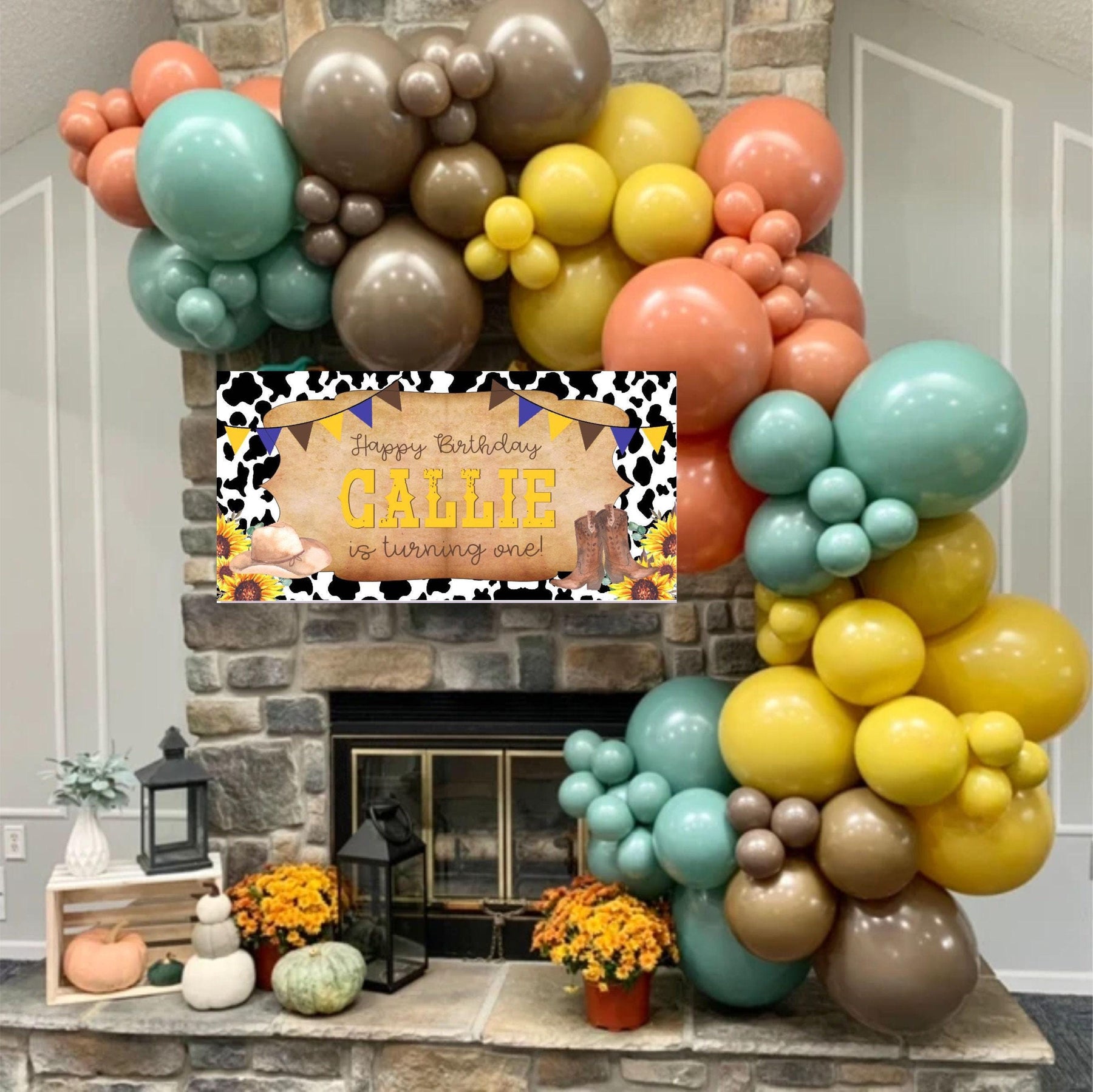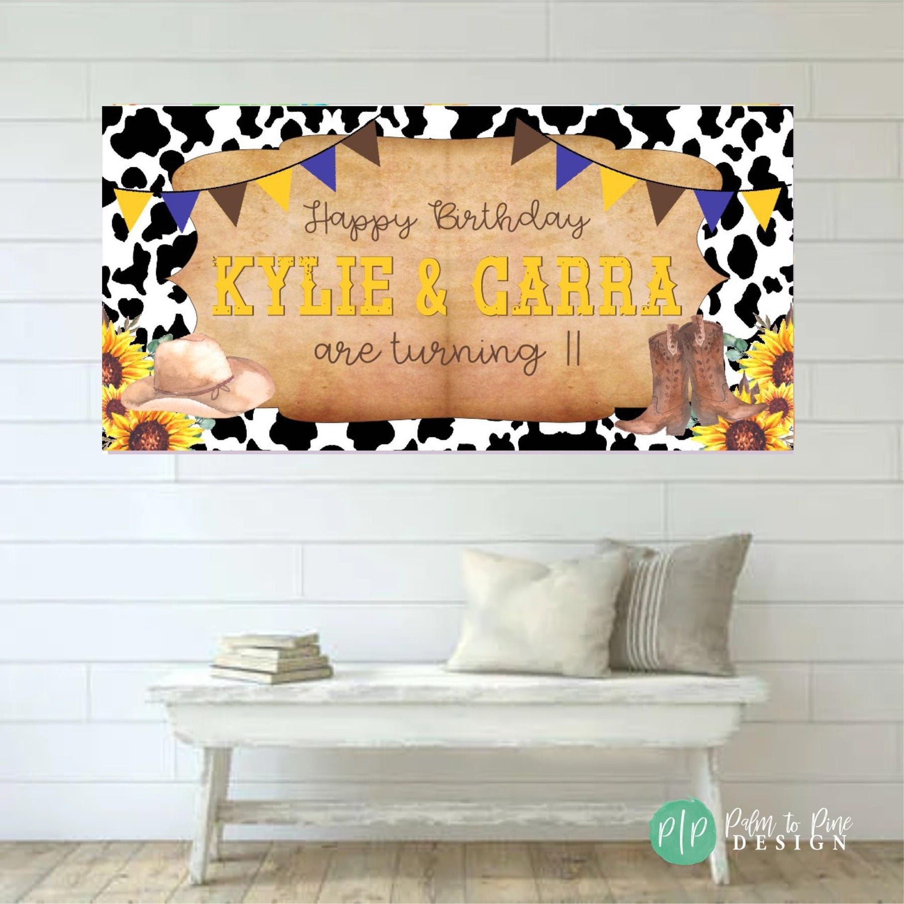 This personalized Cowgirl western birthday banner is the perfect decoration for your western theme birthday party! The cow print background, yellow sunflowers with cowboy hat and cowgirl boots create the rustic country charm while the yellow and brown bunting banner ties the rodeo birthday party theme together (perfect for a "My First Rodeo" first Birthday). Use this cowgirl birthday banner as a photo backdrop, hang it over a dessert table, or use it as a welcome sign at your kids birthday party.