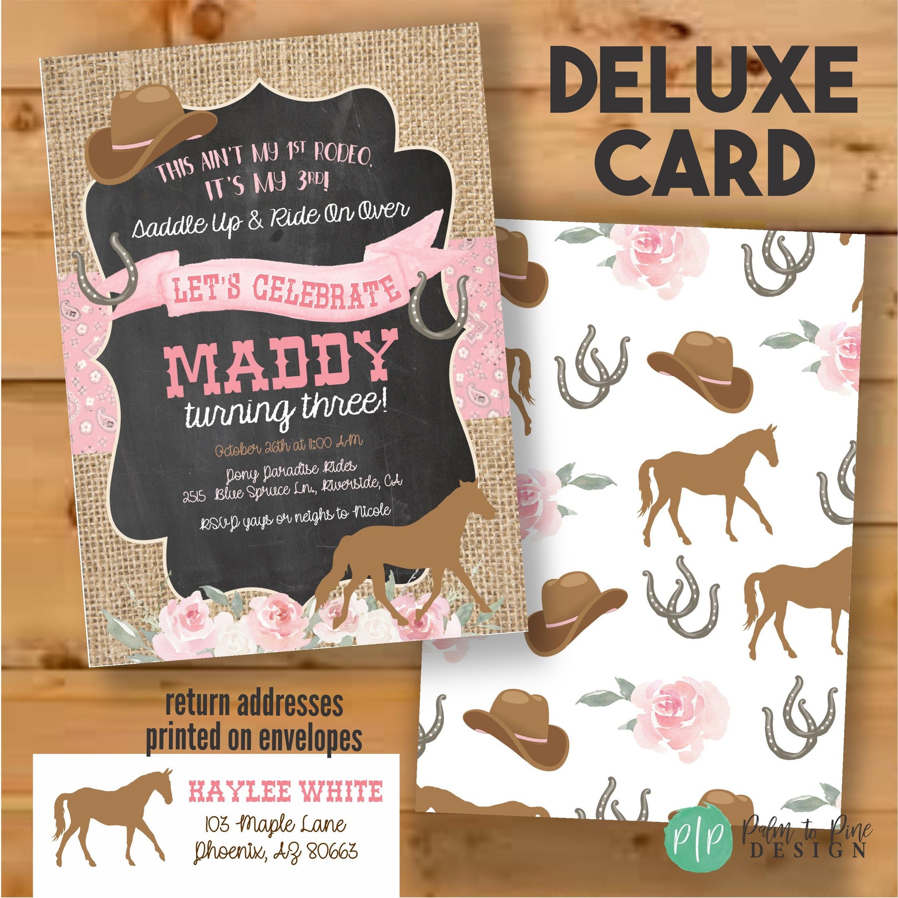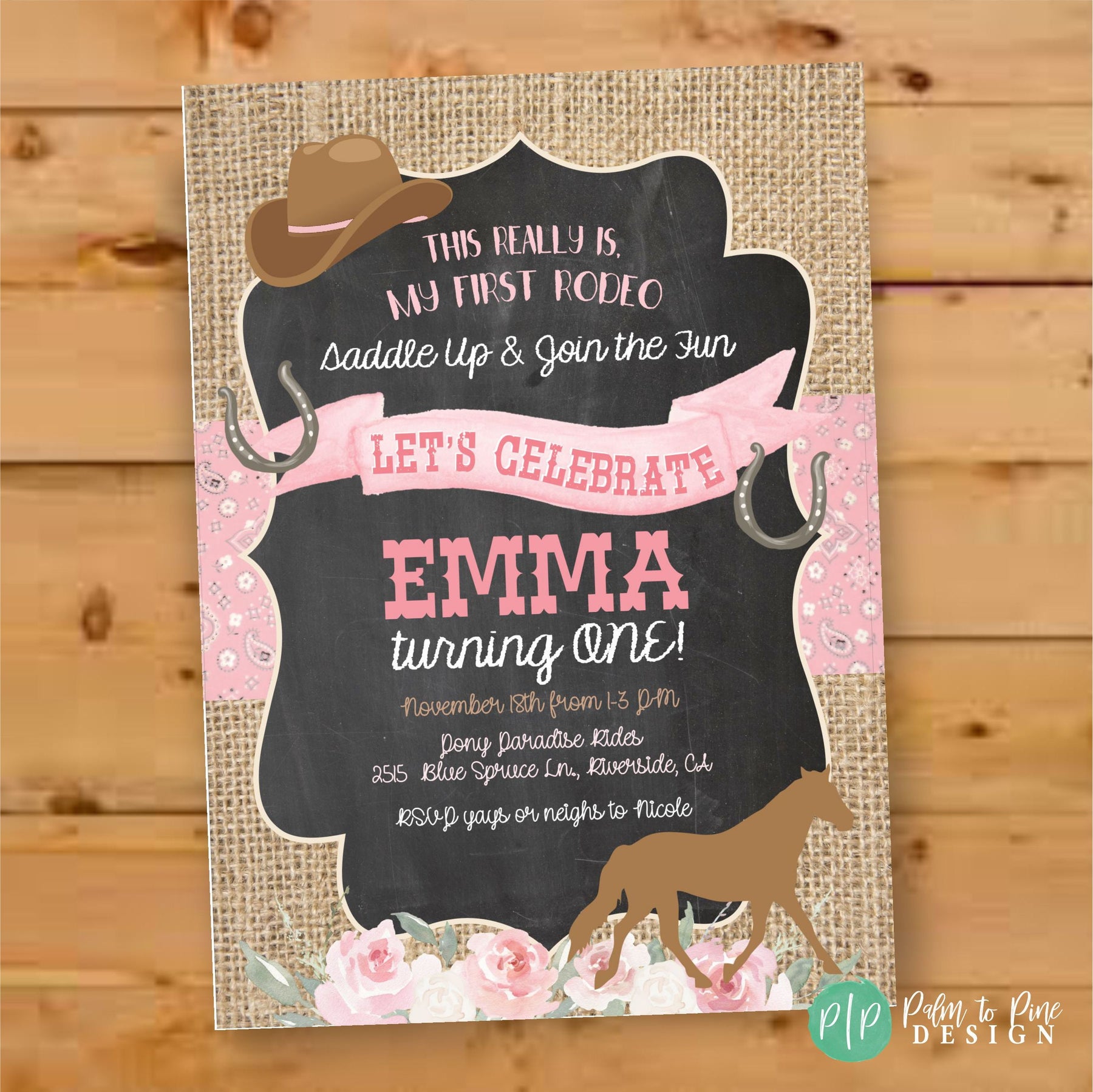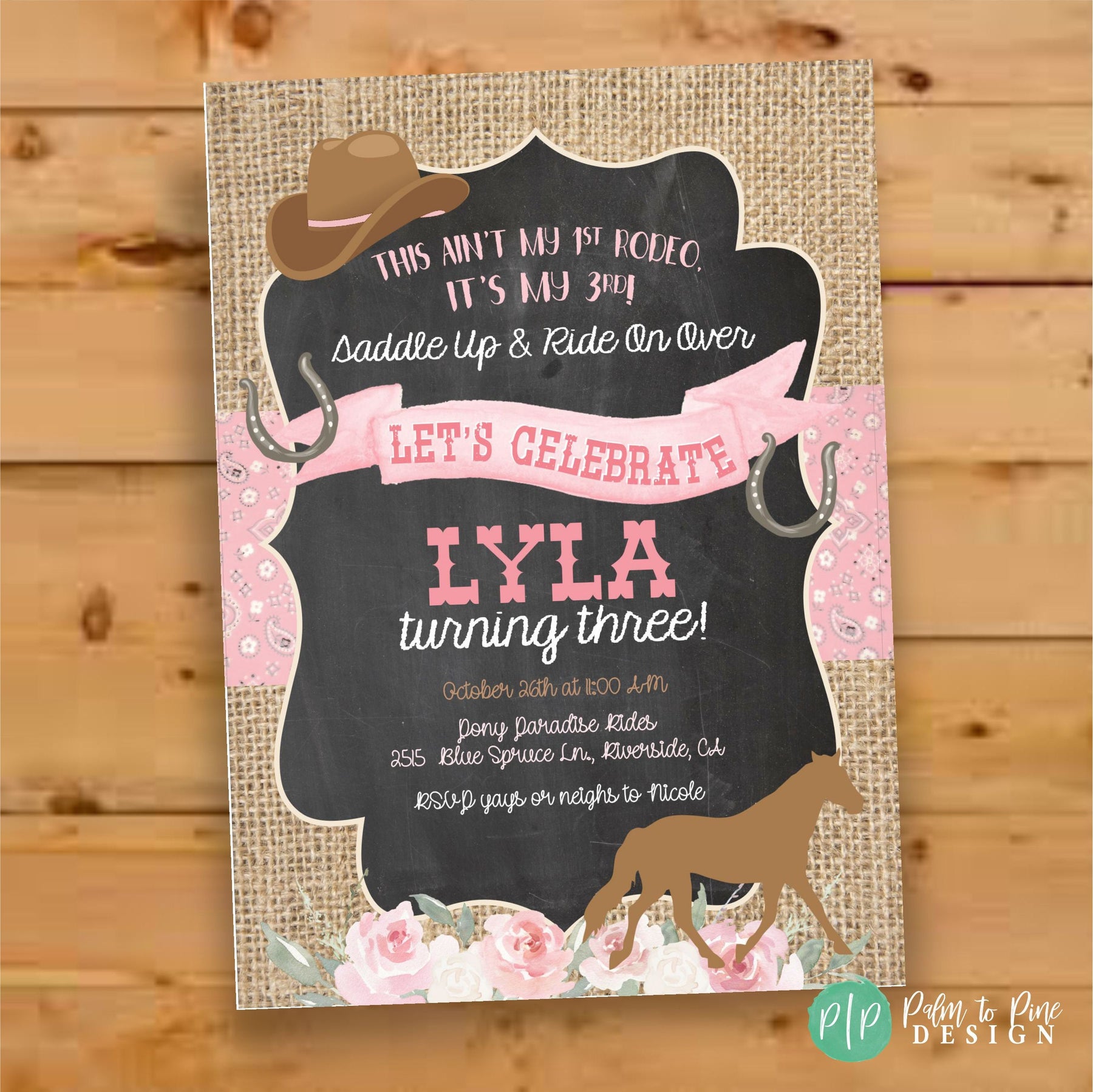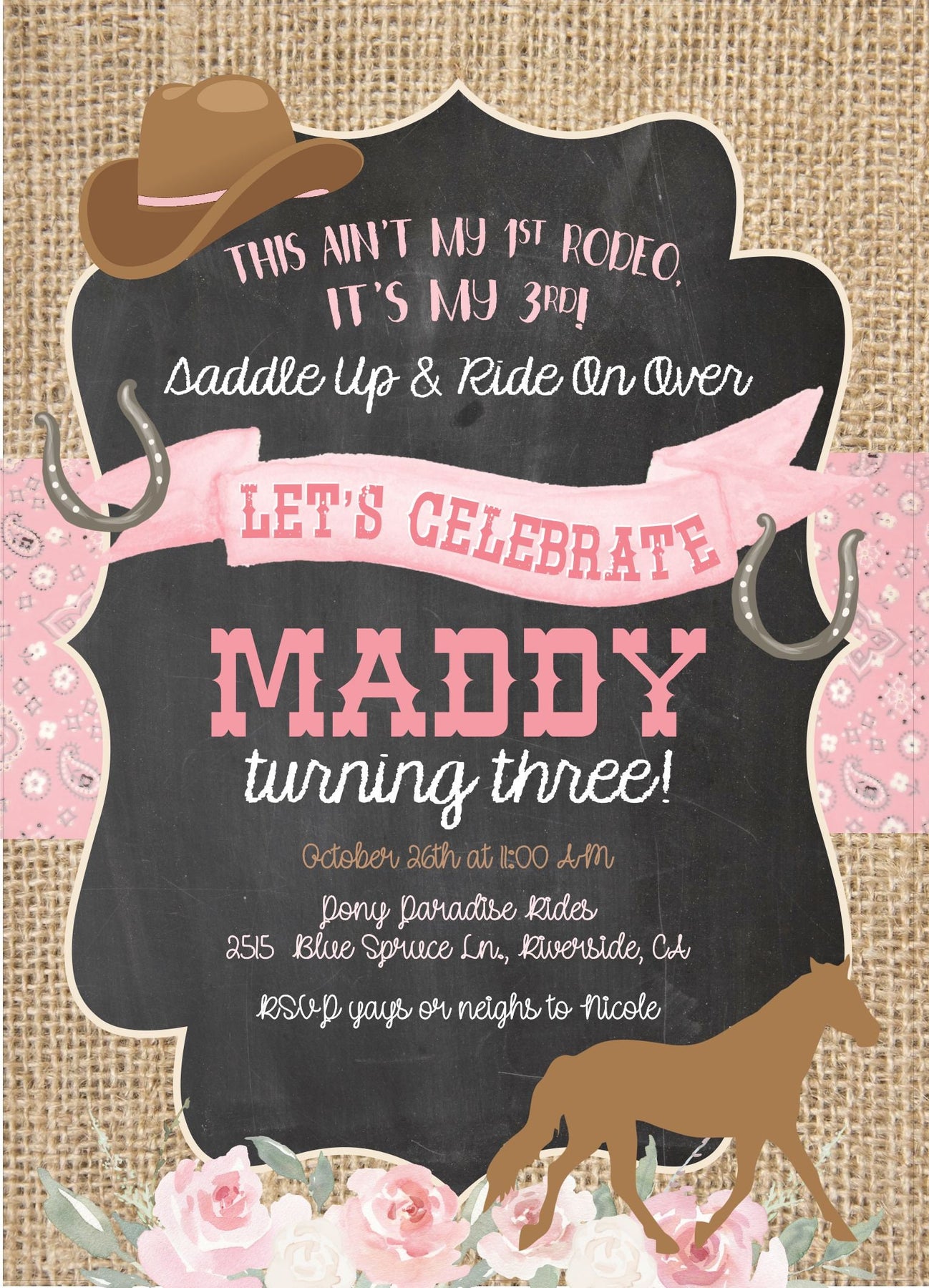 This burlap and chalkboard floral horse invite is perfect for your Cowgirl Birthday party or pony or horse birthday. The wording can be customized to accommodate any age birthday party. The rustic burlap background, pink bandana banner and pink flowers with horse, cowgirl hat and horseshoes create the perfect theme for any horse birthday party. YES! The colors can be changed, just let me know your requests at checkout!
