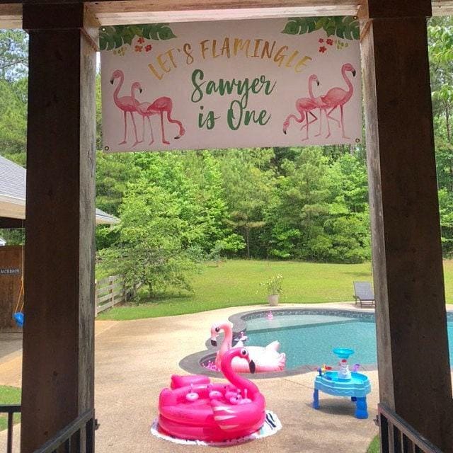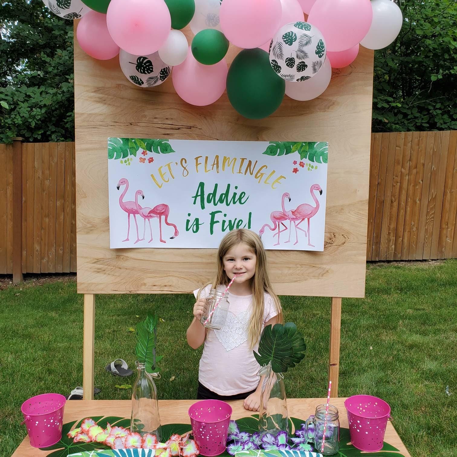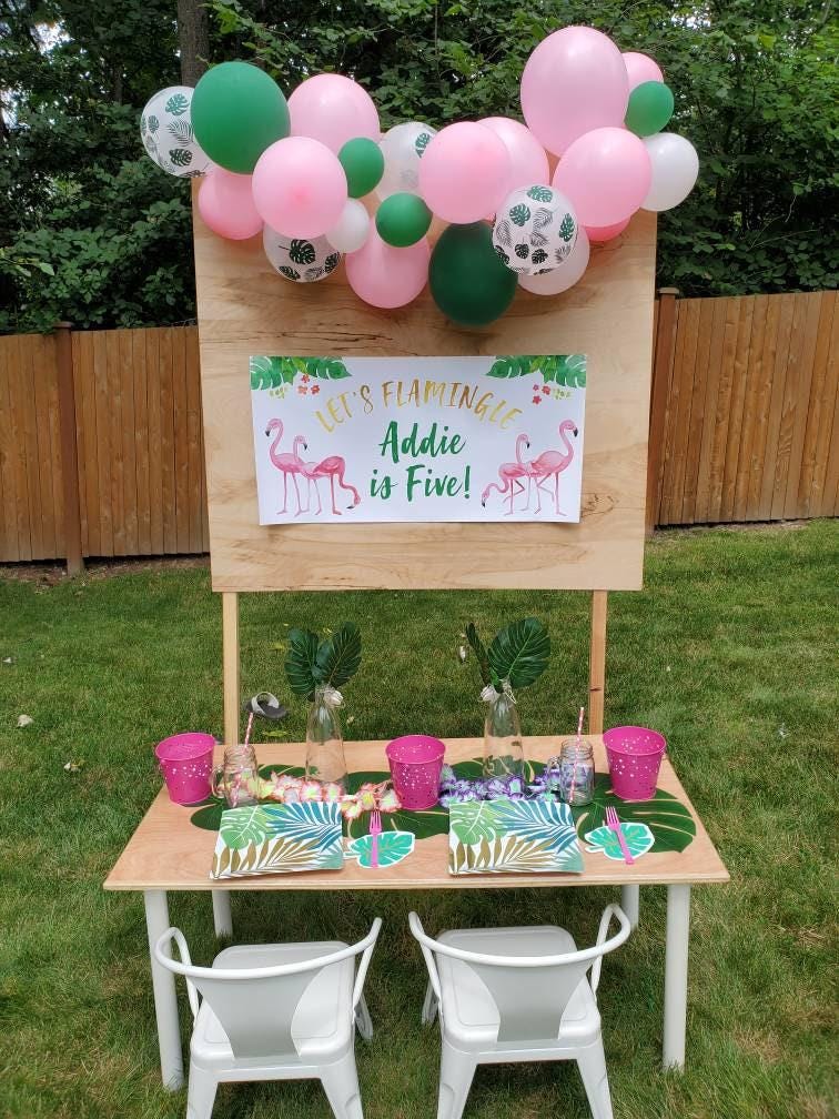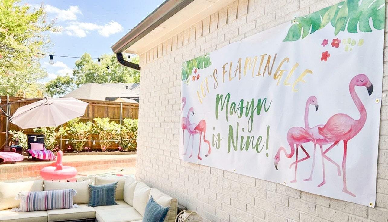 This Flamingo birthday banner is perfect for your little Flamingo lover's birthday party or pool party. The watercolor Flamingo and palm leaves background is the perfect decoration for your tropical Flamingo birthday party. Use this durable vinyl banner for a outdoor welcome sign at a Flamingo party, as a photo backdrop for pictures or this vinyl banner makes the perfect decoration for behind a dessert table to flamingle! The colors won't fade in the sun and the banner can be hung in your little girls bedroom after the party is over!