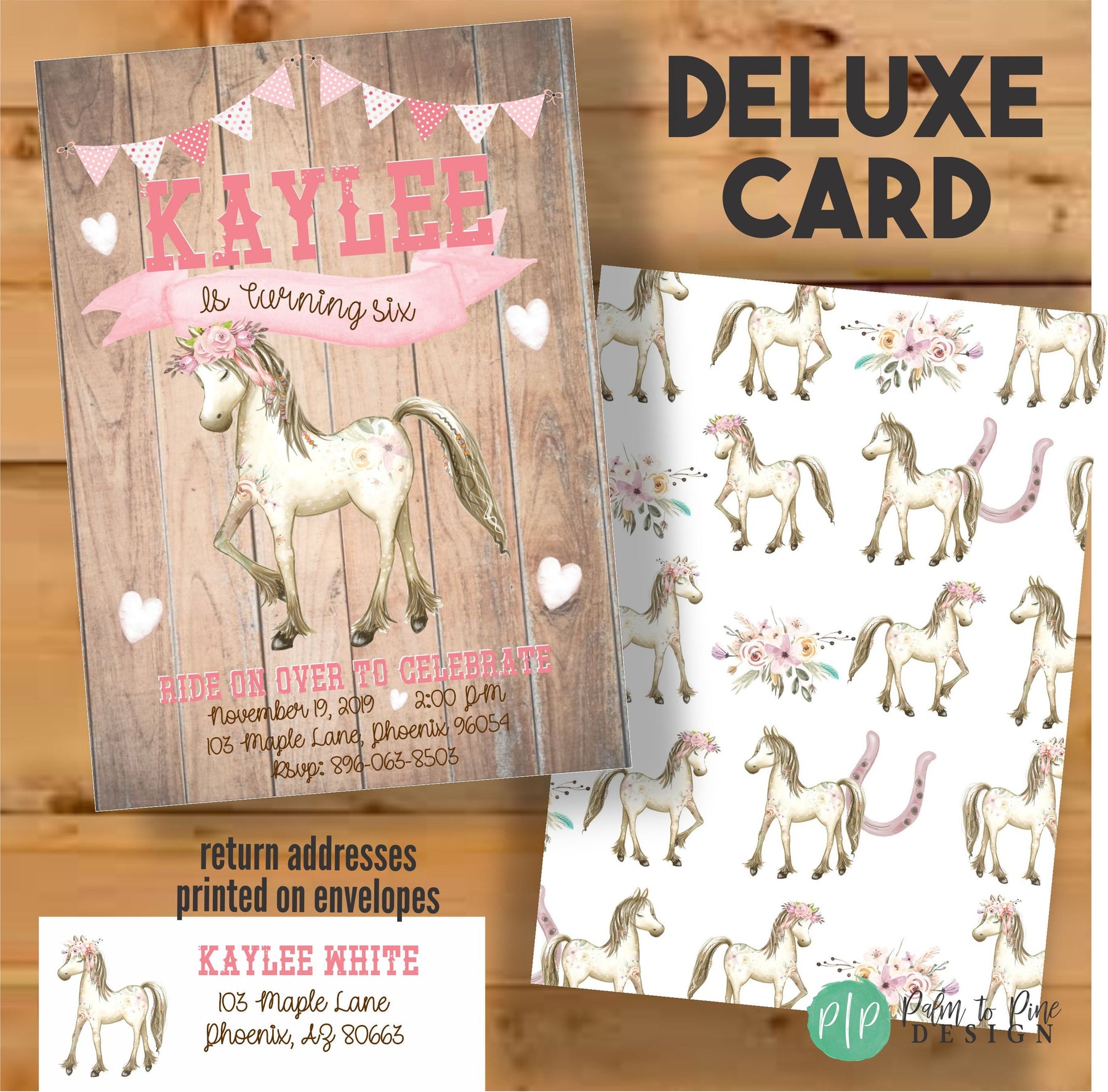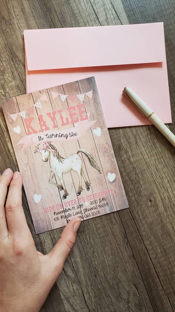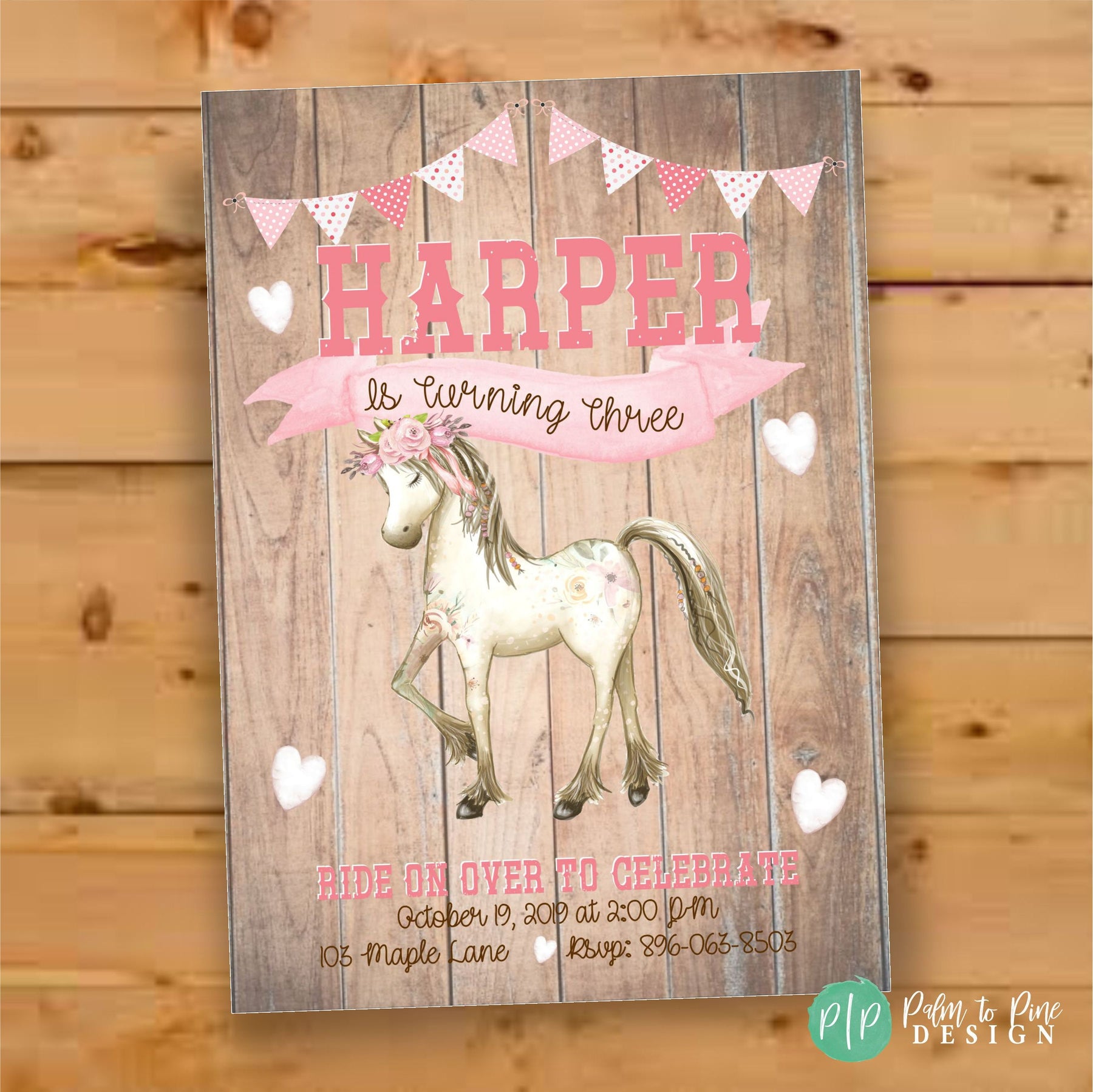 This Shabby Chic floral horse invite is perfect for your Cowgirl Birthday party or pony or horse birthday. The wording can be customized to accommodate any age birthday party. The rustic wood background, pink bunting banner and floral horse create the perfect theme for any horse birthday party. YES! The colors can be changed, just let me know your requests at checkout!