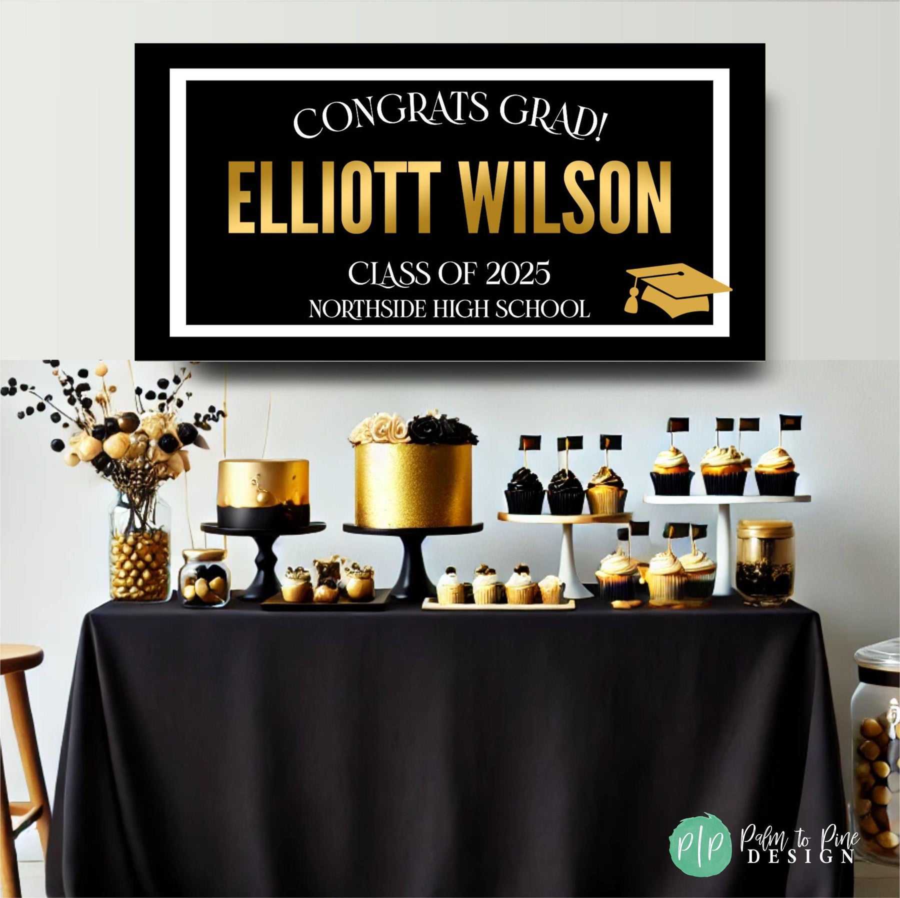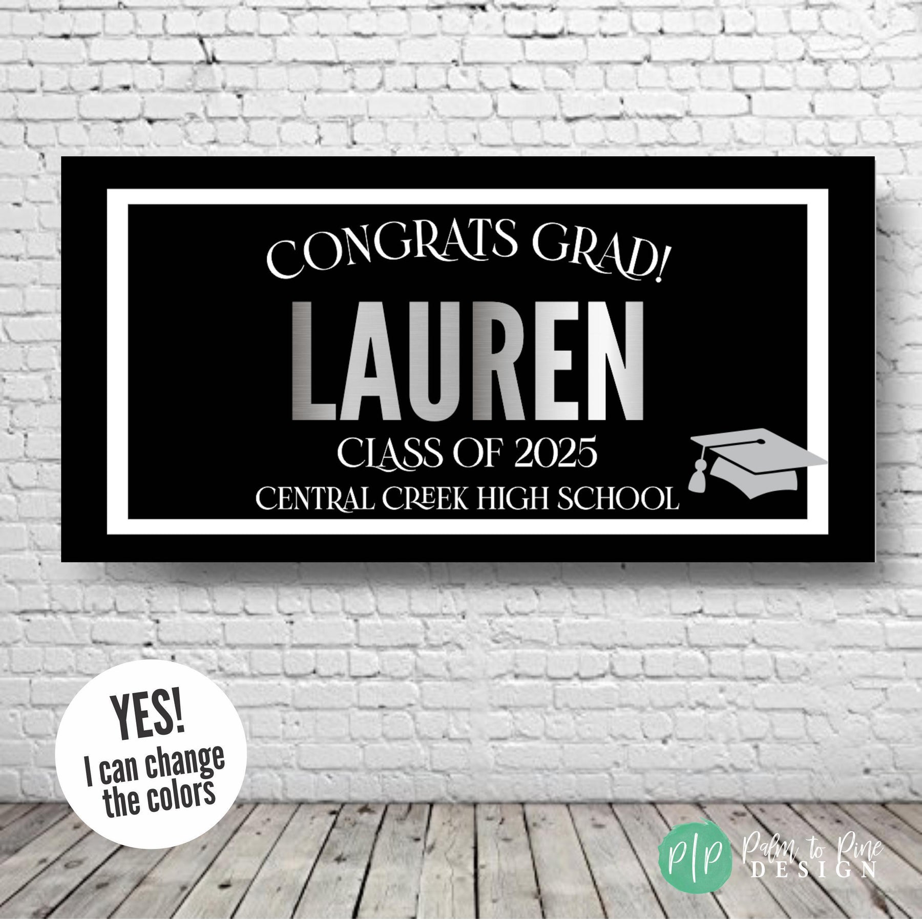 Make your grads day special with a personalized banner that’s as unique as they are! This customized graduation party banner is the perfect way to show off your grad’s hard-earned accomplishments. The graduation cap colors on this graduation banner can be customized to match the schools colors, just include your request in your notes to seller section at checkout! This graduation backdrop would look perfect hanging outside your home, in your yard, behind a dessert table or even hanging in the halls of your school celebrating your 2025 graduates!