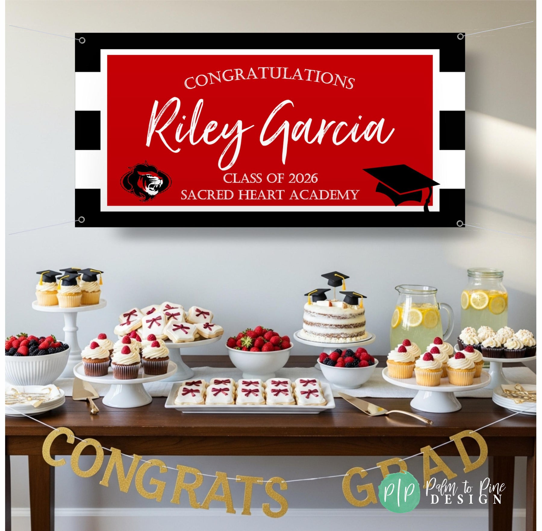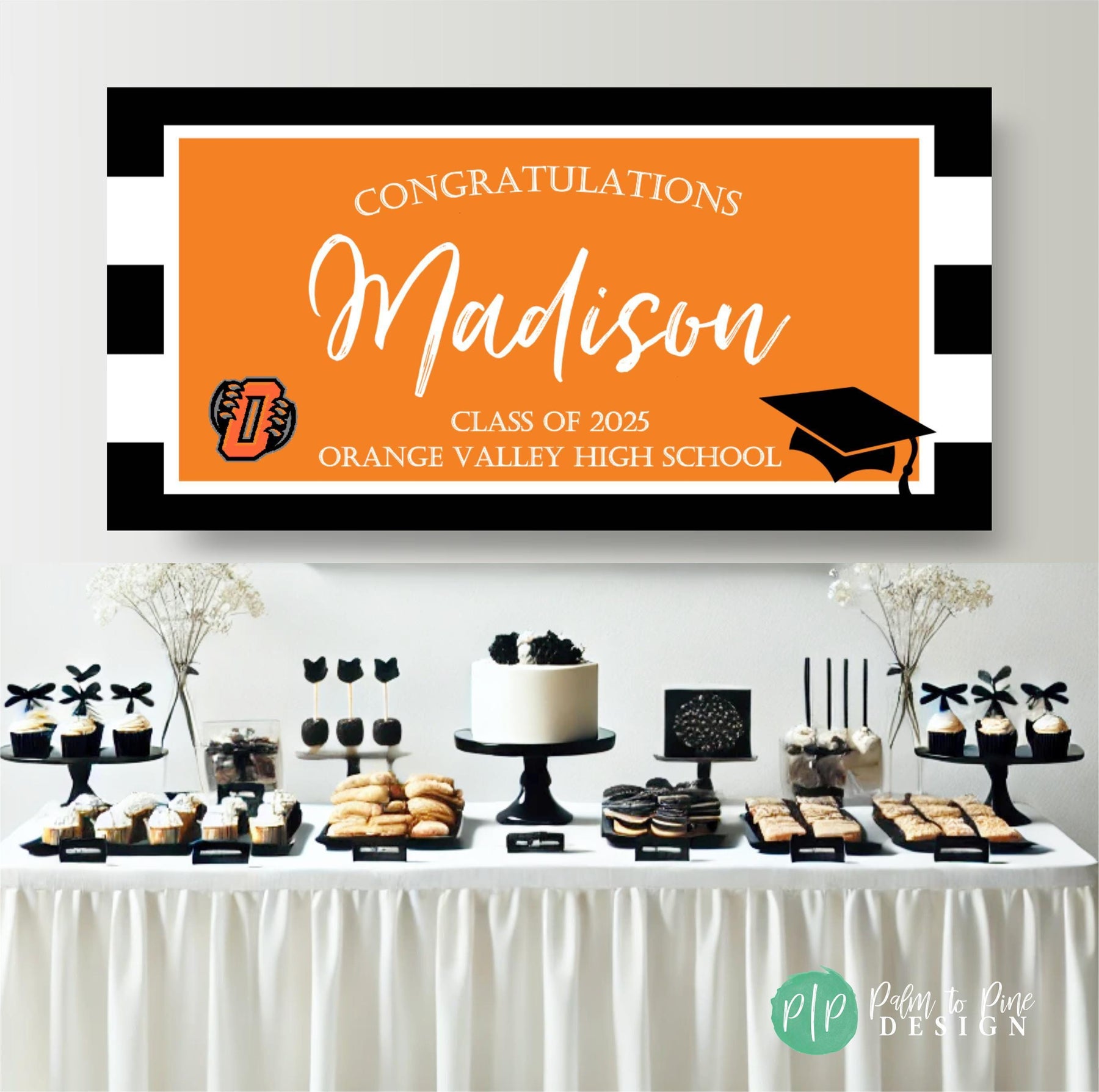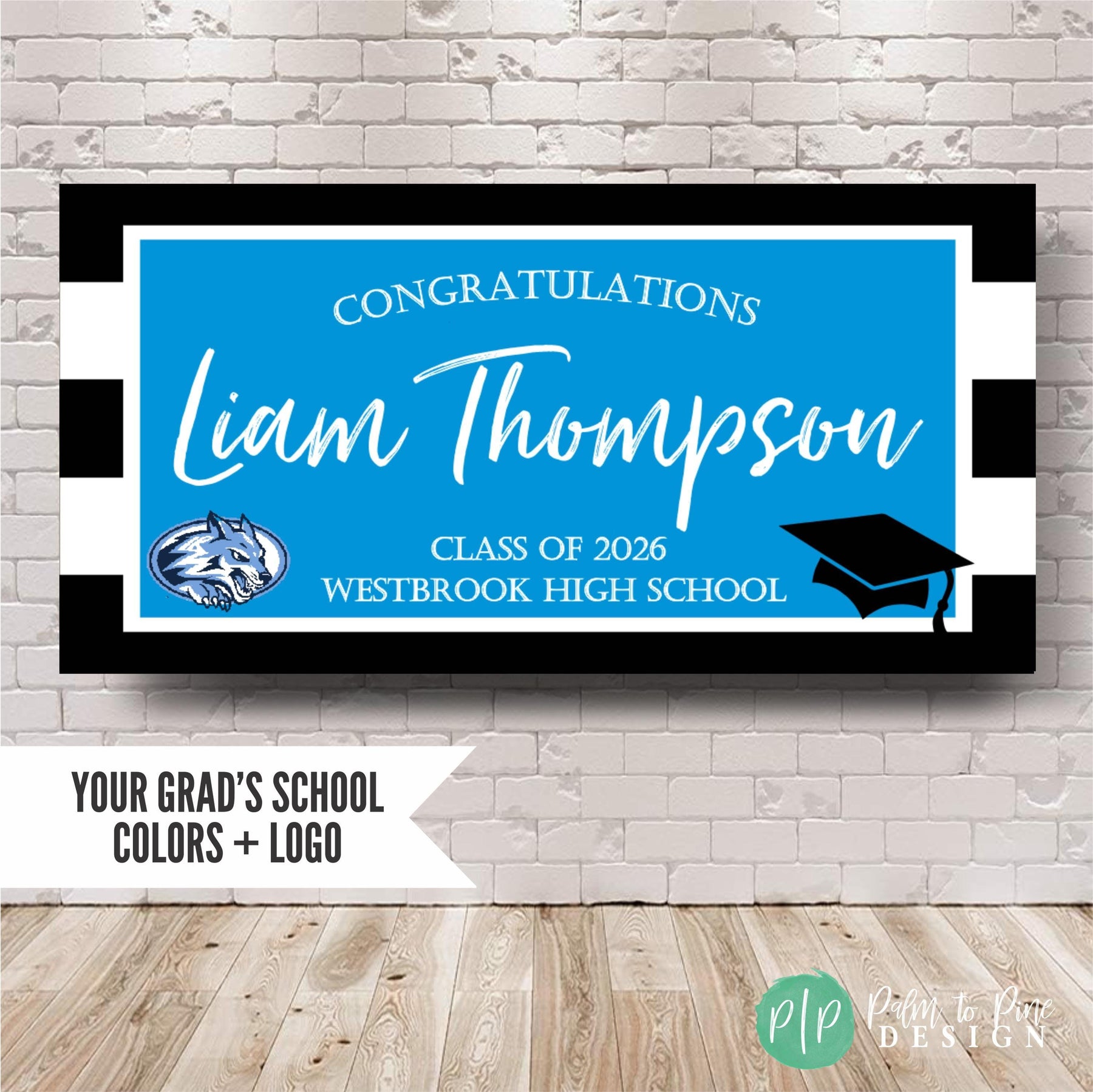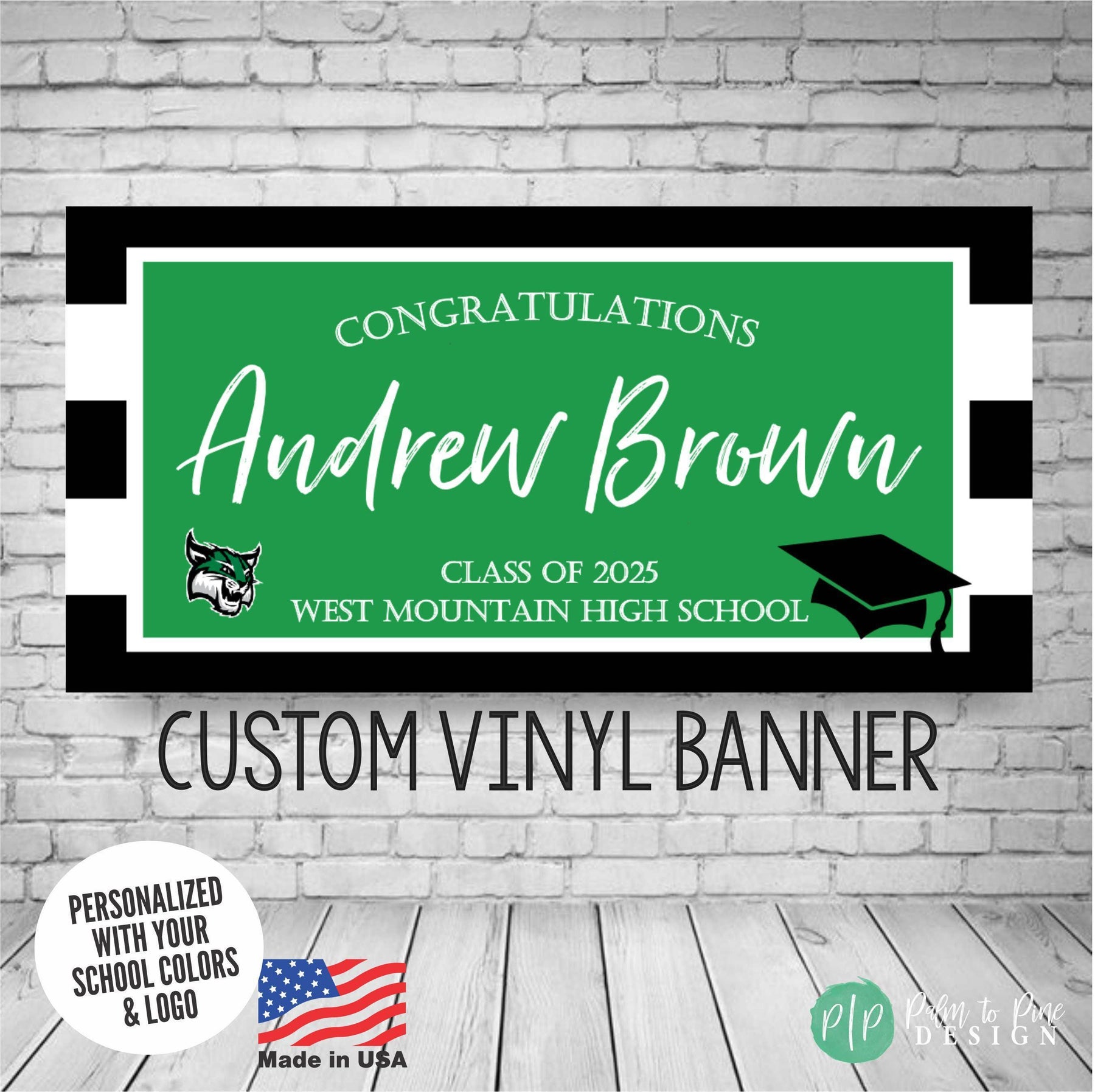 Make your graduate's big day even brighter with a personalized graduation banner, in your school colors, and including your school mascott (optional)! Show your grad how proud you are of their achievements with a custom, high-quality vinyl graduation banner, perfect for a College Bed Party too!
