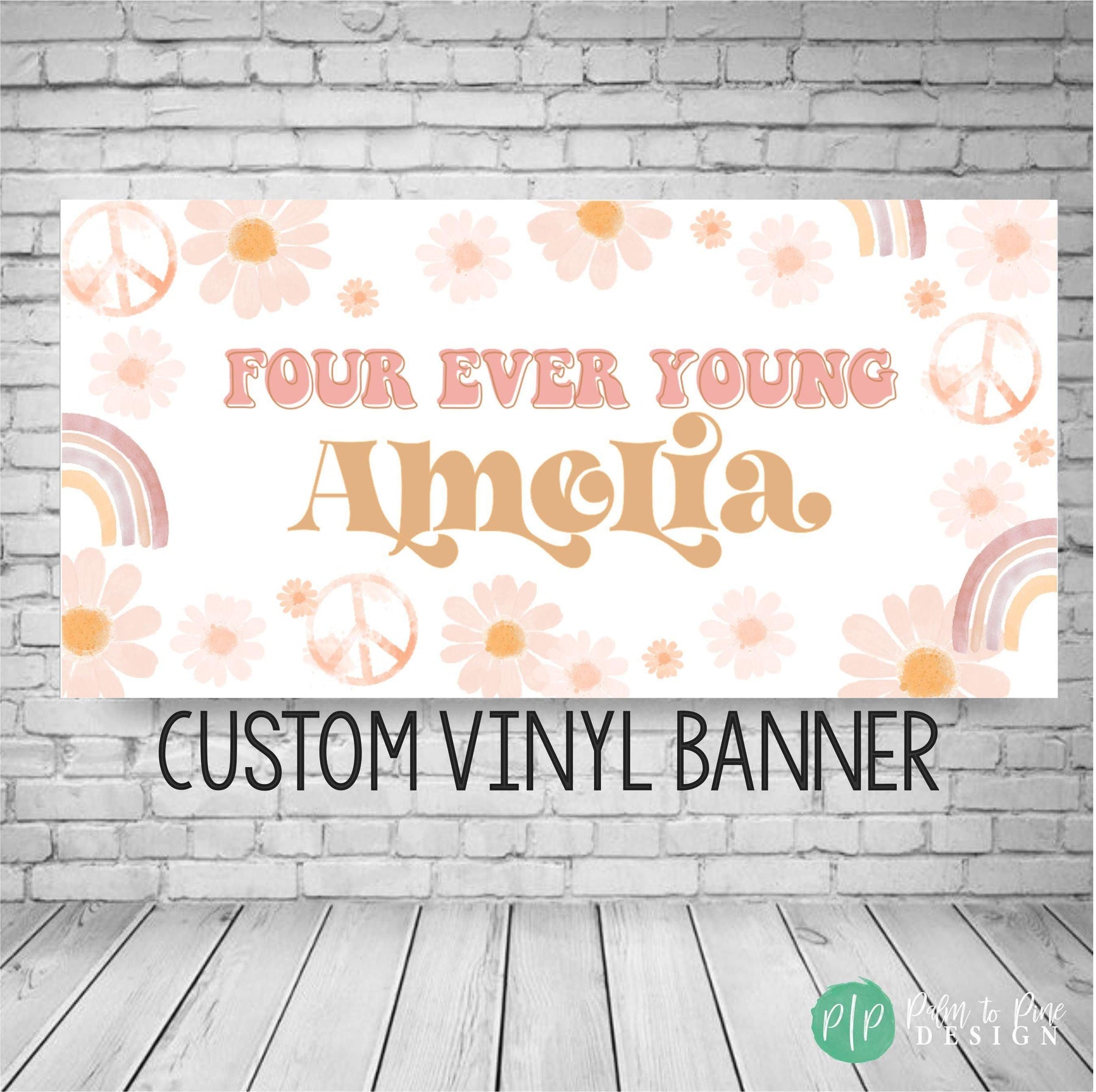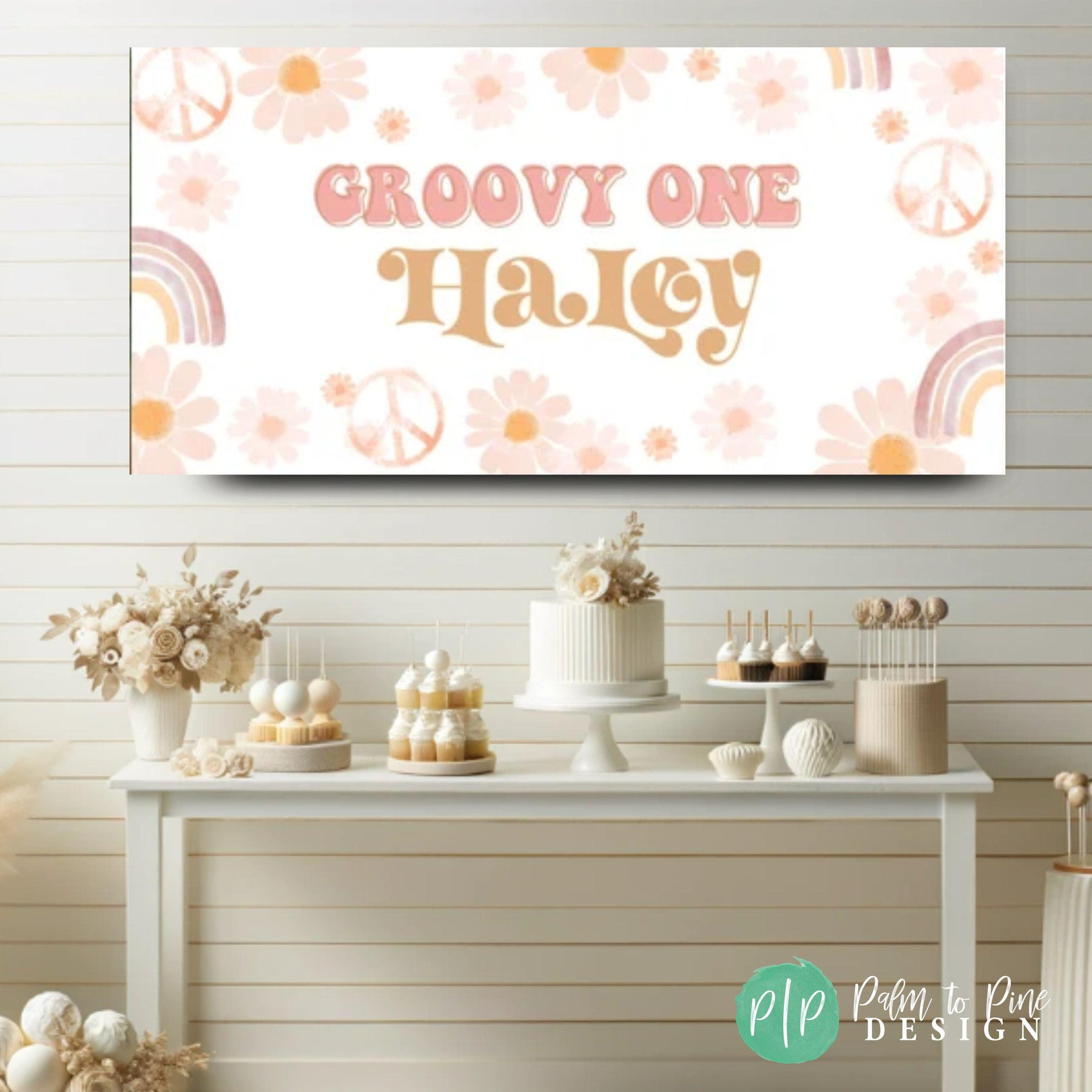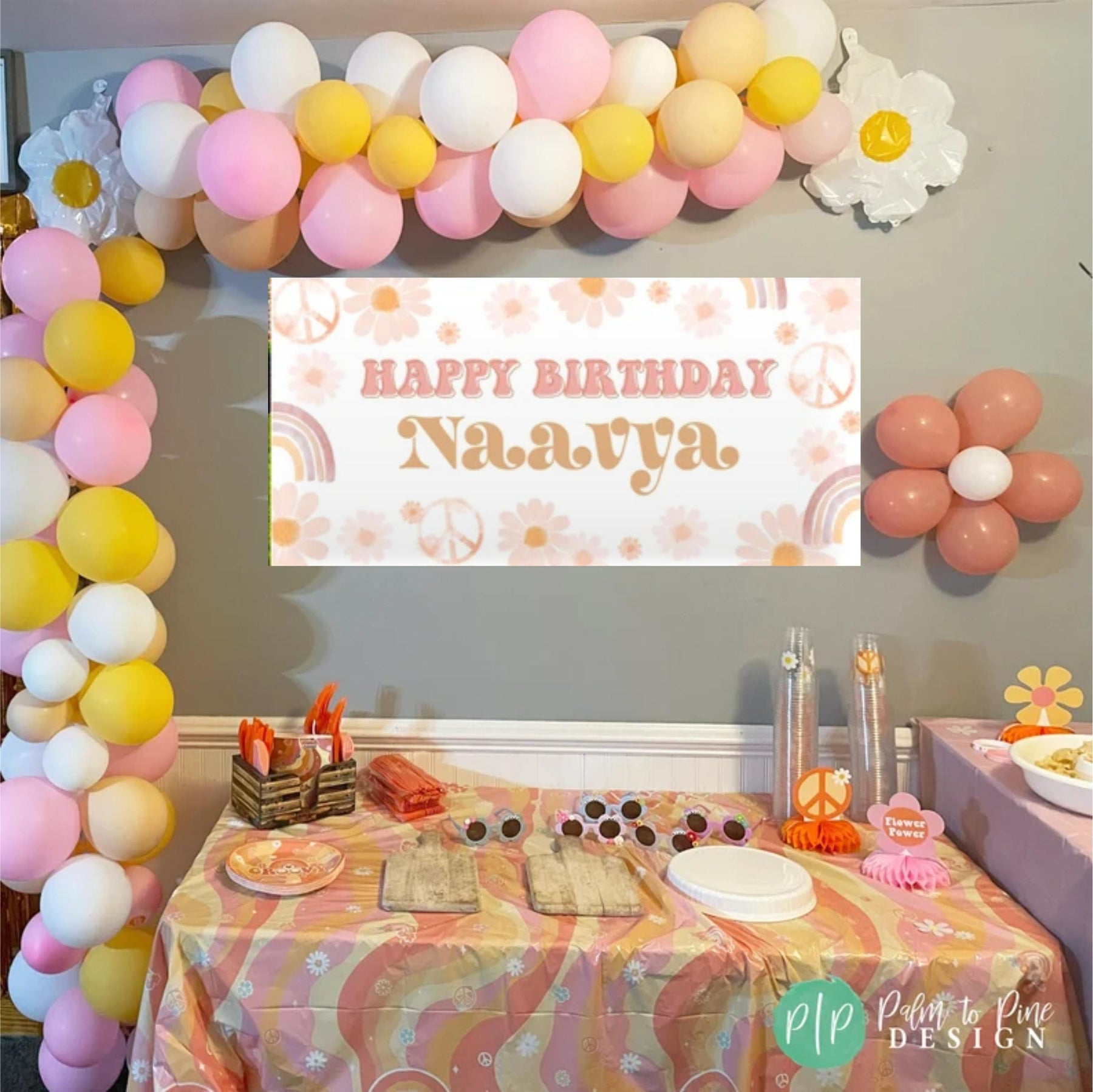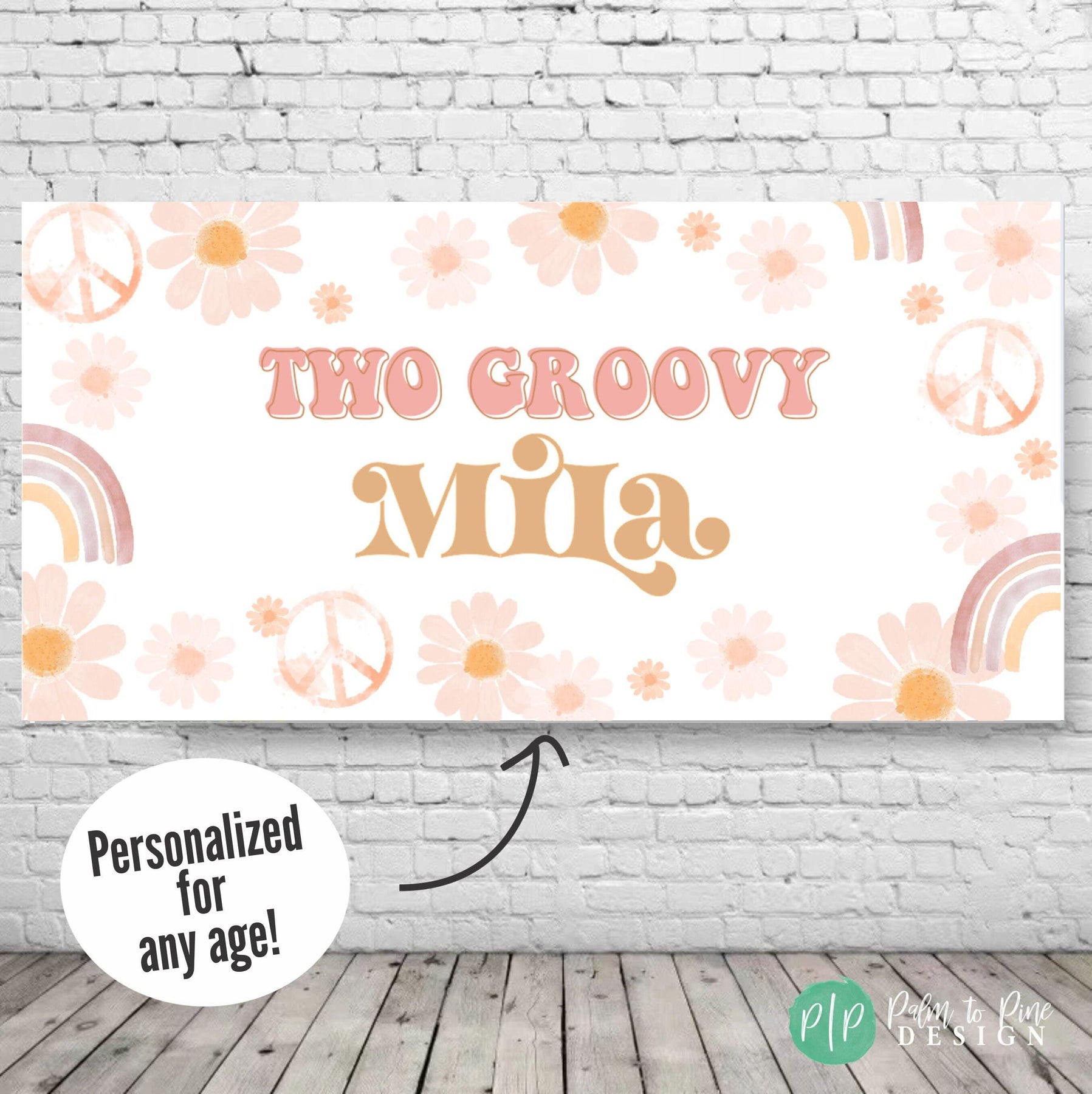 This personalized boho birthday banner is perfect for celebrating your Hippie Birthday party! The daisy's, rainbows and peace signs make this banner groovy! The custom Flower Child wording can be changed for any message and this birthday sign can be personalized with your little ones age! This birthday banner is perfect for a birthday yard sign, behind a dessert table or as a welcome sign at your groovy birthday party.