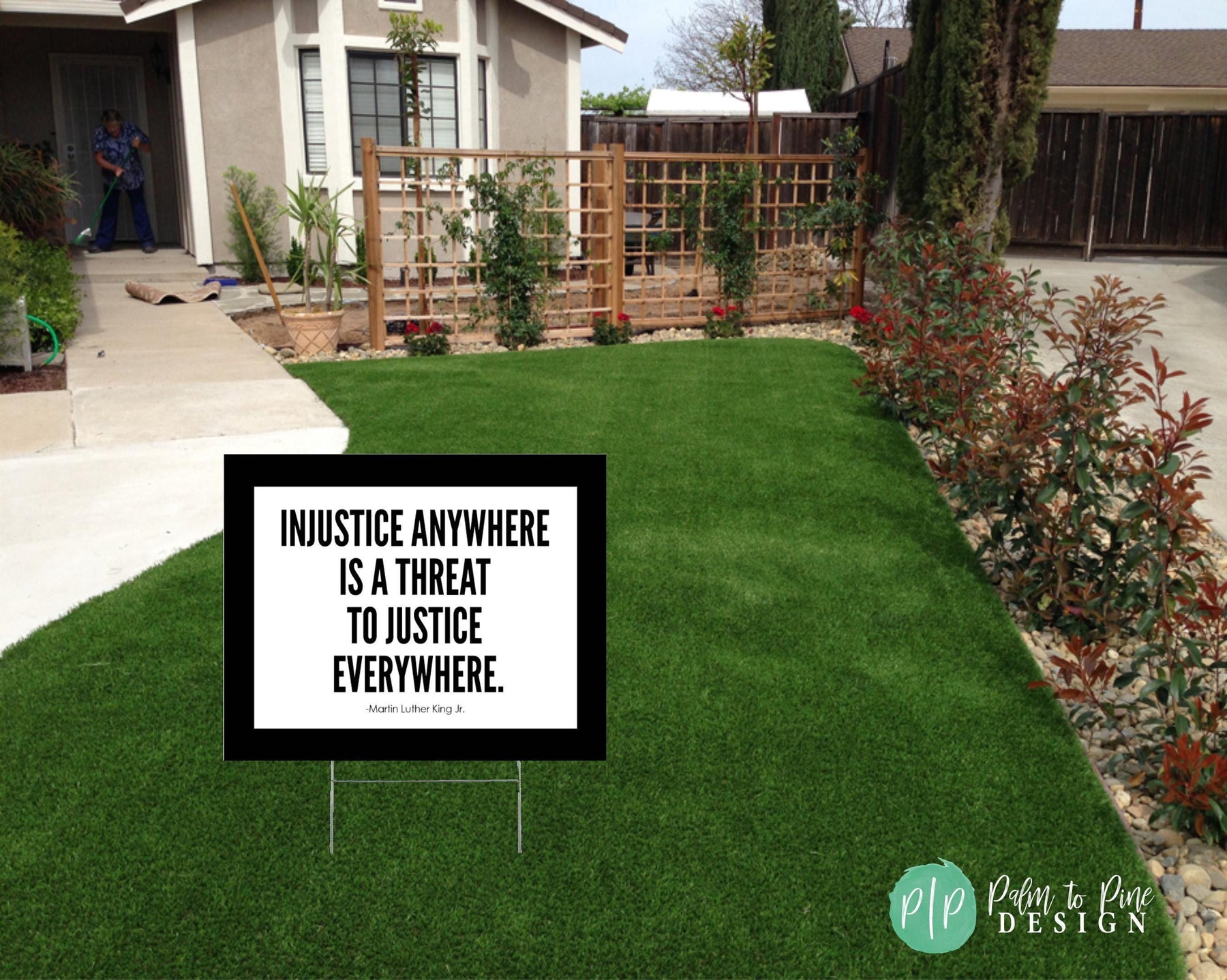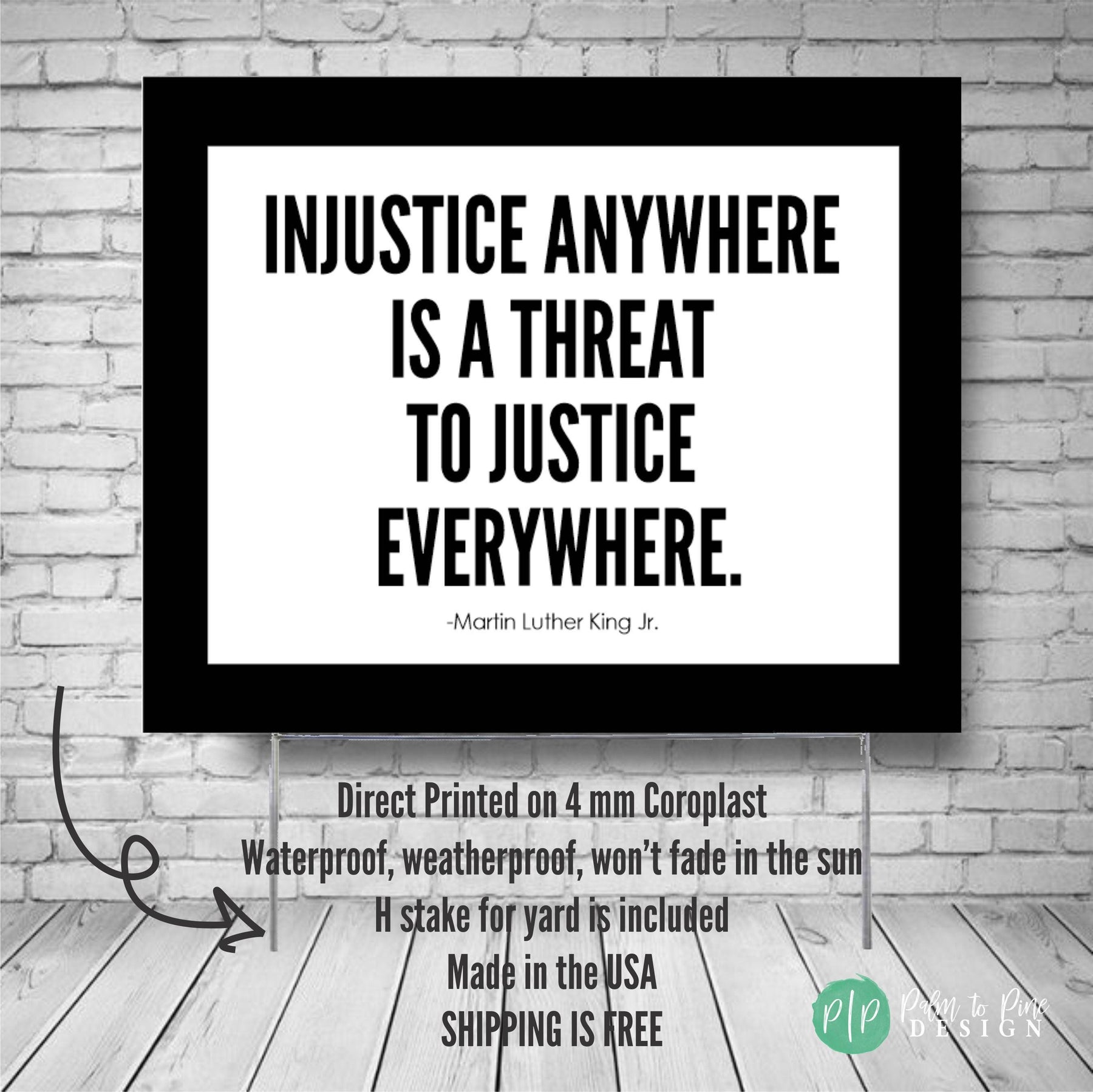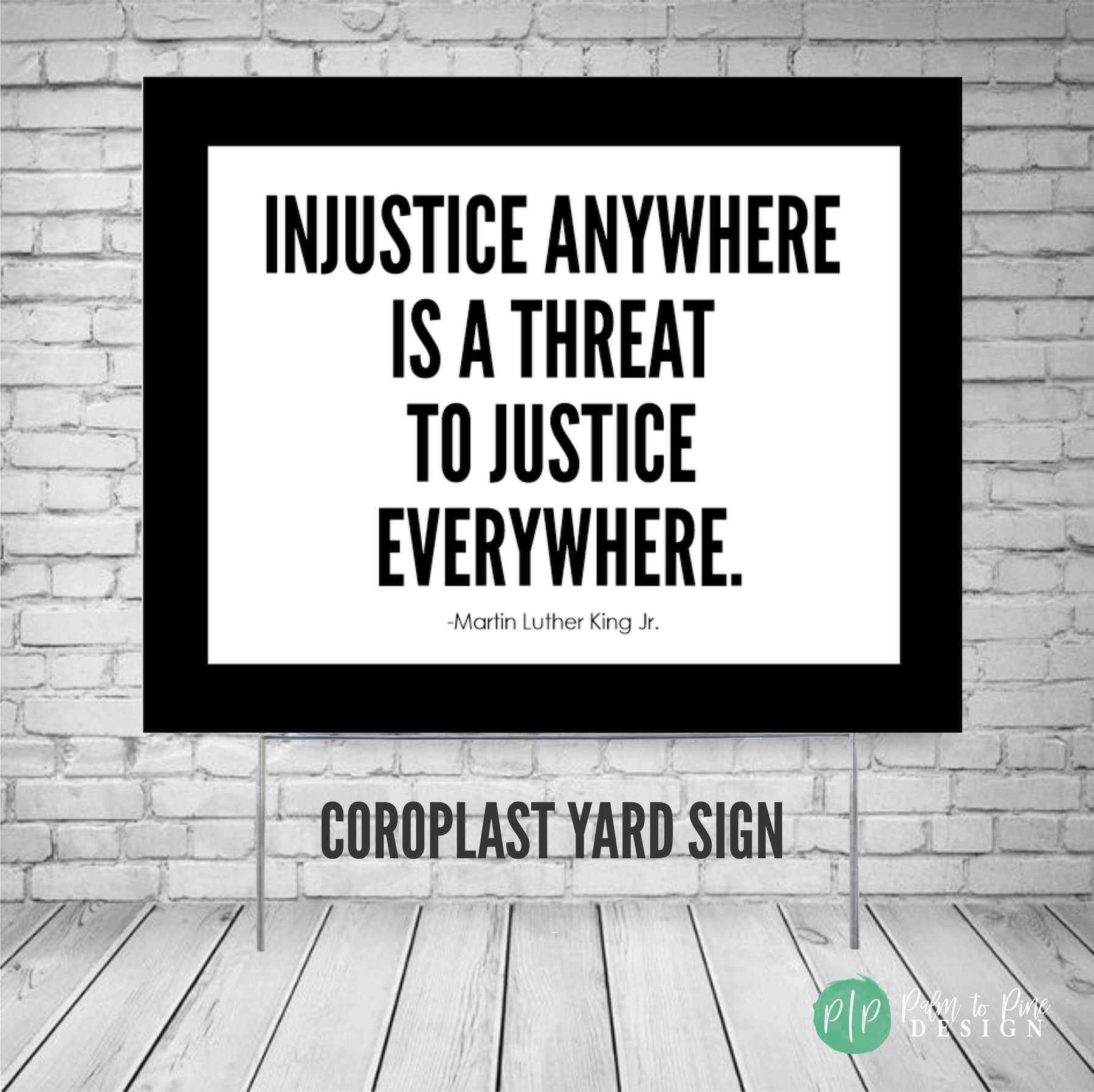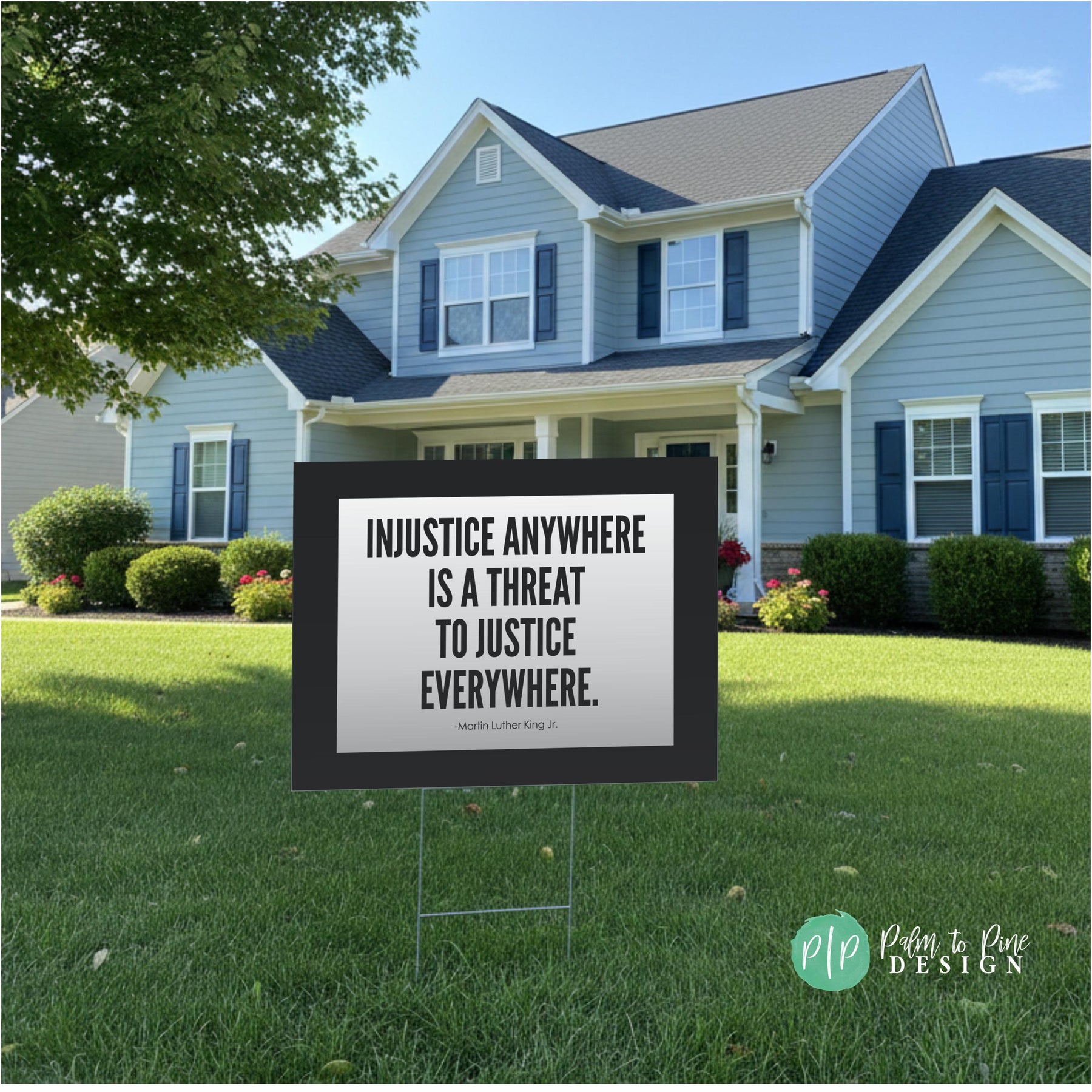 Black and White human rights yard sign reading Injustice anywhere is a threat to justice everywhere