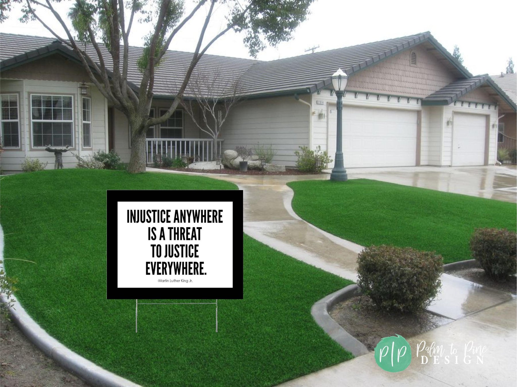 a social justice sign in front of a house with a Martin Luther King Jr. quote about justice, surrounded by a well-maintained lawn and landscaping.