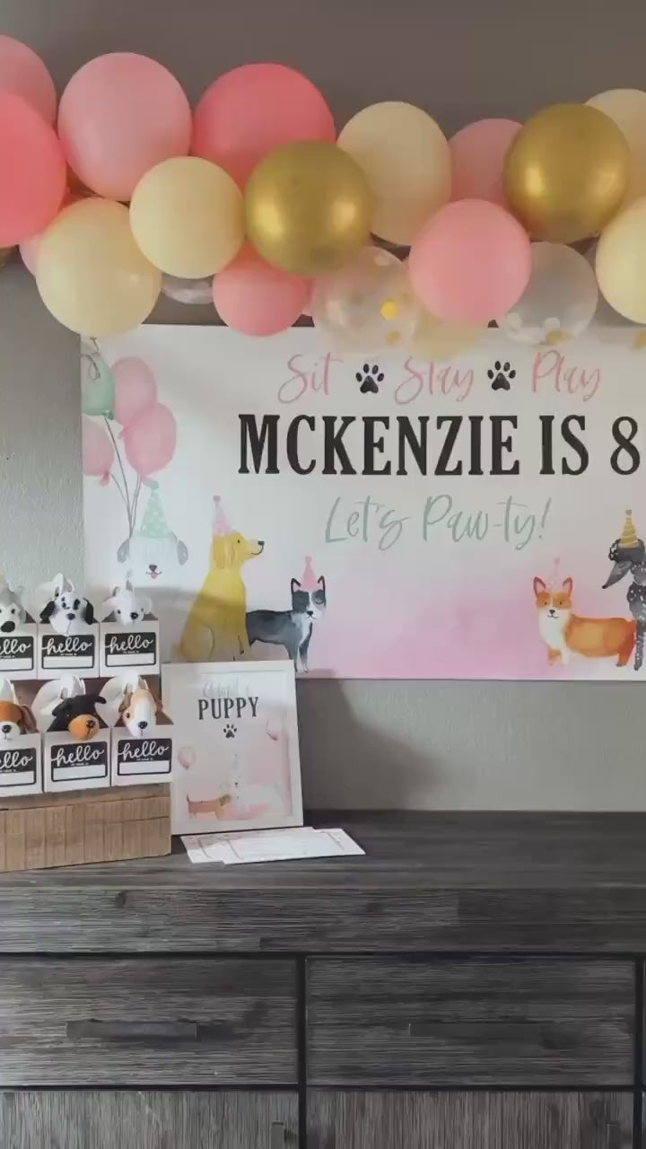 Delight your party guests and make your child's birthday even more memorable with our cute Puppy Birthday Banner, available in multiple colors for boys or girls. Designed with puppy-lovers in mind, this unique banner will be a hit at any dog-themed celebration. With muted watercolors and endearing puppy designs wearing party hats, this custom birthday banner offers a touch of fun and whimsy that children will love. As well as being visually captivating, this banner is crafted from high-quality, durable material for both indoor or outdoor kid's birthday parties. Our Puppy Birthday Banners bring an extra layer of excitement to your child's party and a moment of pure joy when their eyes light up seeing their name on the banner.