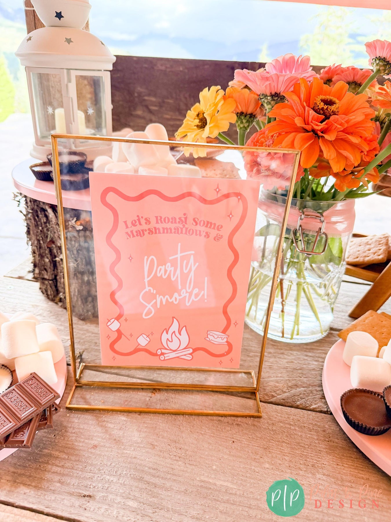 Printable glamping party sign reading “Let’s Roast Some Marshmallows and Party S’more” in coral and pink