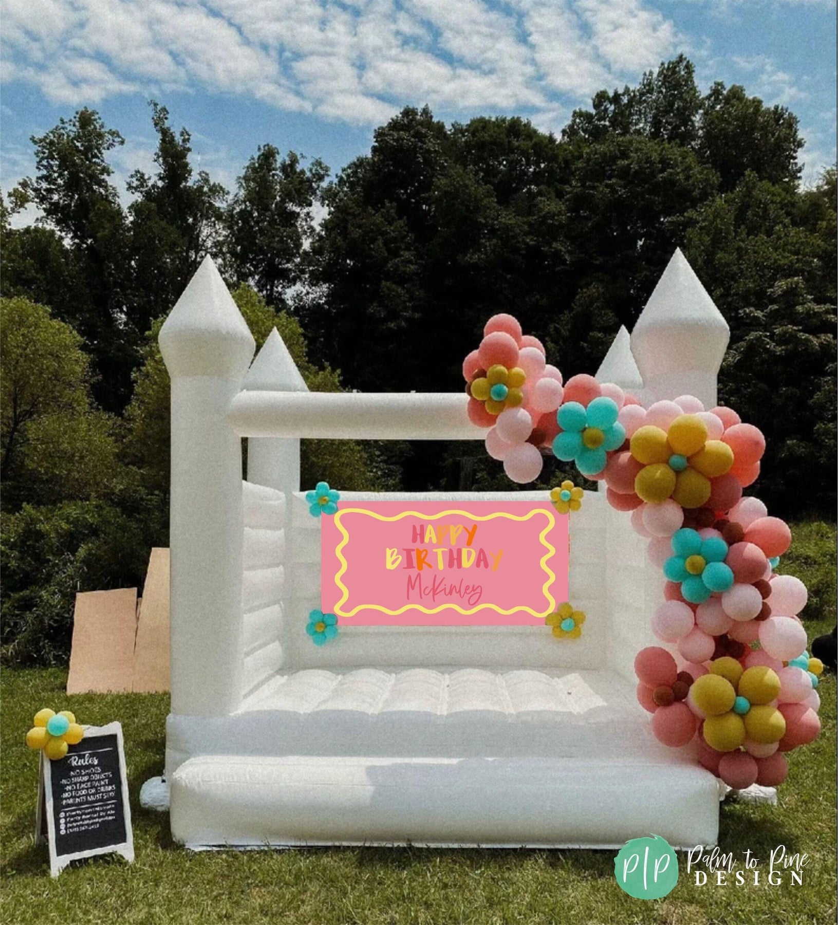 Unique birthday sign with a squiggly wavy design, featuring vibrant colors and a fun, modern aesthetic for party decorations on a white bounce castle with flower balloon garland