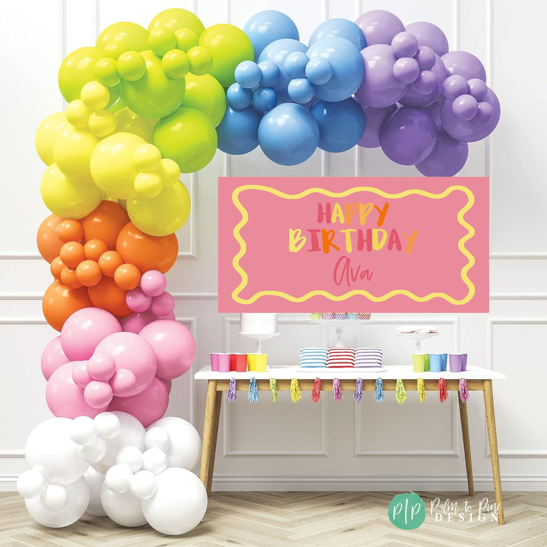 Girls Birthday banner with a playful wavy border, perfect for a modern and fun celebration. Features bold pink, yellow and orange colors and a trendy curved edge design