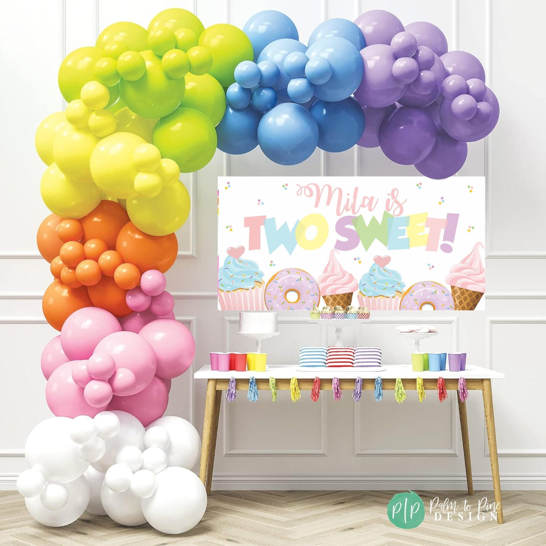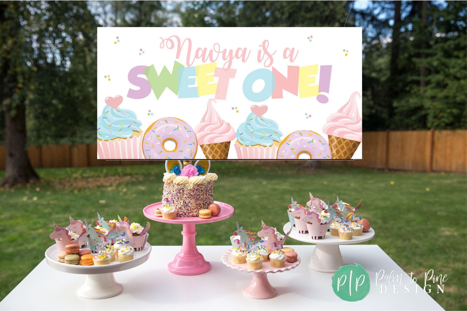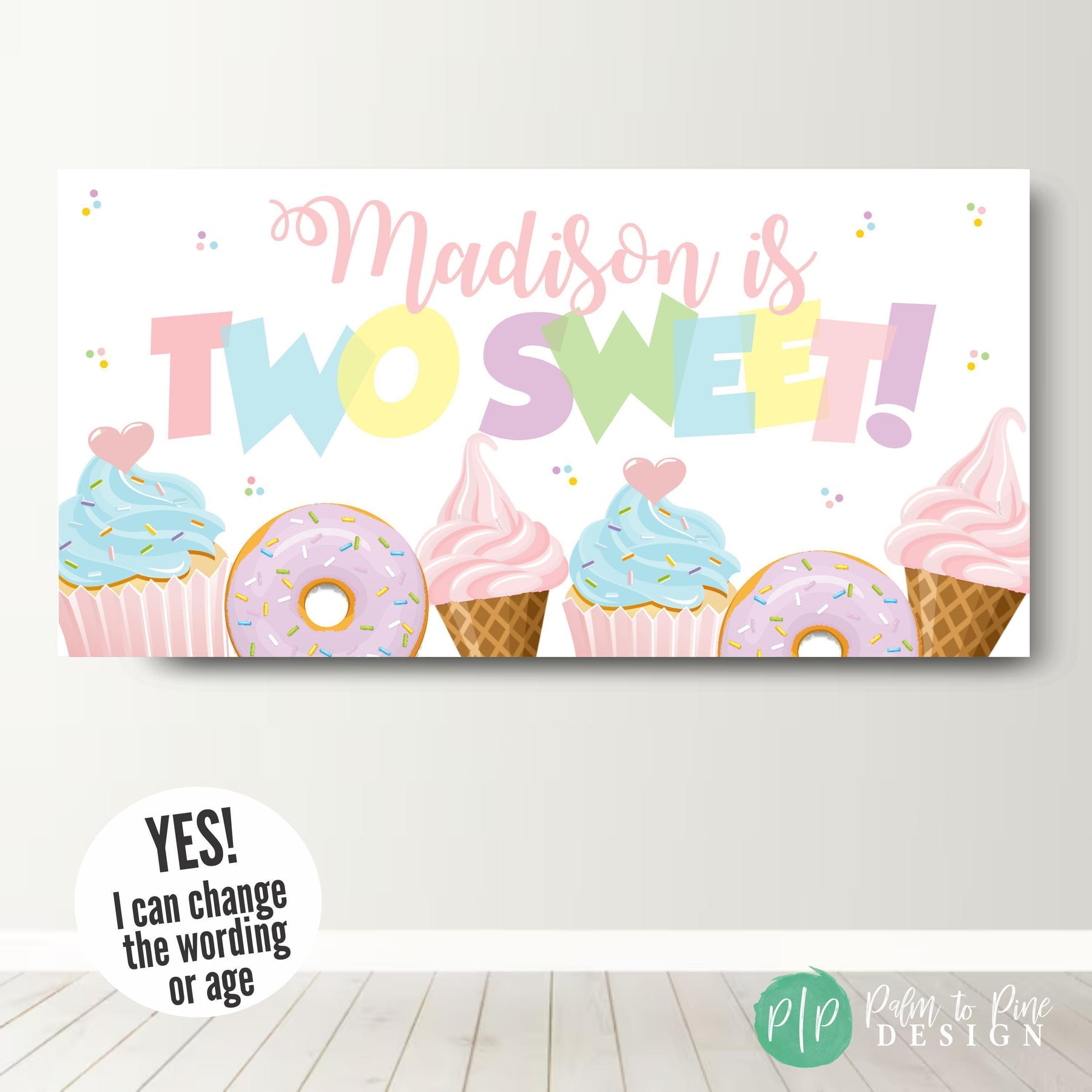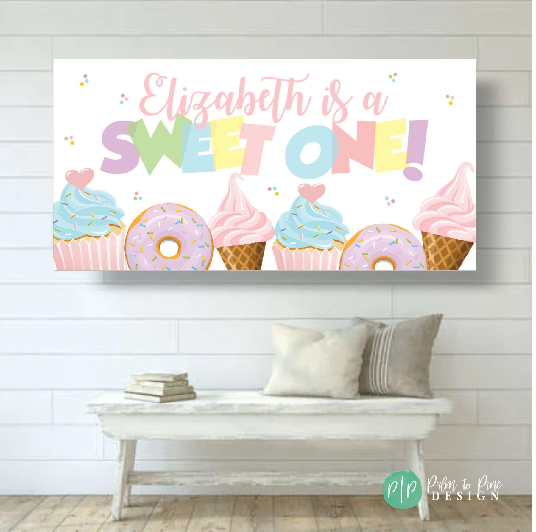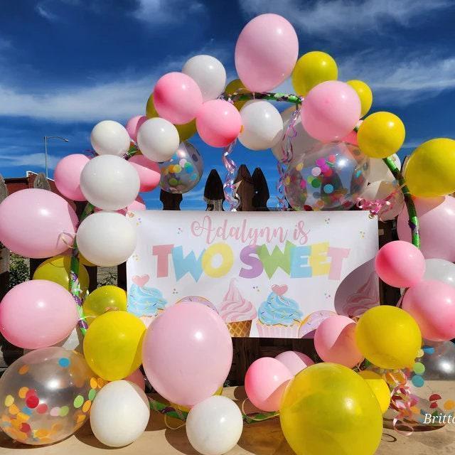 This Sweet One (or Two sweet) ice cream, cupcake and donut personalized birthday banner is a great way to celebrate your birthday girl's first or second birthday! Nothing says "Let's Party" for a little girls birthday than lot's of yummy treats! This vinyl banner is perfect to hang behind a dessert table, front yard or entryway of your birthday celebration! The wording on this birthday banner can be changed to match any occasion or updated for any age, like Four-ever Sweet! Just leave your personalization for this personalized backdrop at checkout!