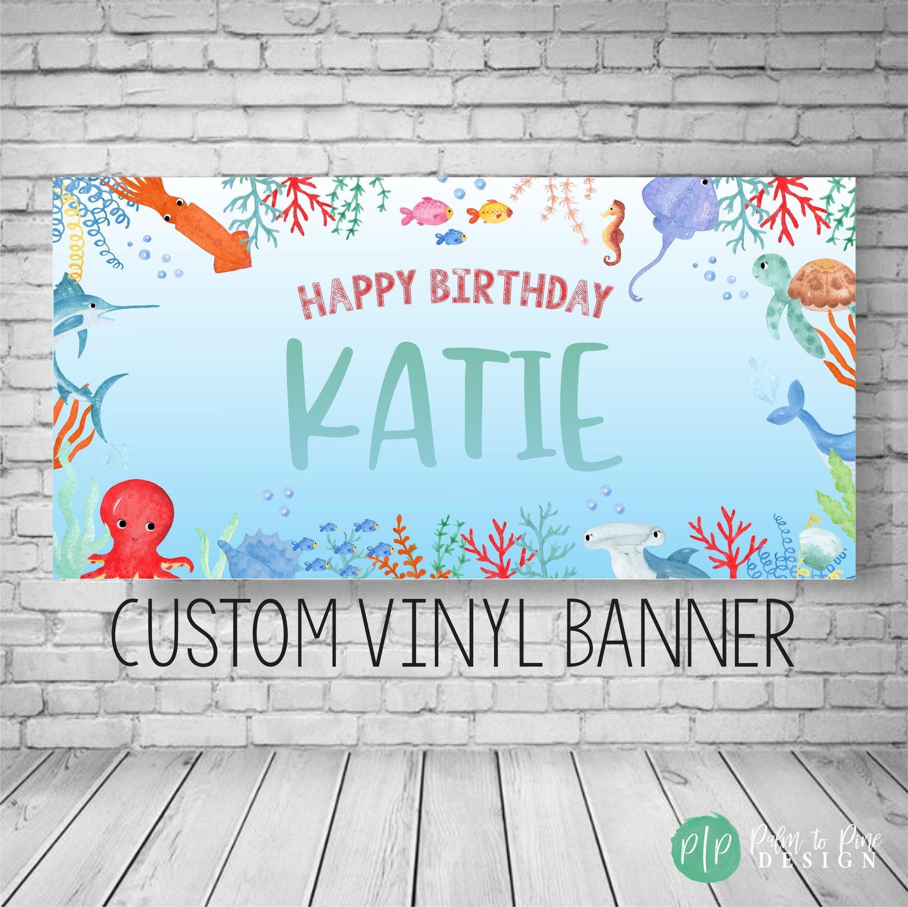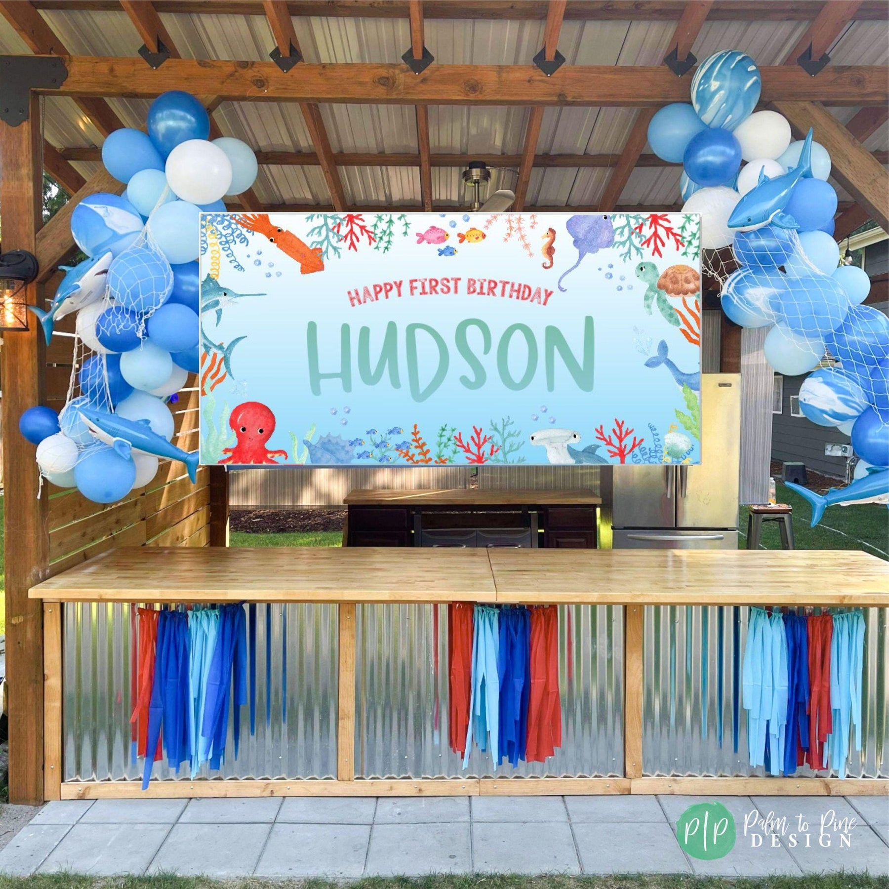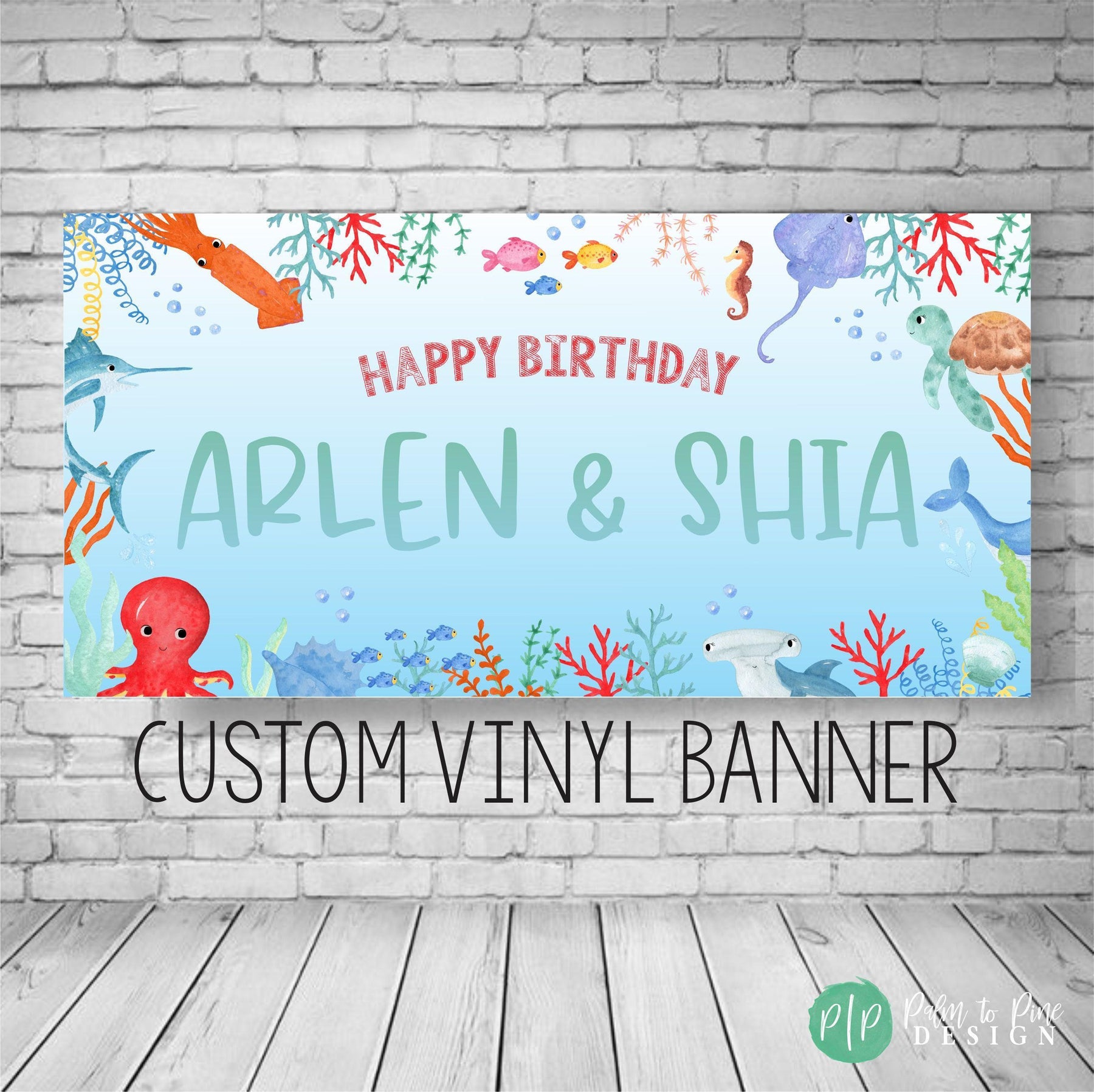 This under the sea banner is the perfect decoration for your sealife birthday party decor! The wording on this ocean birthday backdrop can be personalized for your son, daughter or twins birthday and the colors can be changed for your ocean party! This durable outdoor or indoor banner is perfect for a summer pool party and can be used in front of a dessert table, as a decoration near a pool or as a welcome banner to greet guests at your kids birthday party.