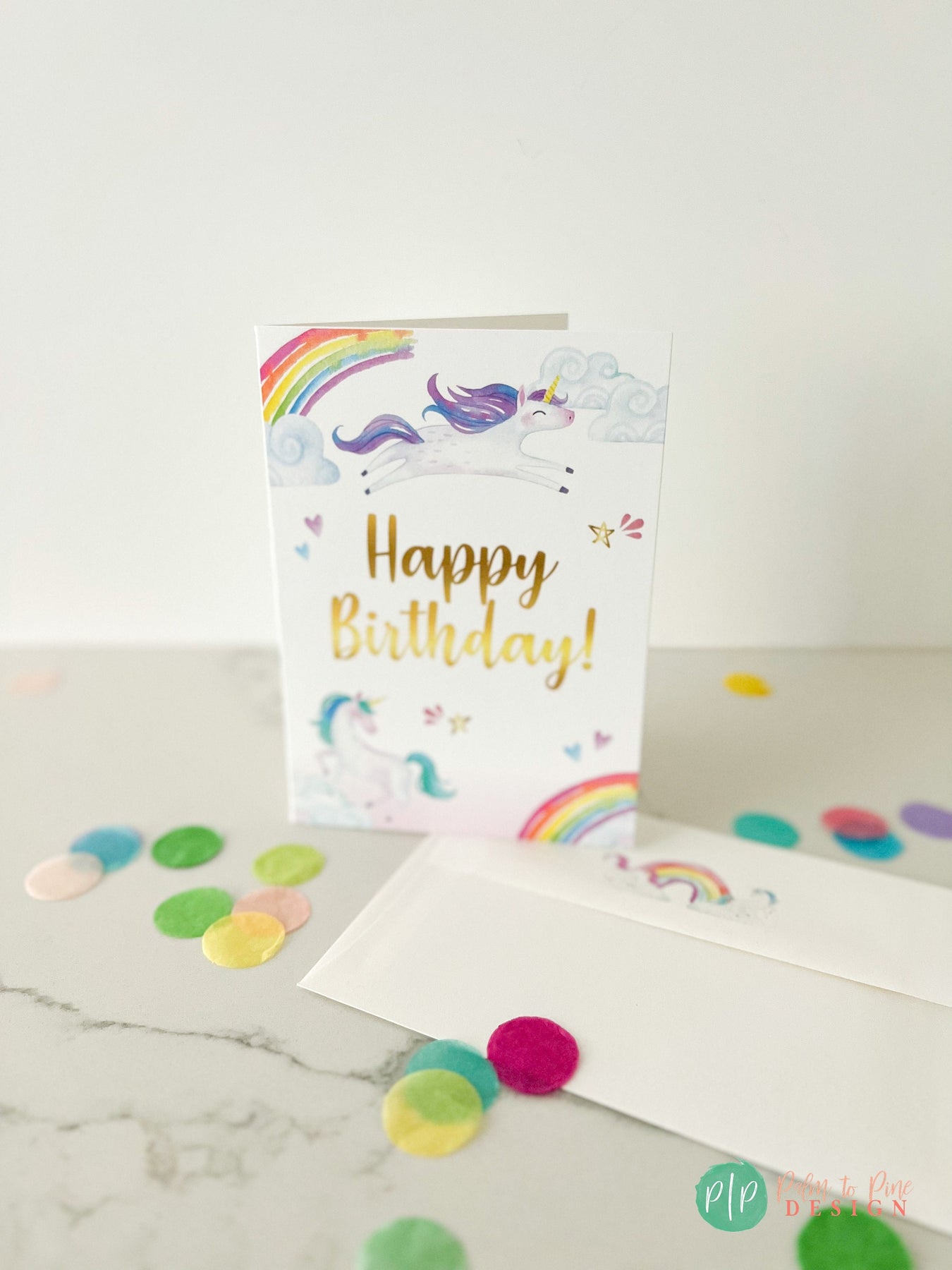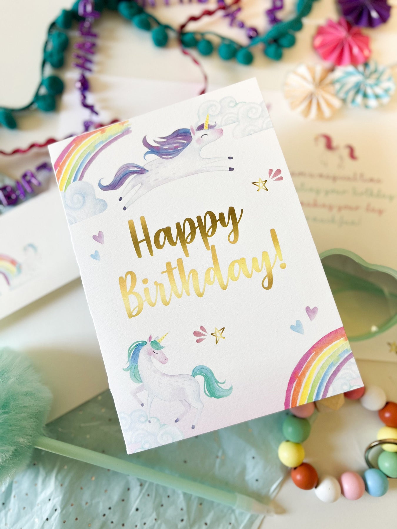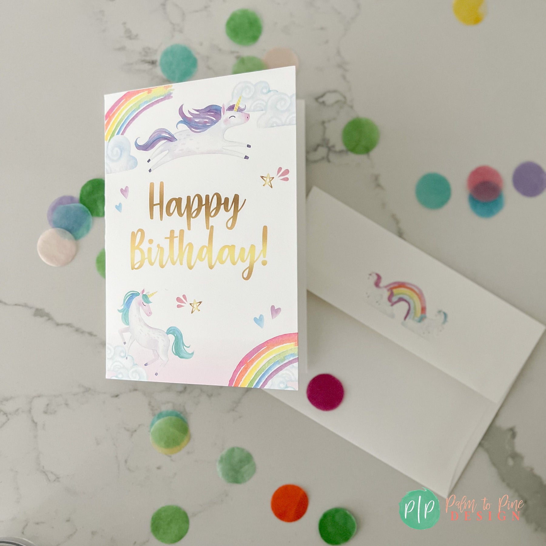 This adorable professionally printed 5x7" folded unicorn greeting card is the perfect way to say Happy Birthday to the unicorn loving girl in your life! This high quality girls birthday greeting card is printed on ultra thick, 120 lb. cardstock and includes a matching custom printed envelope with watercolor unicorn and rainbow clipart. Your birthday girl will love this thoughtful and cute birthday card.