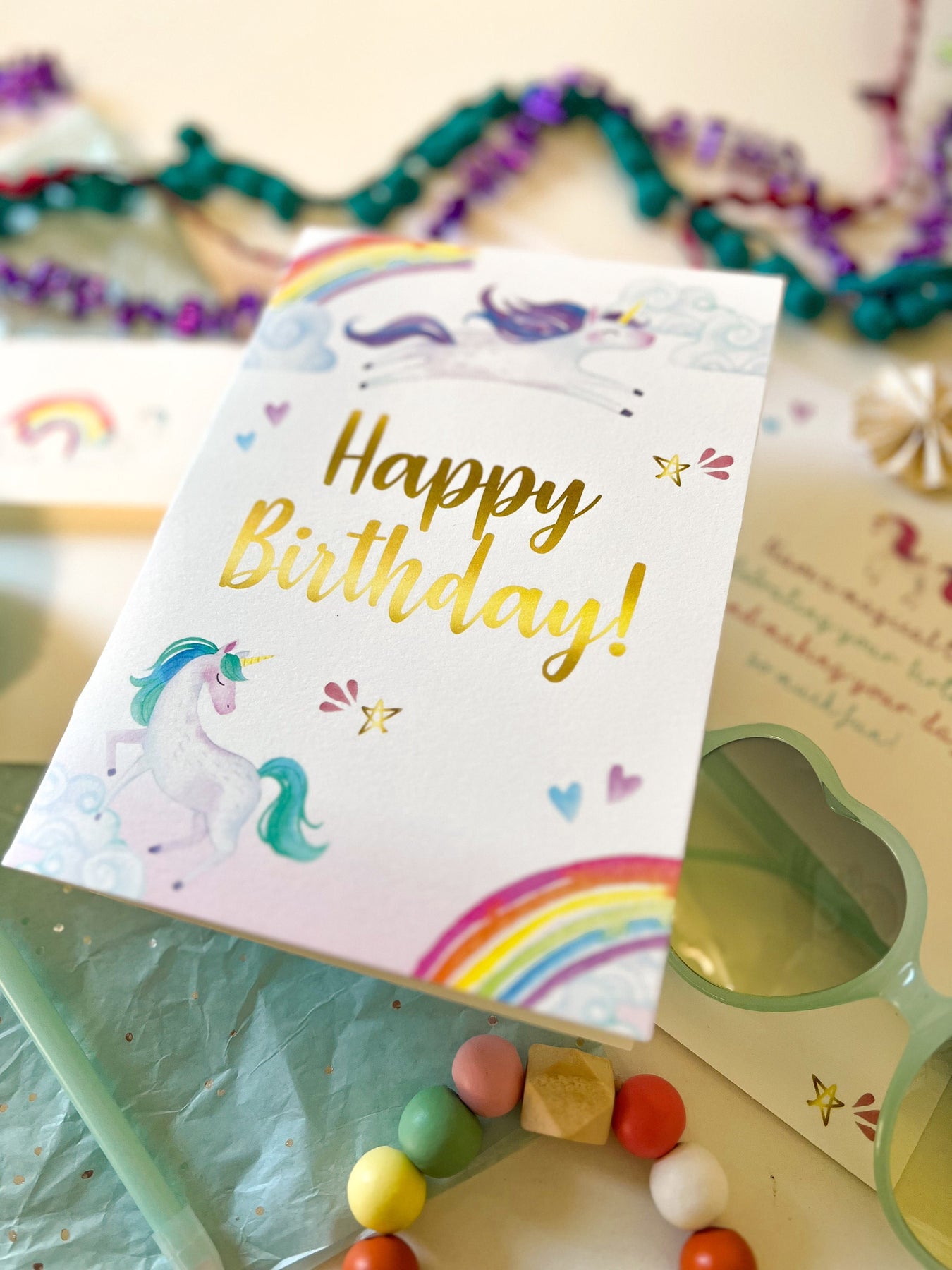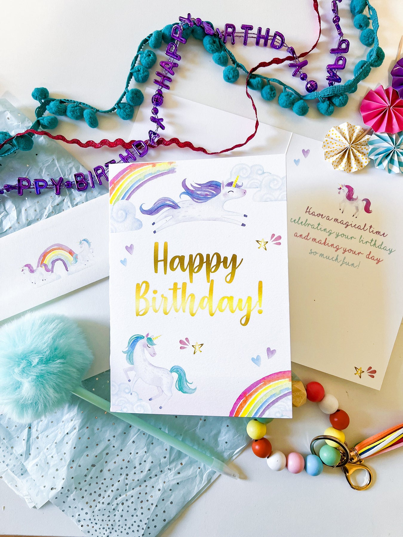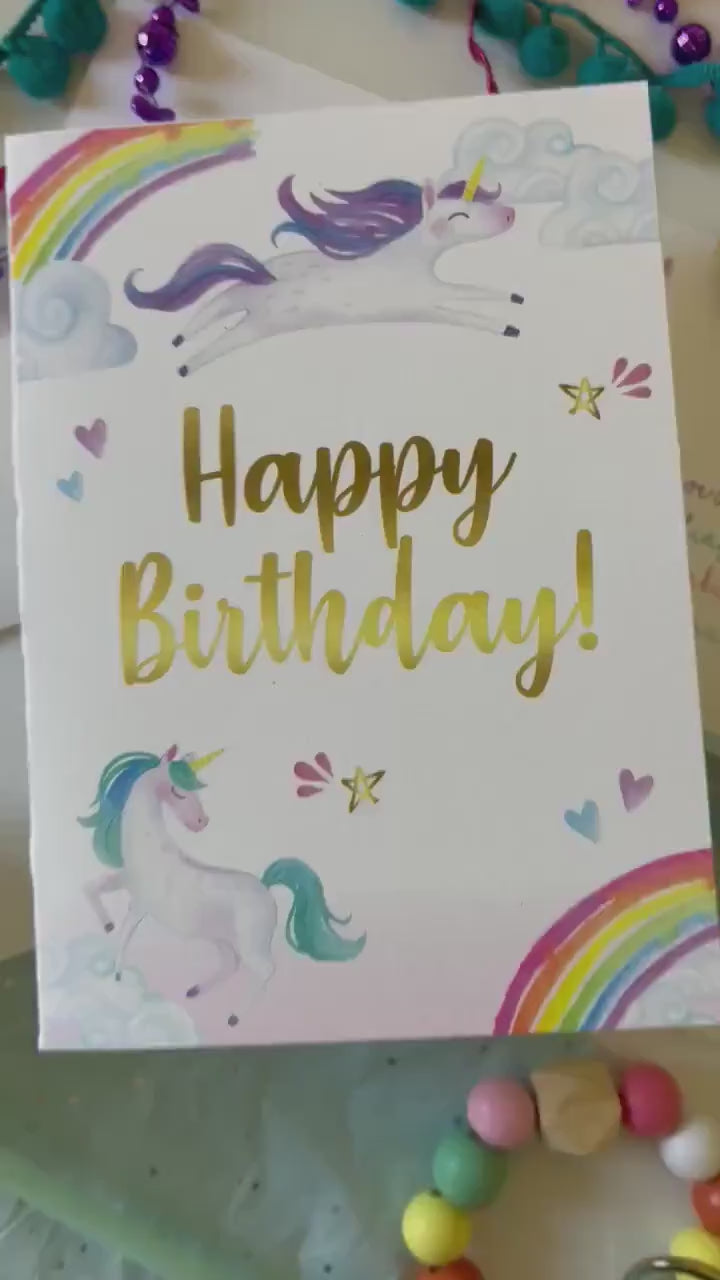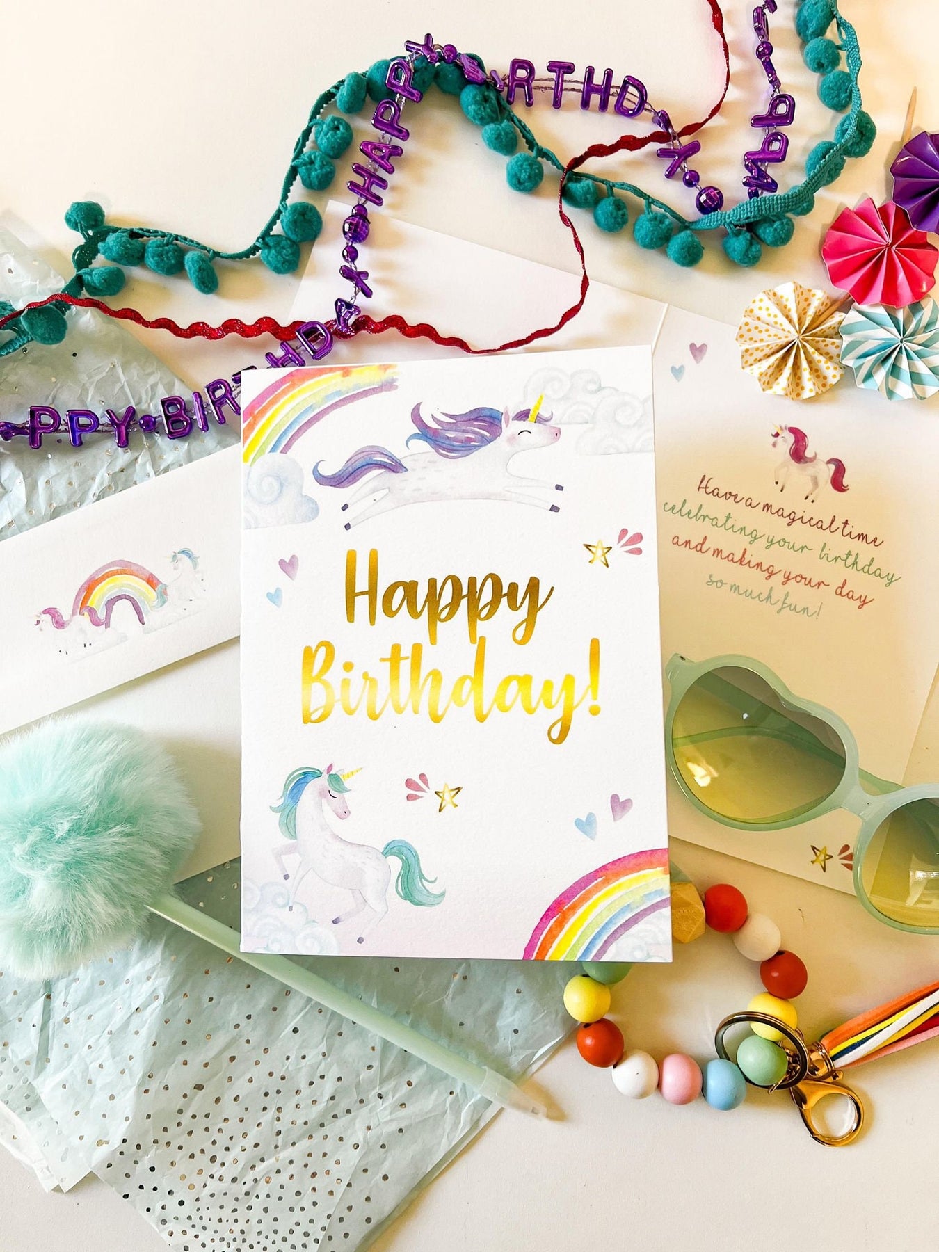 This adorable professionally printed 5x7" folded unicorn greeting card is the perfect way to say Happy Birthday to the unicorn loving girl in your life! This high quality girls birthday greeting card is printed on ultra thick, 120 lb. cardstock and includes a matching custom printed envelope with watercolor unicorn and rainbow clipart. Your birthday girl will love this thoughtful and cute birthday card.