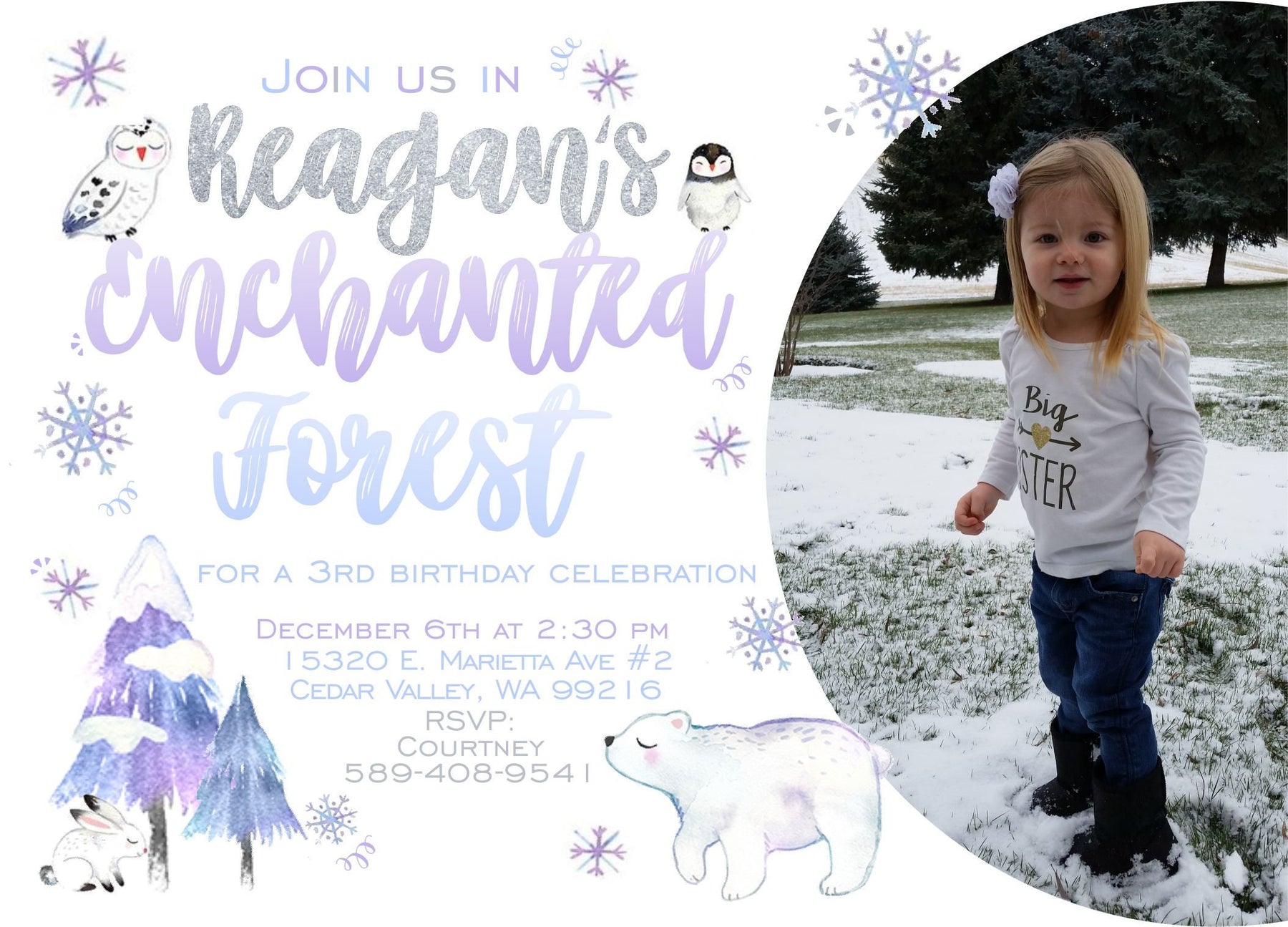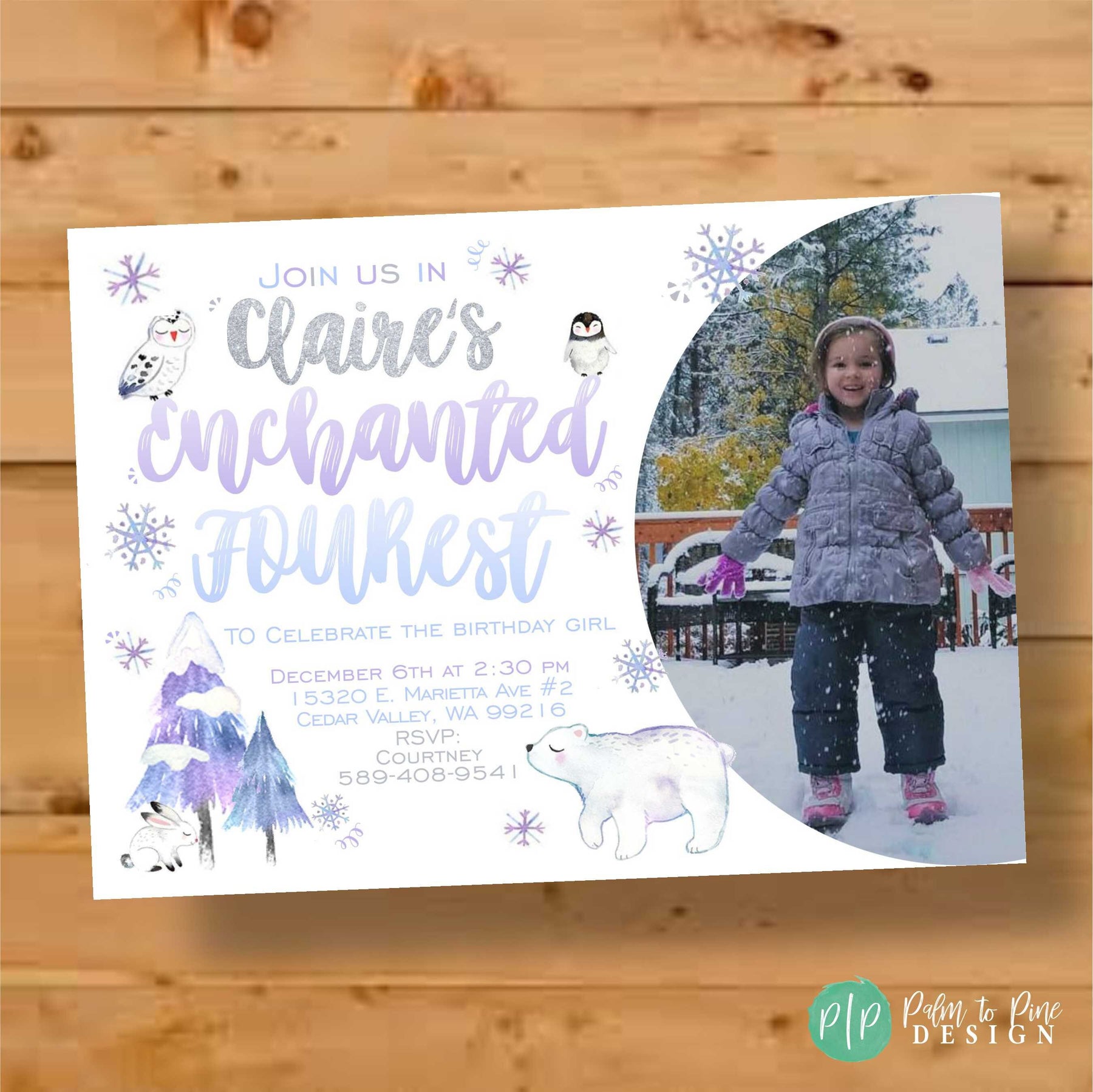 This snowy winter wonderland birthday invite is perfect for you son or daughters winter birthday party. The cute watercolor polar bear and snowy animals with silver snowflakes are perfect to set the theme for a winter ONEderland, or enchanted forest (FOURest). YES!! I can make this invite for any age by changing FOURest to forest or ONEderland (or using your own wording)