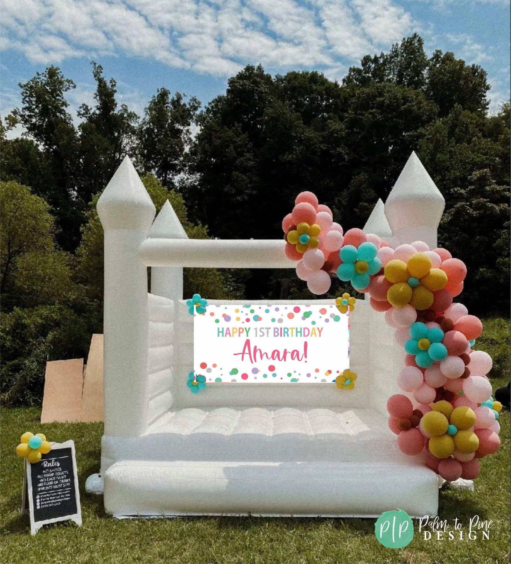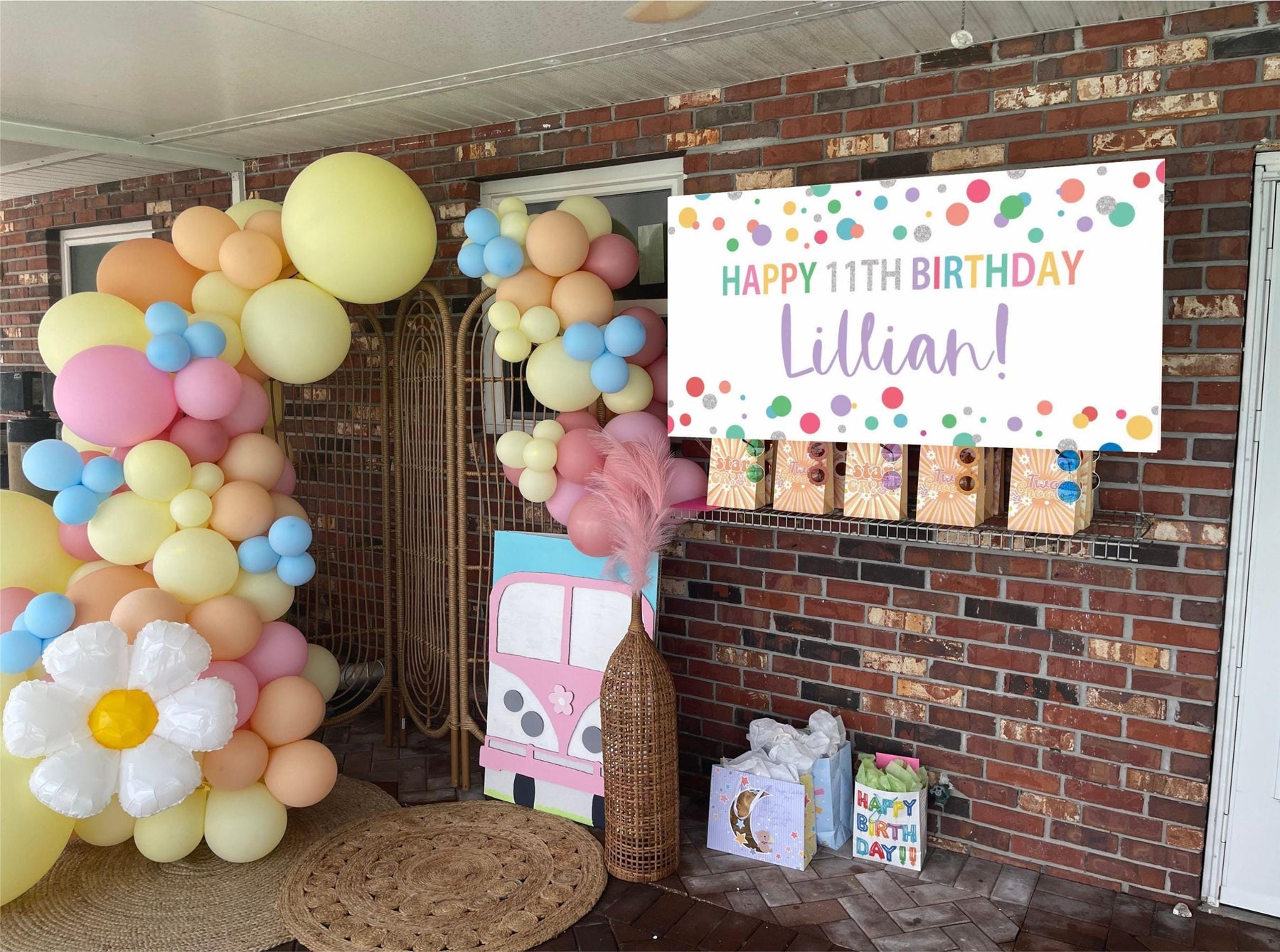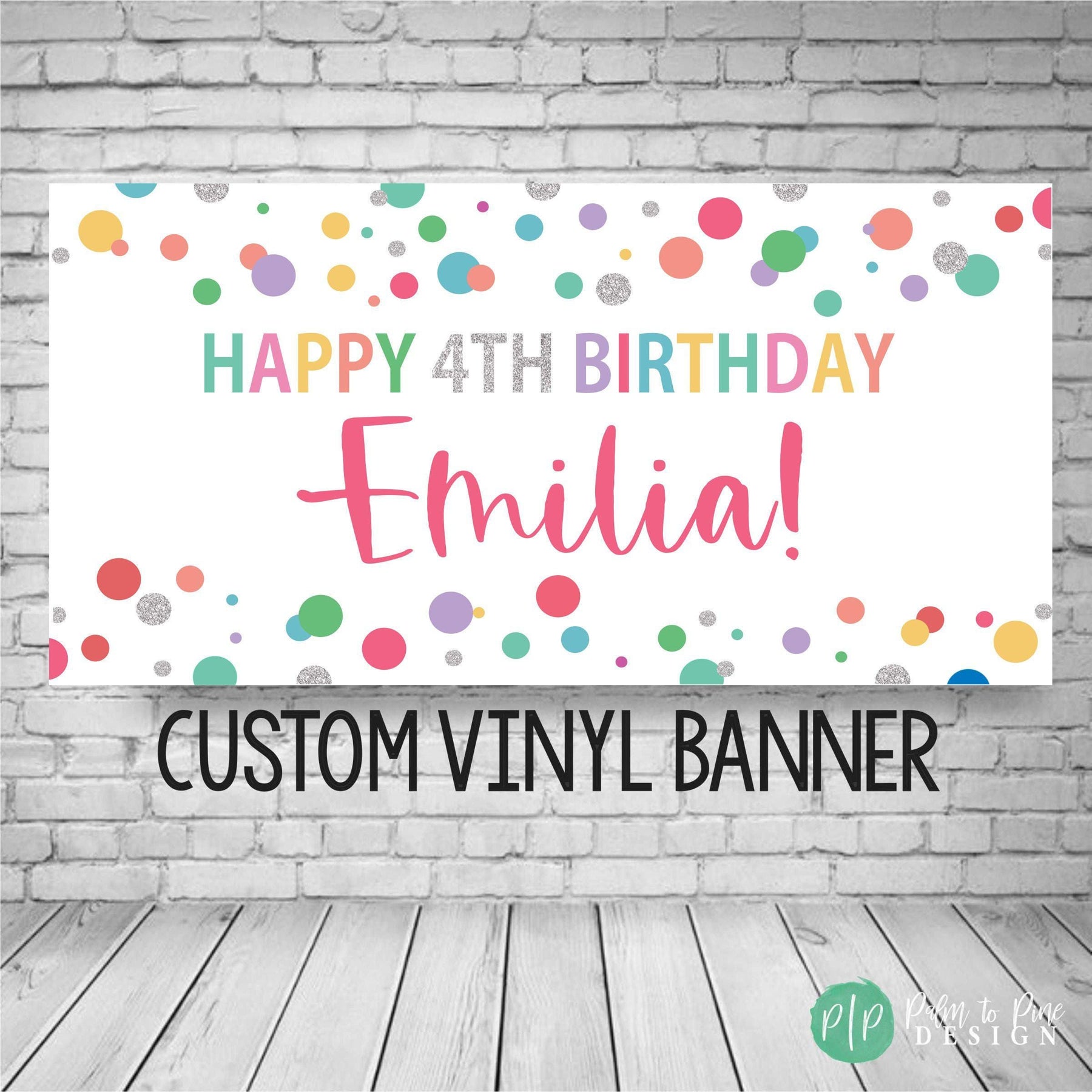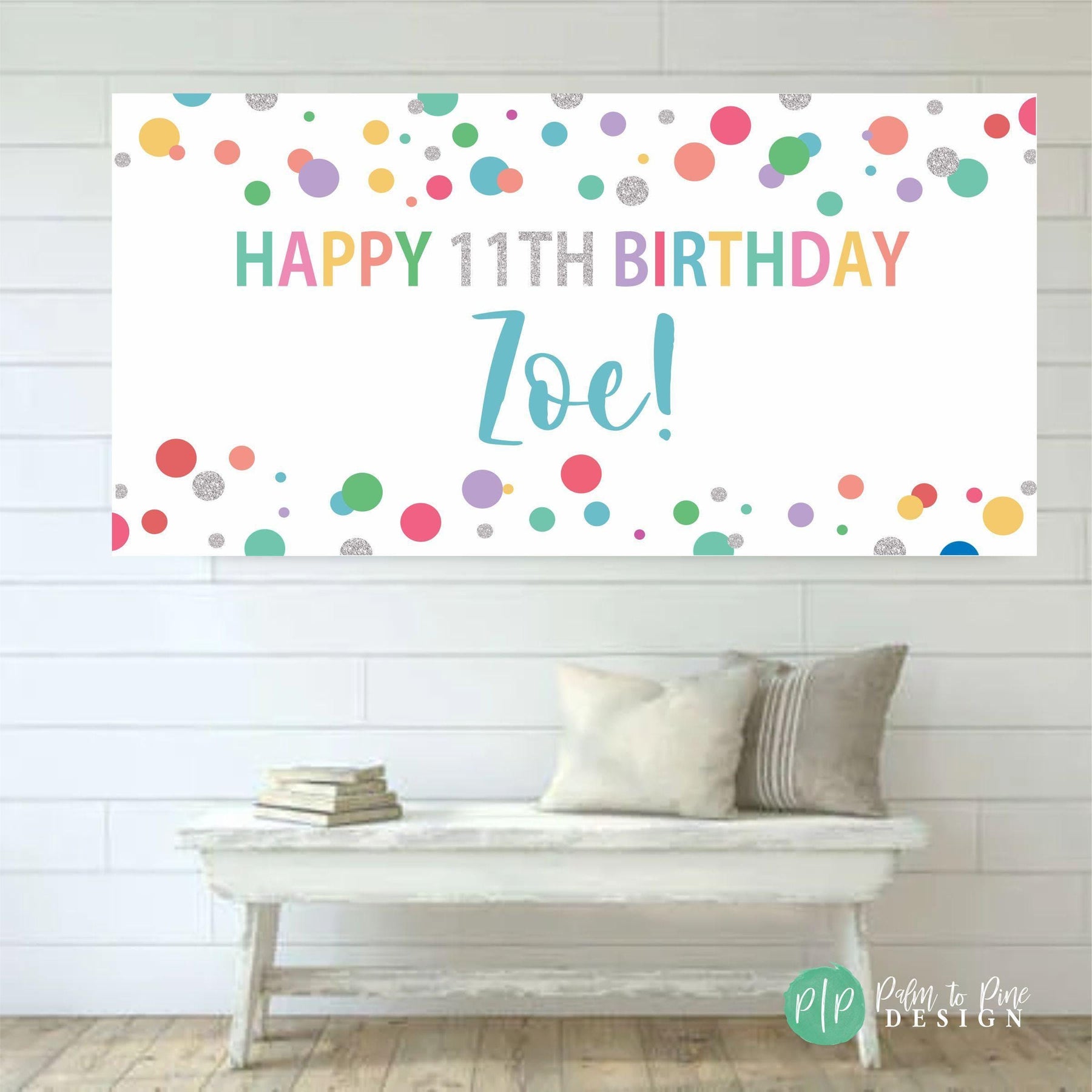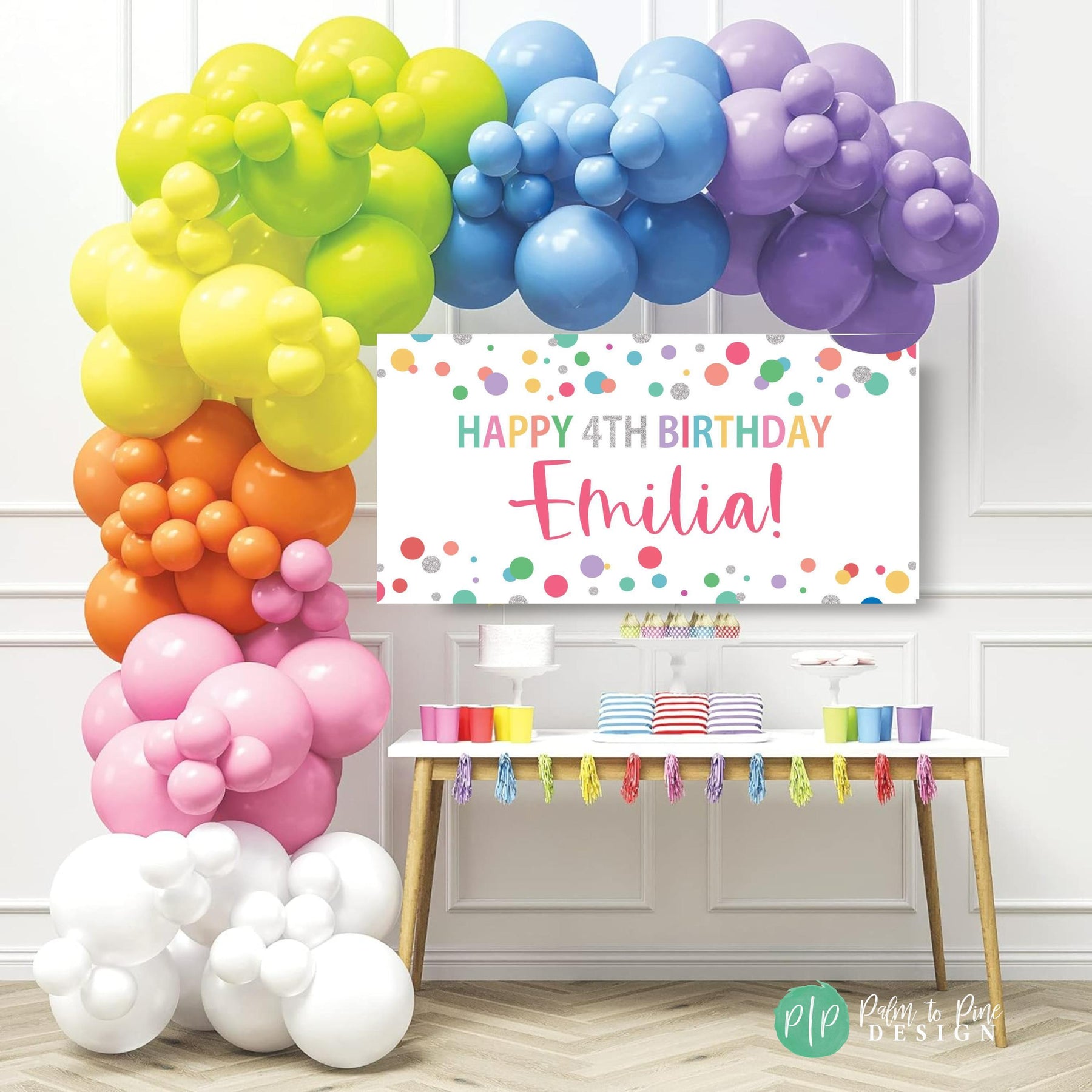 Celebrate your girls birthday with this rainbow personalized birthday banner. The colorful rainbow polka dots make the perfect timeless birthday decoration for celebrating a boy or girls birthday. This colorful banner can be used year after year for birthday decor. Whether you’re decorating for a home celebration or a larger gathering, this banner adds a personal touch that helps add joy to any birthday celebration. It’s easy to hang, customizable with your child’s name & age, and durable enough to keep as a treasured keepsake.