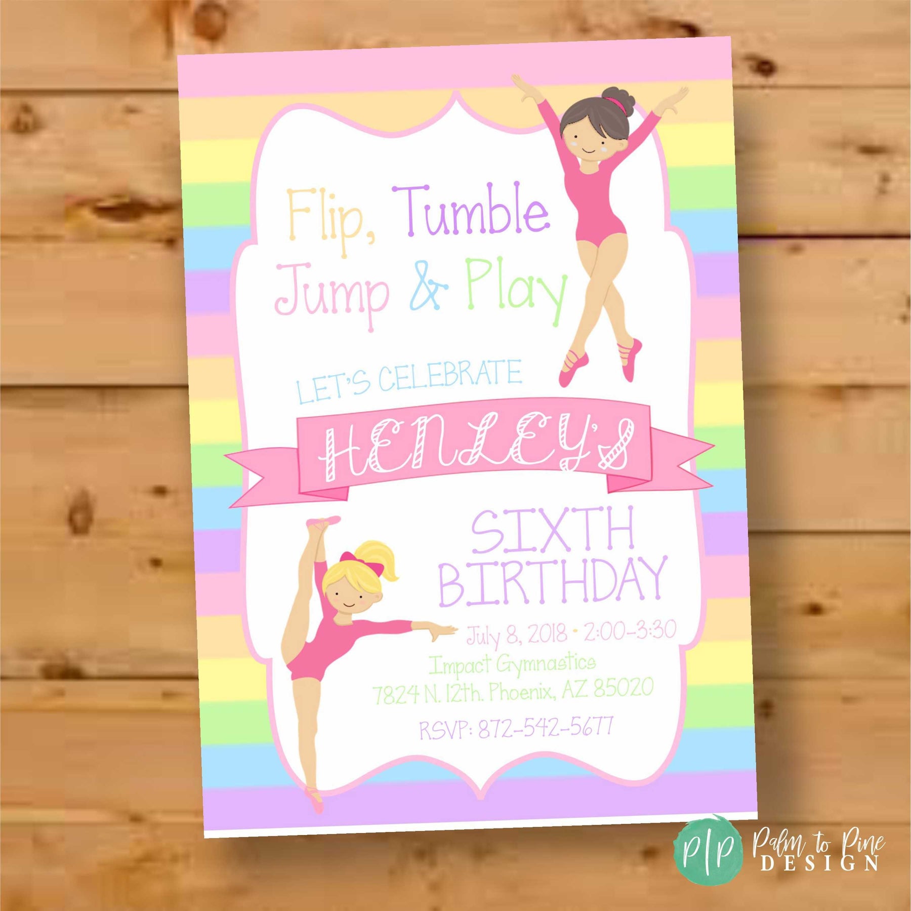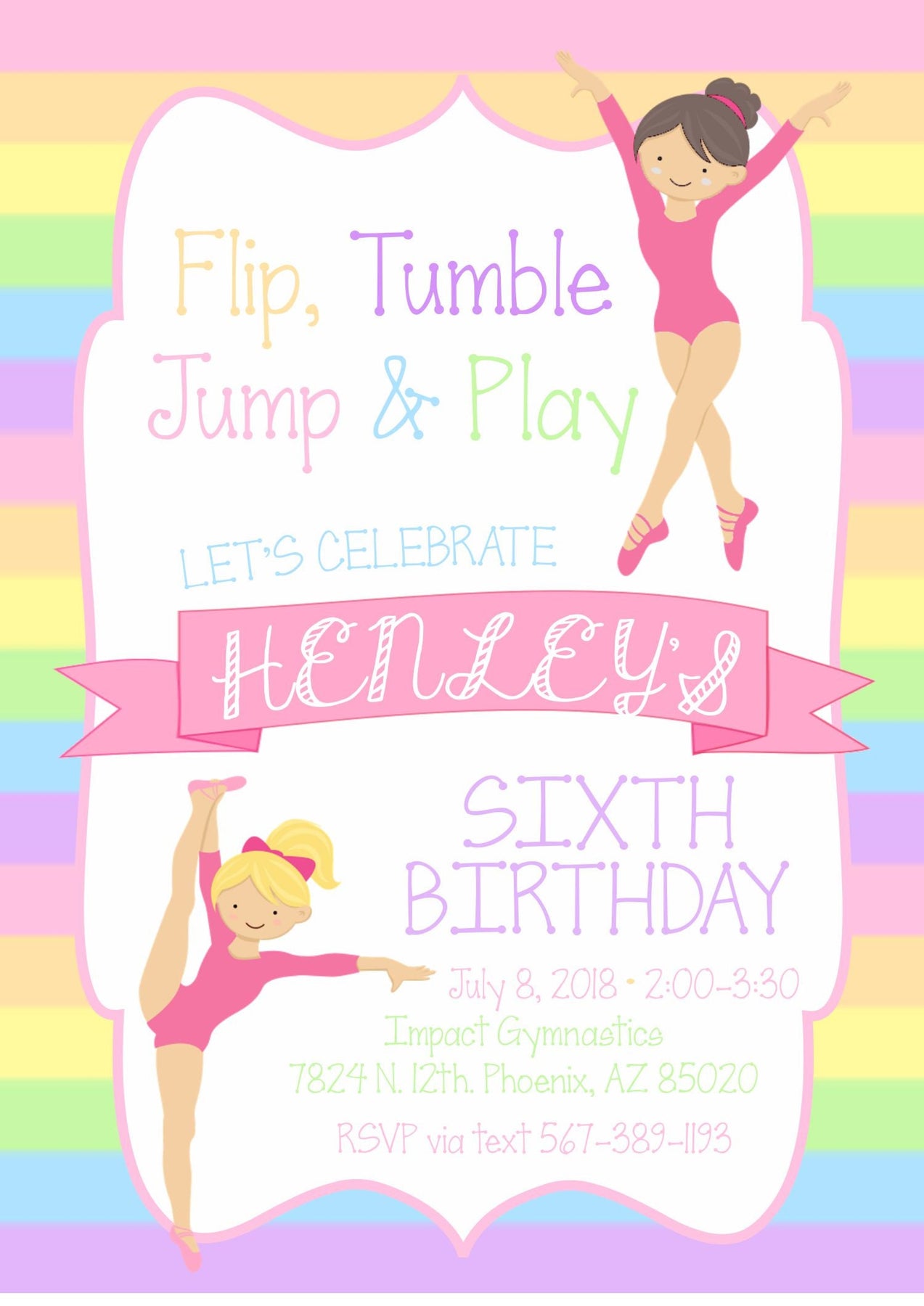 This Gymnastics Birthday Invitation, in pastel, colorful rainbows is perfect for your little gymnasts birthday party. The striped rainbow background, and pink gymnasts set the perfect theme for a gymnastics birthday party. This rainbow gymnast invite is customized for your little girls birthday party and is great for any age birthday party, not just a sixth birthday!