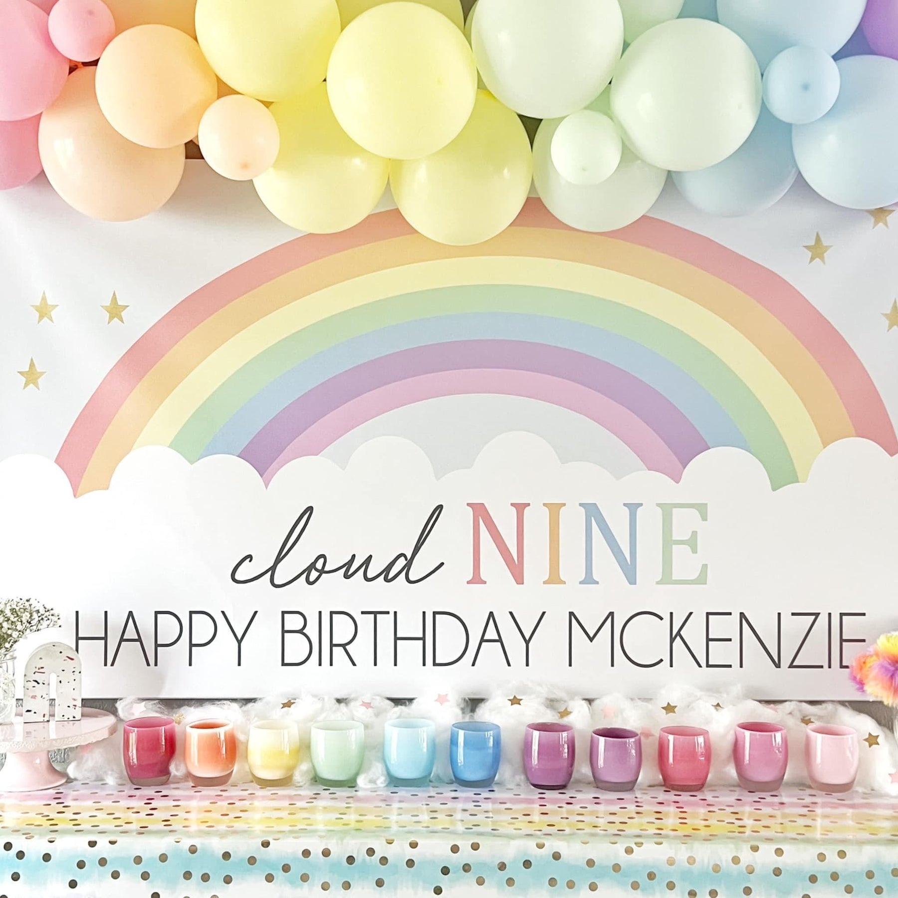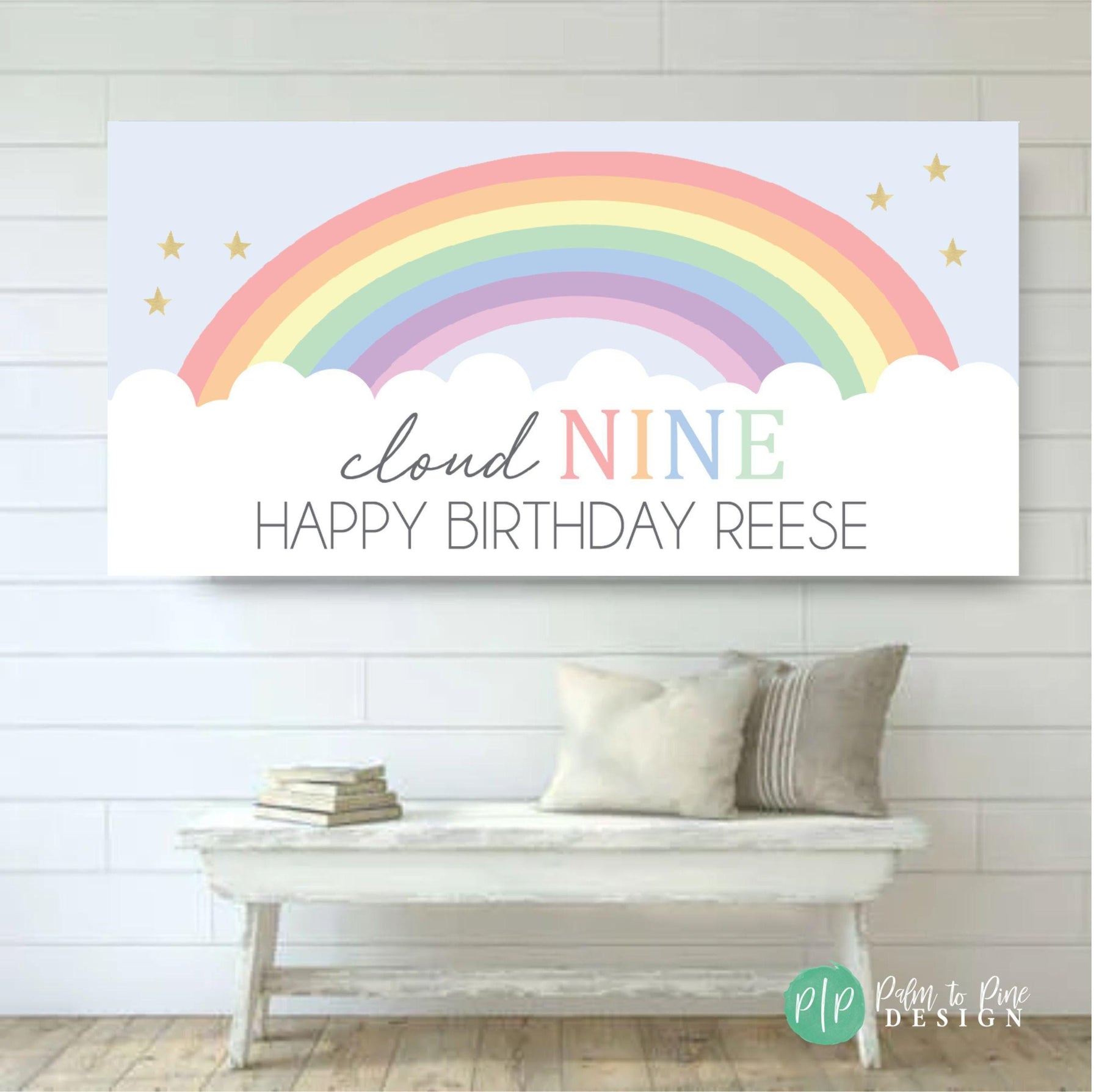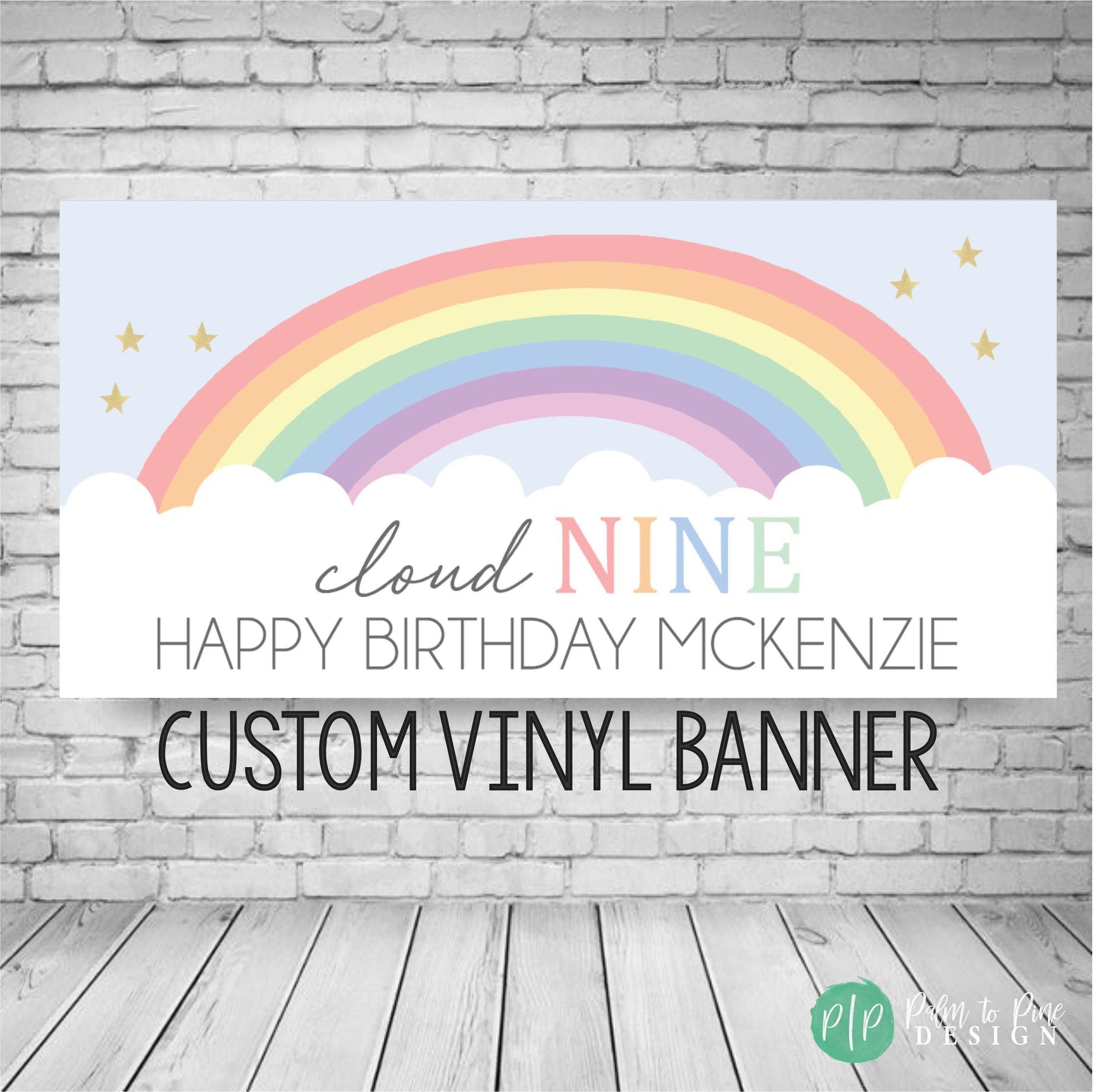 This personalized rainbow birthday banner is perfect for your rainbow themed party! The rainbow, clouds and stars make the perfect decoration for your rainbow birthday party. Use this durable vinyl banner for a outdoor welcome sign at a rainbow Cloud Nine party, first birthday party or baby shower.. the options are endless with the customizable wording! Use this rainbow banner as a photo backdrop for pictures or this vinyl banner makes the perfect decoration for behind a dessert table or as a lawn sign at rainbow party. The colors won't fade in the sun and the banner can be hung in your little girls bedroom after the party is over!