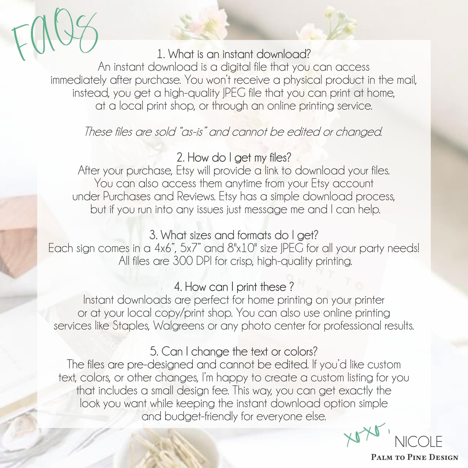 Each sign comes in a 4x6”, 5x7” and 8"x10" size JPEG for all your party needs!