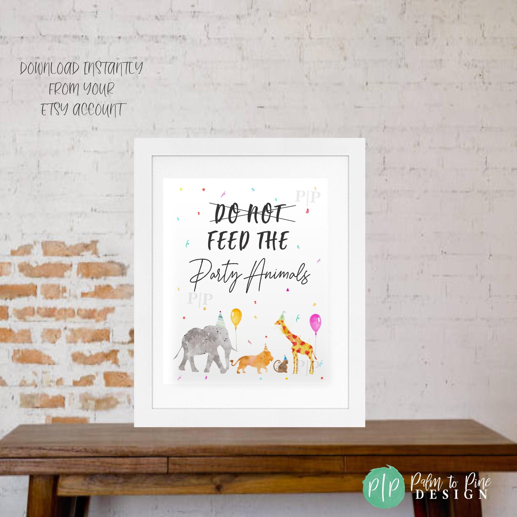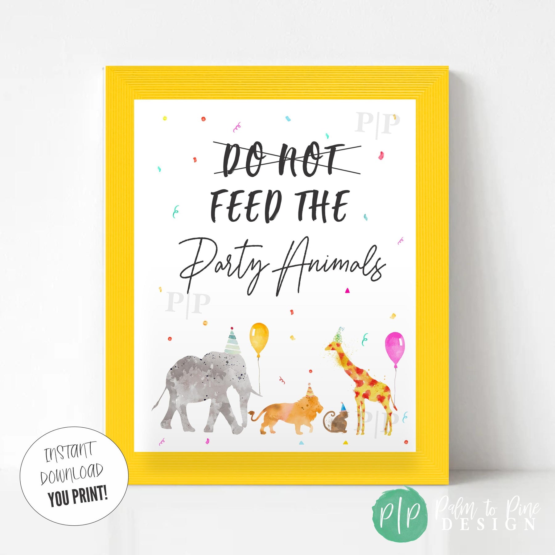 This jungle safari themed "Do Not Feed the Party Animals" birthday sign is the perfect decoration for your kids zoo or jungle birthday party. The watercolor jungle themed party animals are ready to celebrate with their animal party hats and balloons and this sign makes a great photo backdrop, dessert table decoration, or blown up into poster size and hung on the door to greet guests.