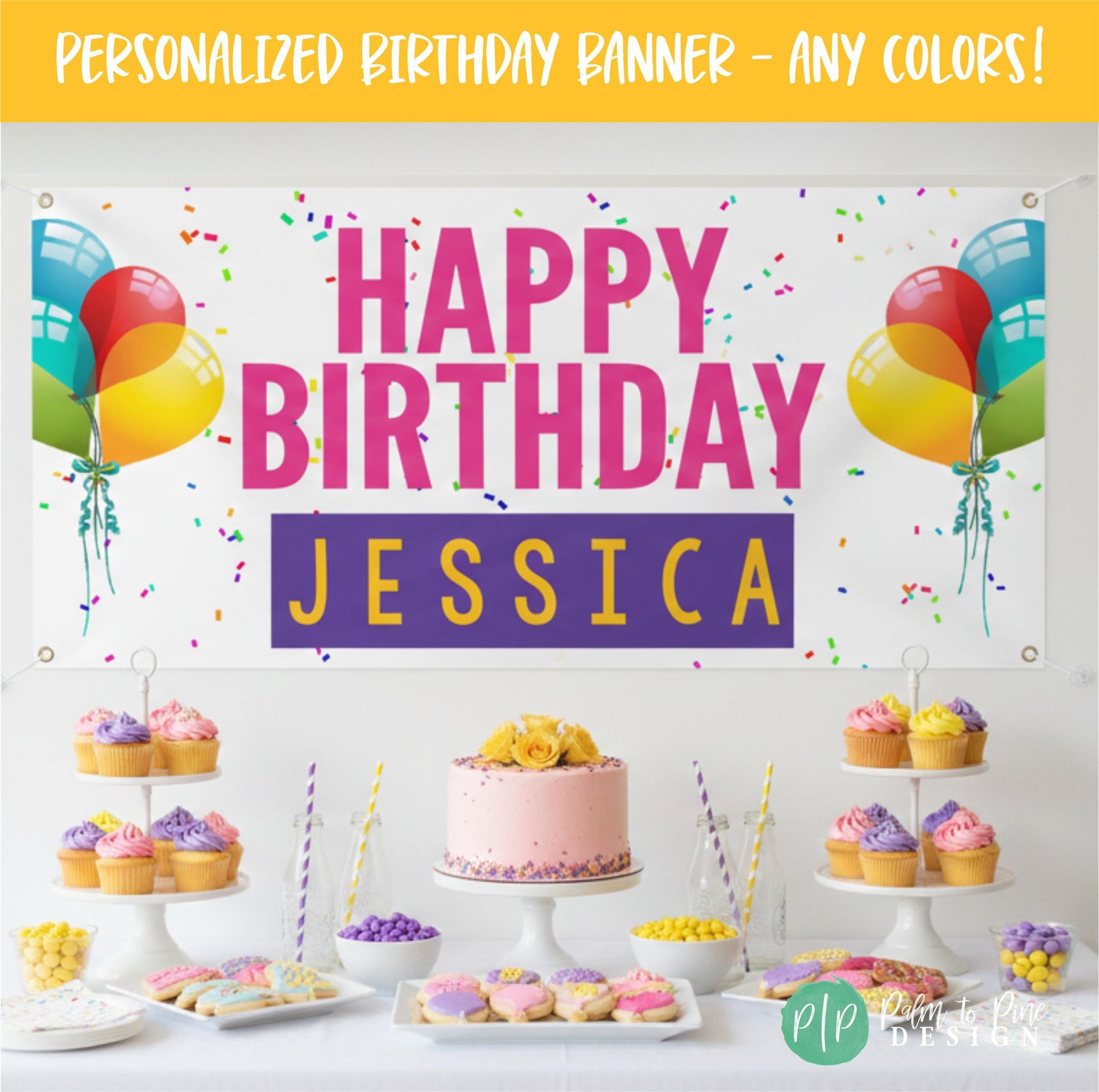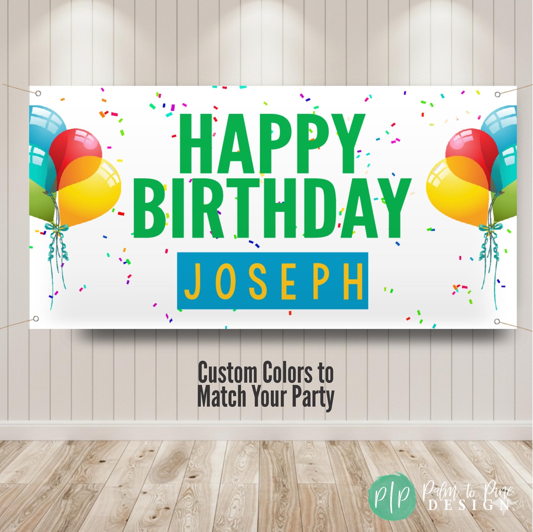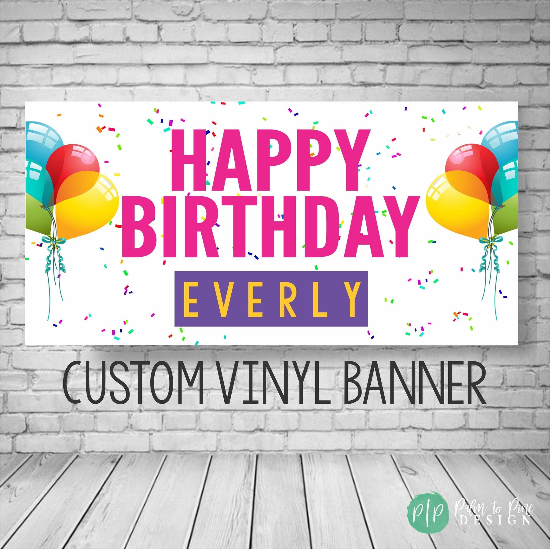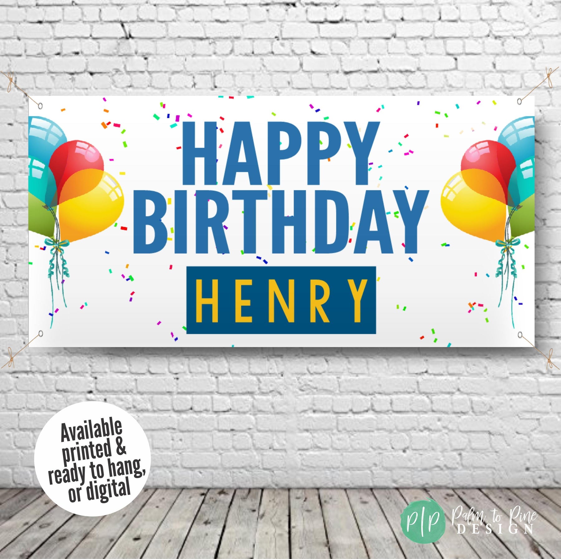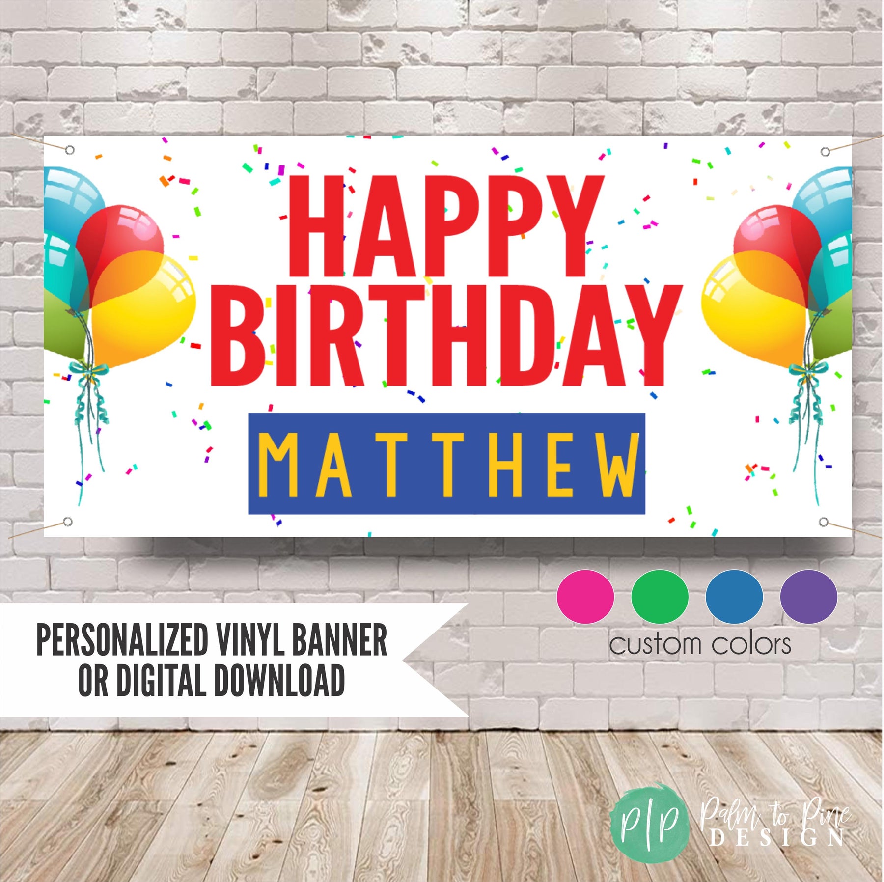 Celebrate in style with a Personalized Birthday Party Banner with balloons and confetti, designed for the ultimate celebration for any age. This beautifully designed banner will add a vibrant splash of color to your party decor and the design is perfect to be used year after year as a fun birthday tradition. This vinyl banner is available digitally or professionally printed and is sure to be a standout piece in your celebration with custom colors to match your party theme and perfect for kids and adults! Our banners include grommets and are easy to hang, making your party setup a breeze.