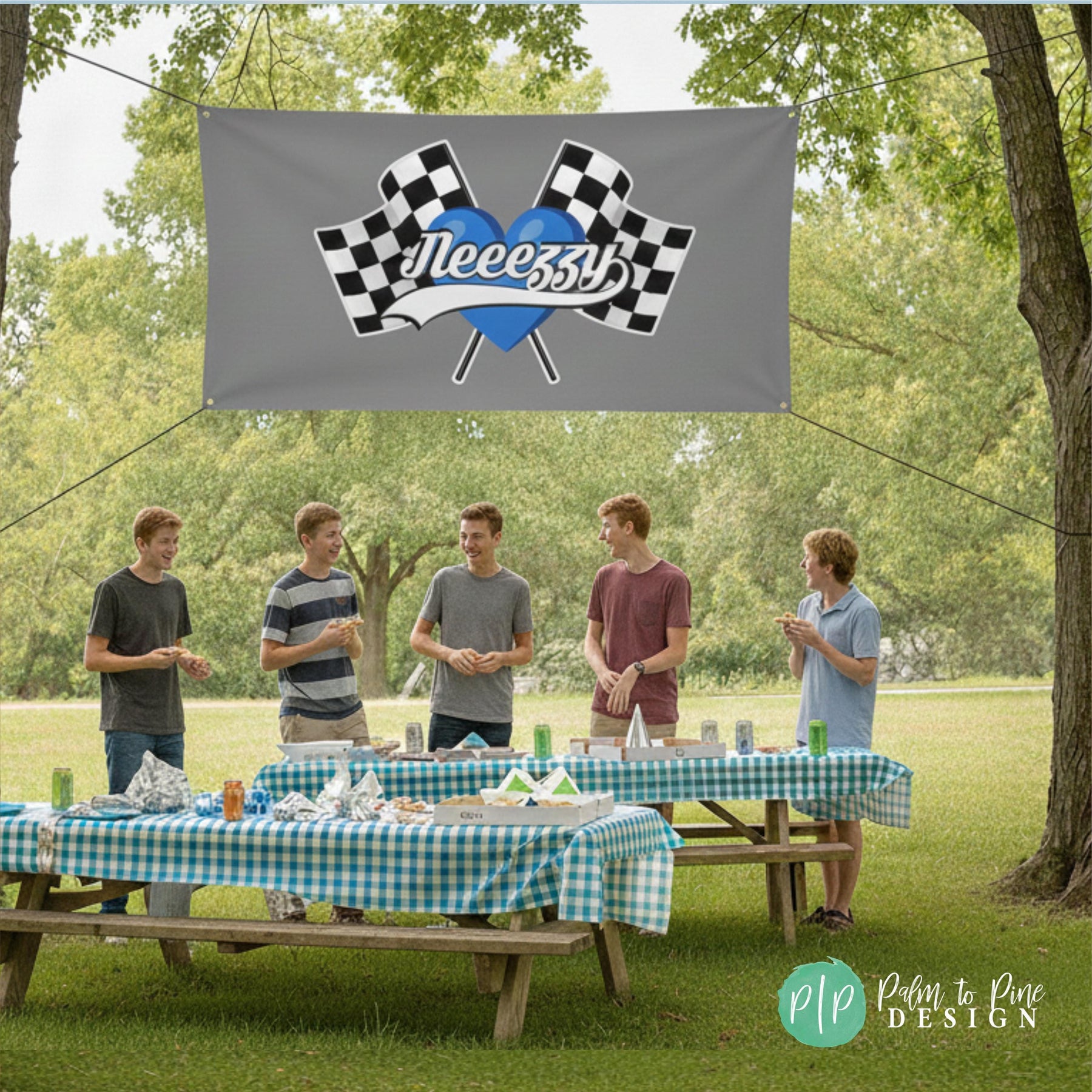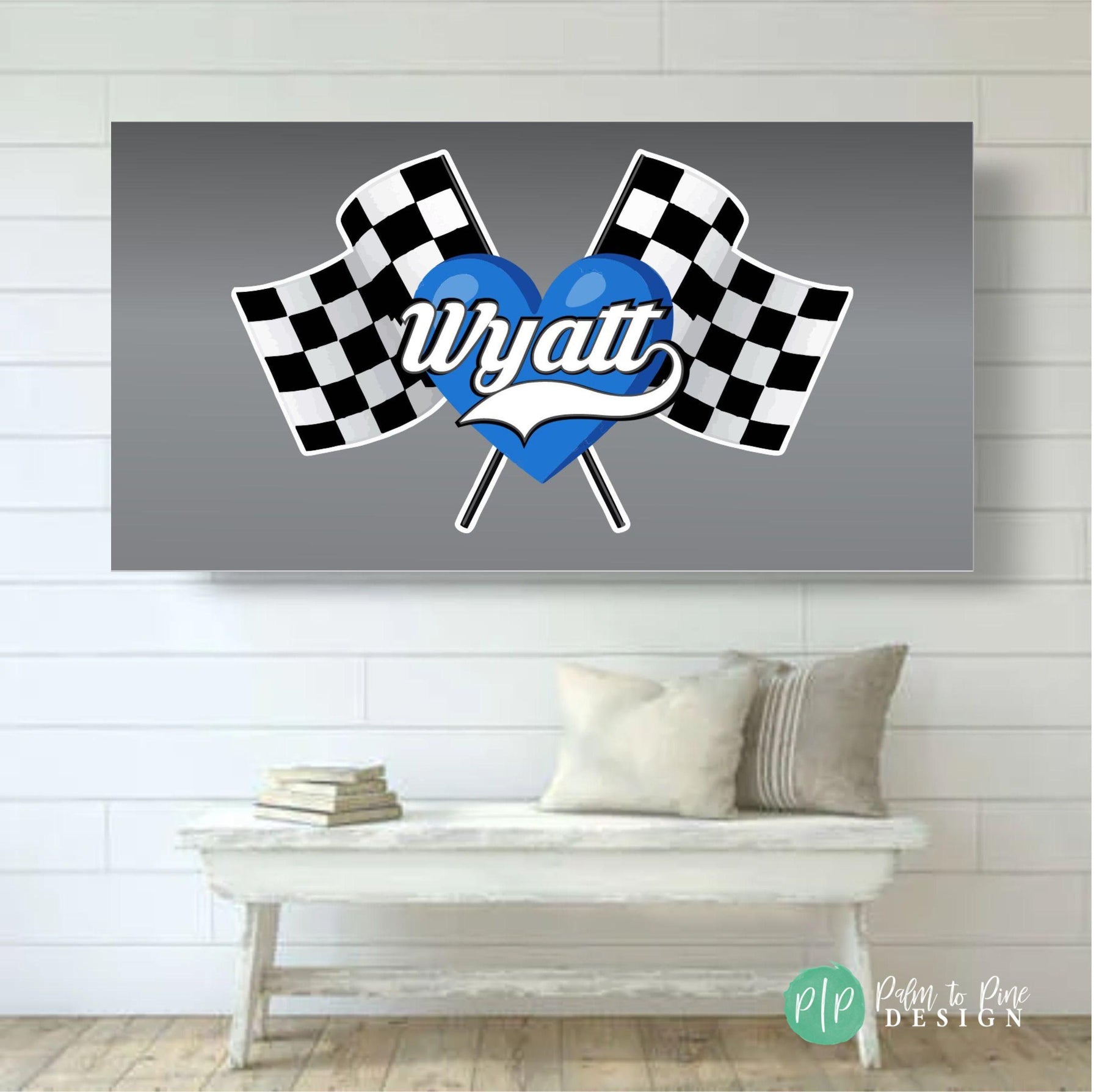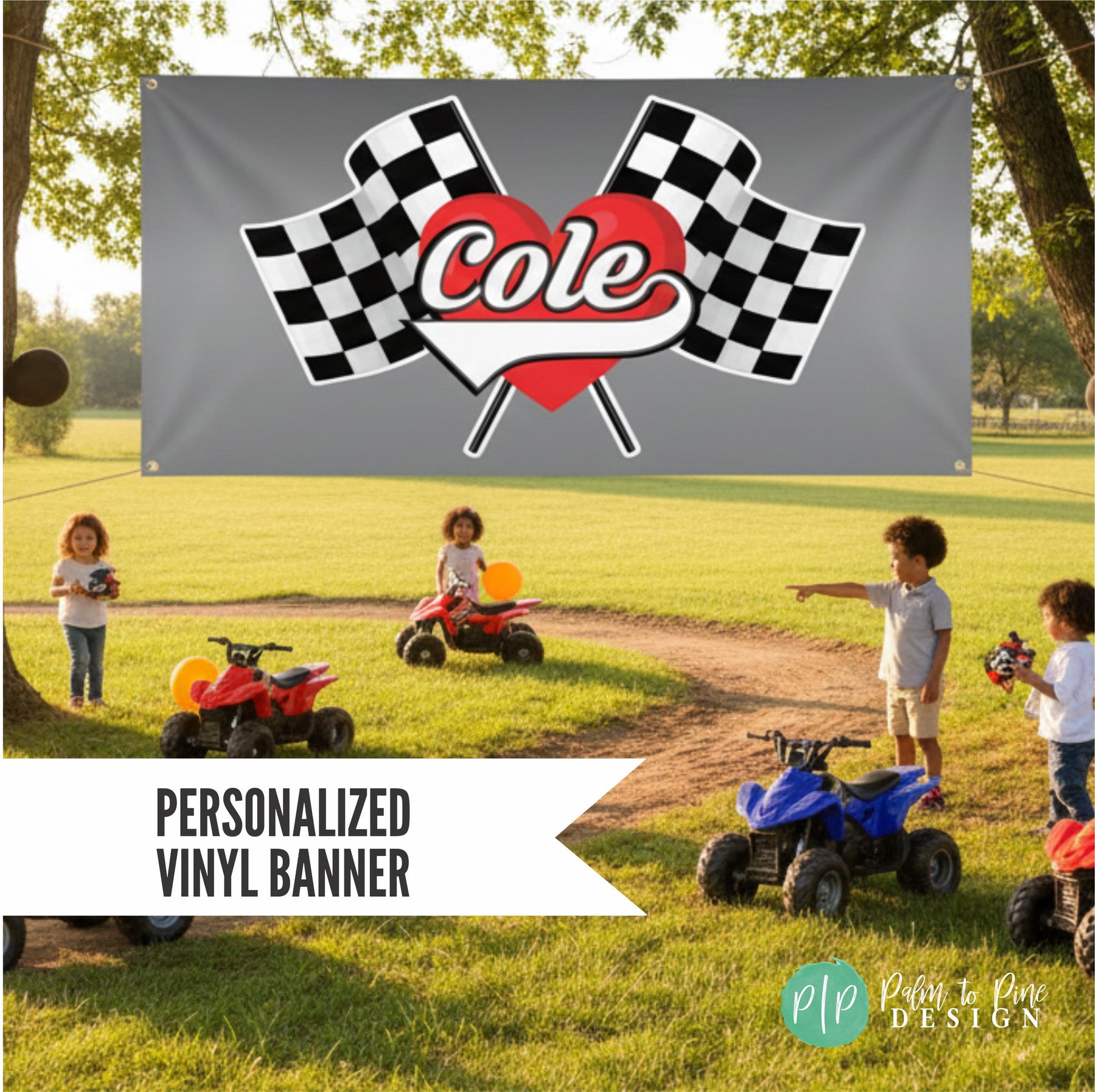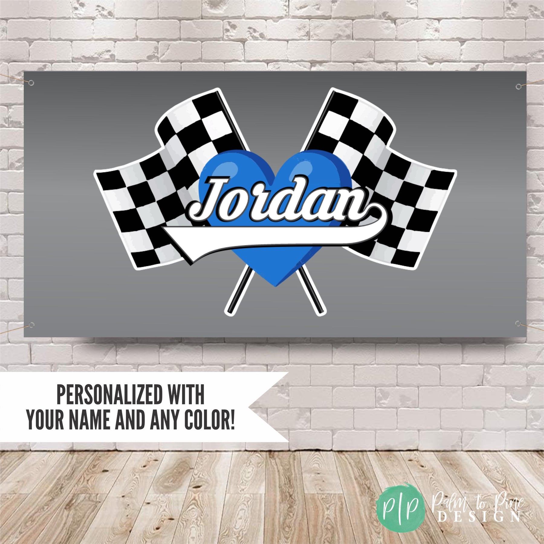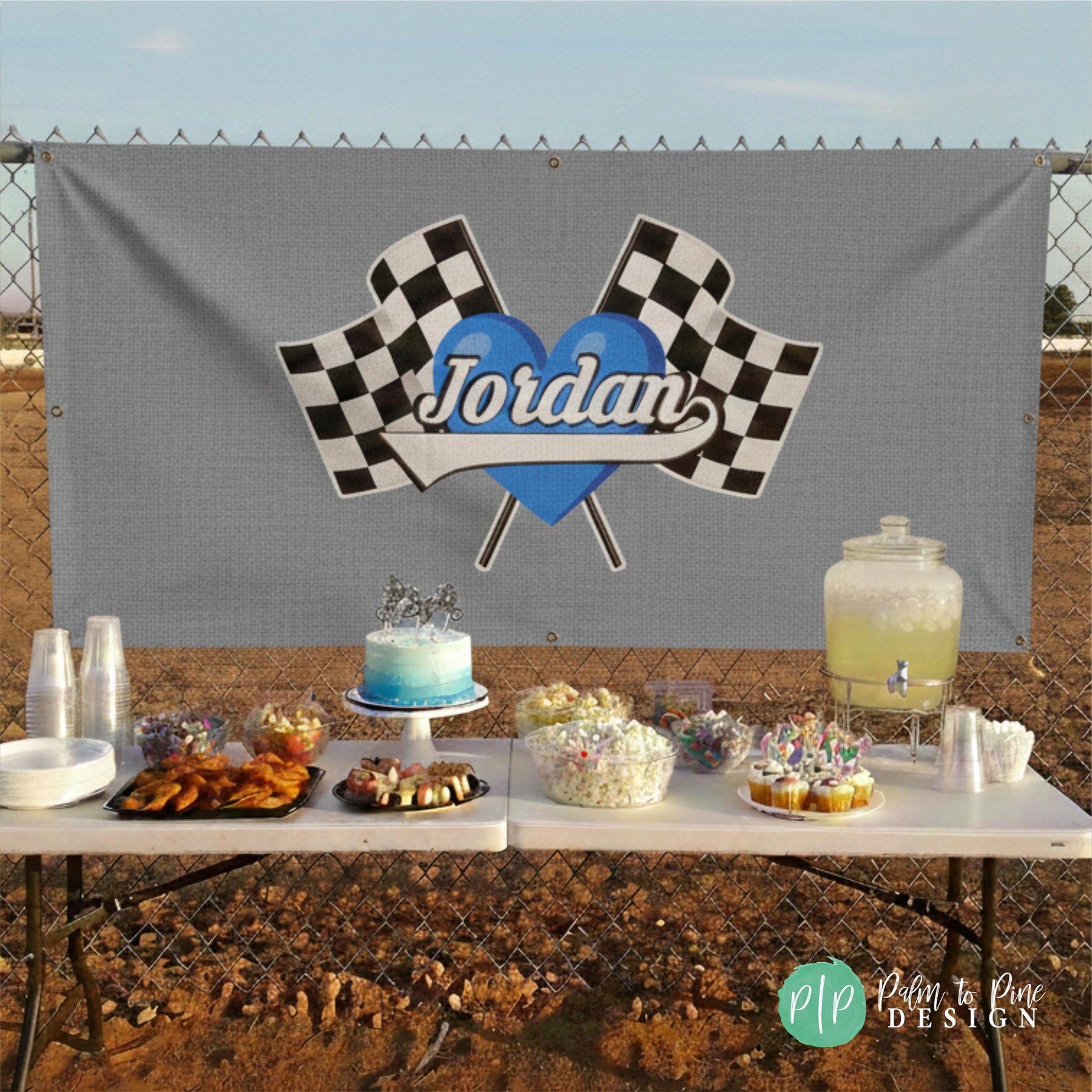 This checkered flag race car photo backdrop is the perfect personalized banner to make a statement for your Racers Birthday party! The heart and name in the center with the checkered flag is great for a dessert table backdrop, racetrack or photo backdrop for birthday party pictures or events at your BMX, dirt bike or ATV track. Customize this banner in any color scheme to match your race team colors