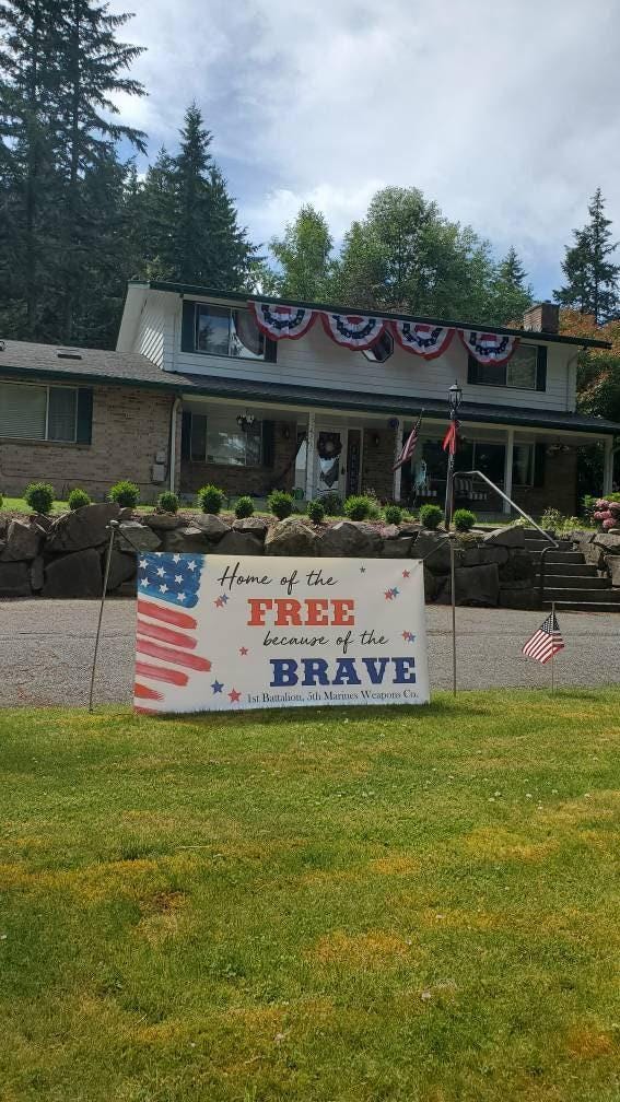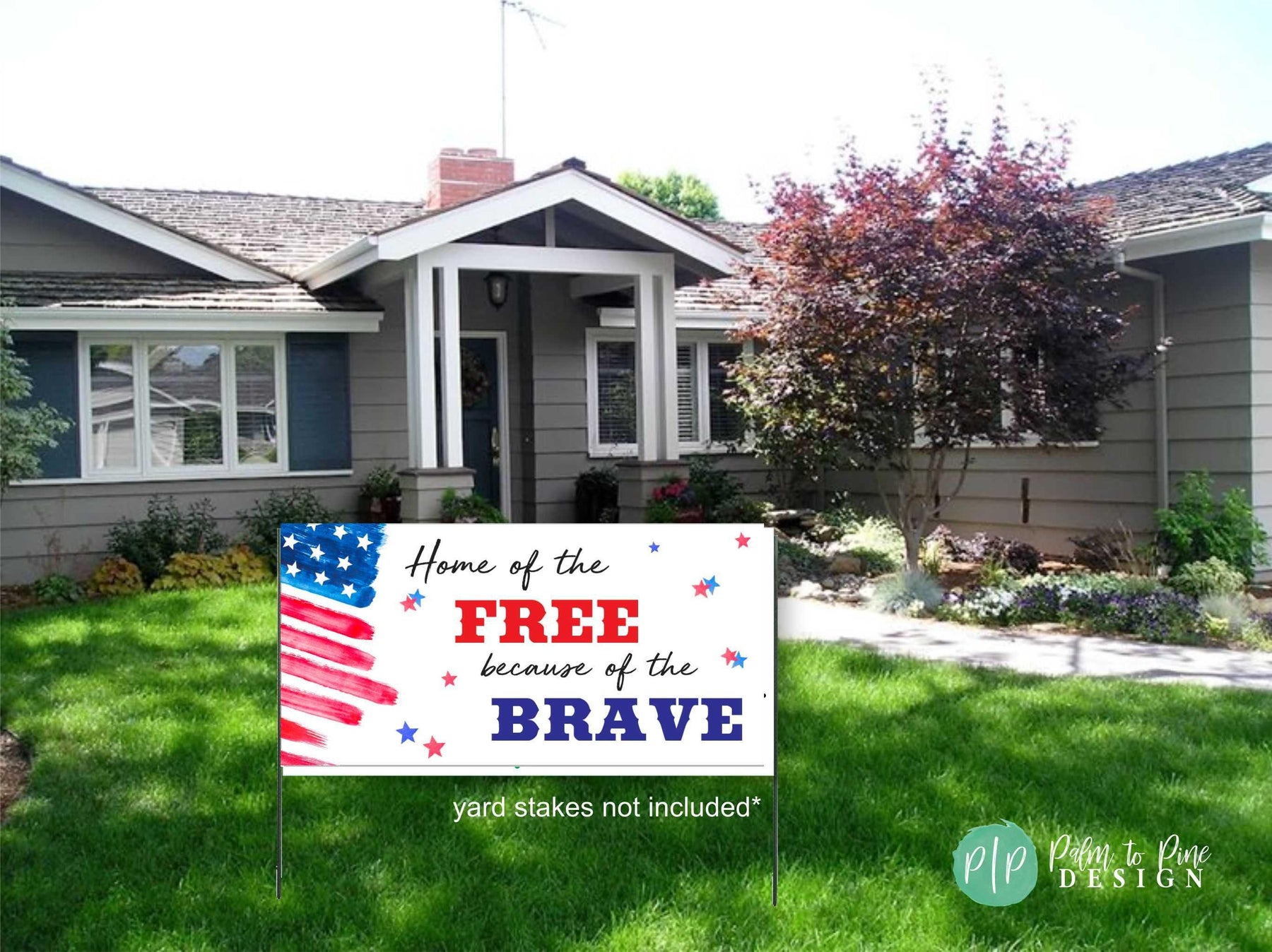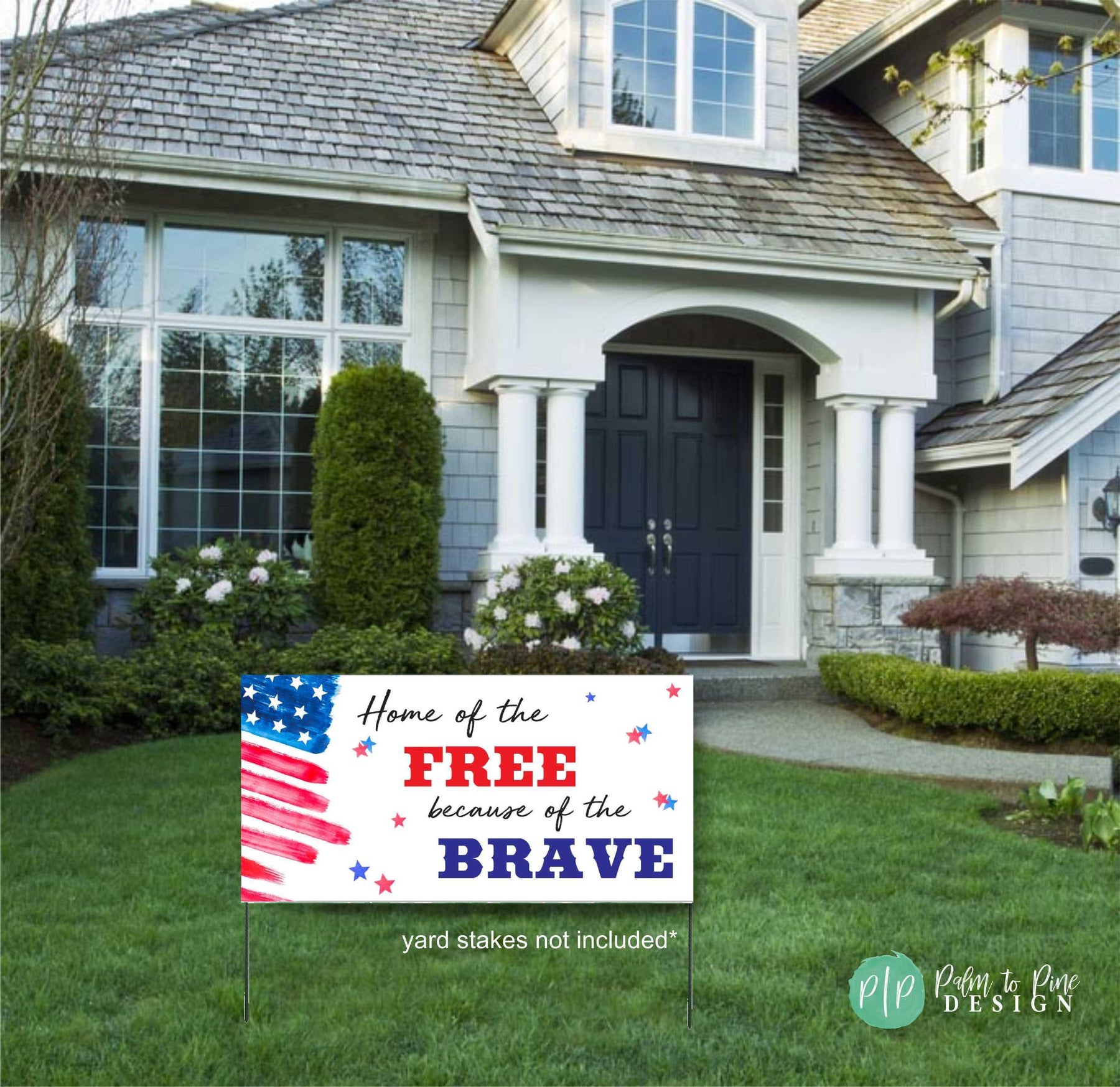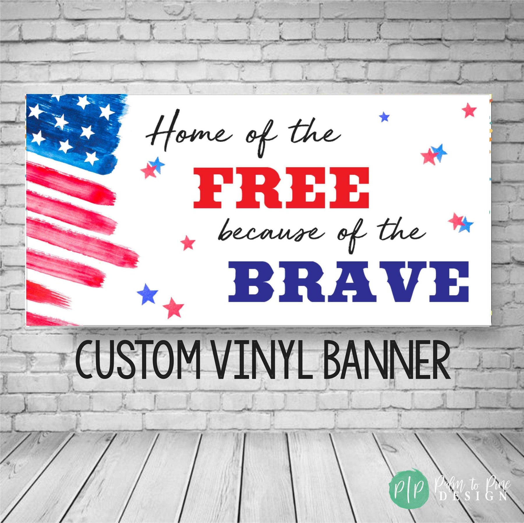 This patriotic red, white and blue Home of the Free, Because of the Brave durable vinyl yard banner is perfect for celebrating 4th of July, Memorial Day, Veteran's Day a military welcome home or appreciation and more. Hang this patriotic banner in your yard or use it to welcome home a military member or congratulate a boot camp graduate. This patriotic, stars and stripes vinyl banner is the perfect way to show your American pride any time of the year. This USA flag banner can also be personalized if you would like to include any military members names, or ranks, just include the request in your checkout notes.