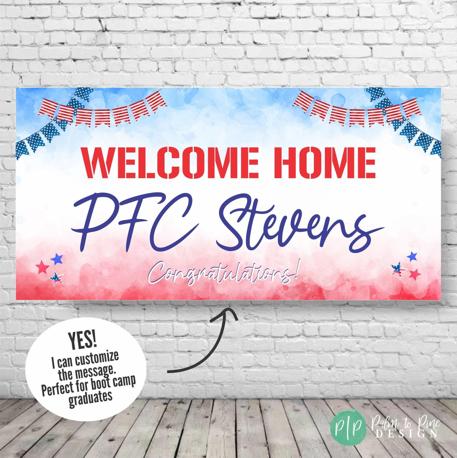 The image is a welcome banner for someone named PFC Stevens, congratulating them on their return home. The banner is set against a white brick wall and features patriotic elements such as American flags and stars. The banner also includes a message that reads "Welcome Home PFC Stevens" and a message that says "Congratulations!".
