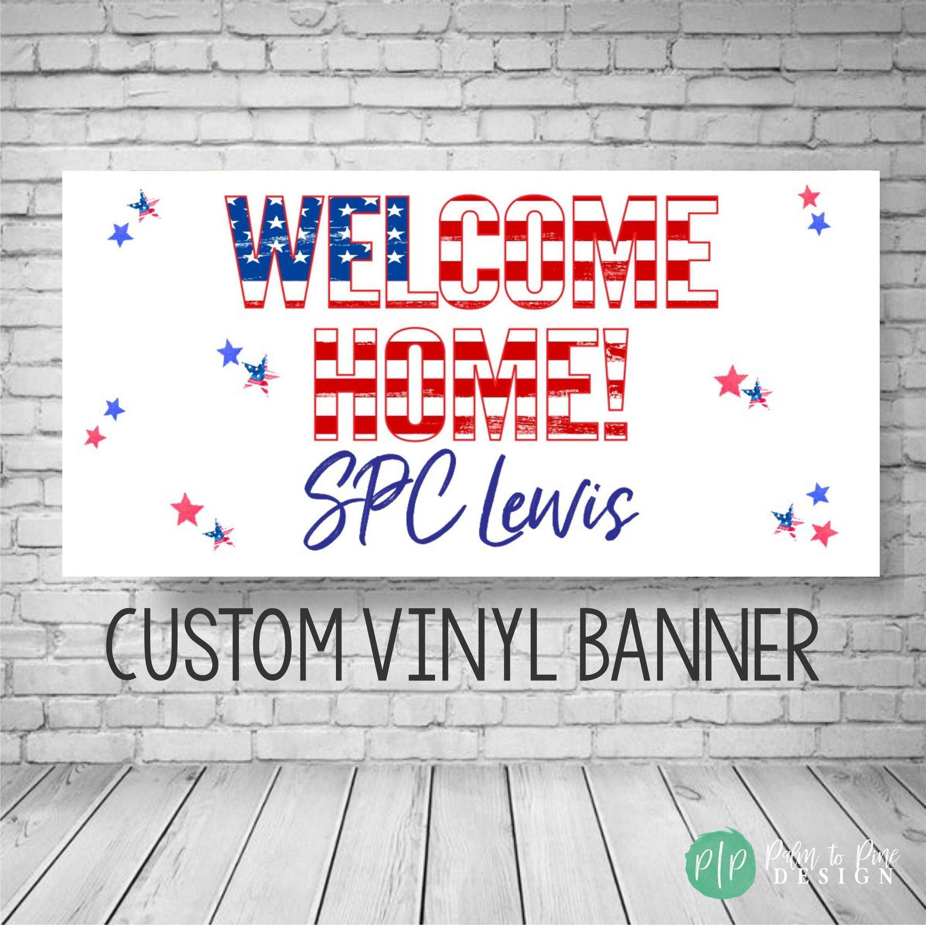 This red, white and blue Welcome Home Military Banner is perfect for welcoming home your service man or women, celebrating 4th of July, Memorial Day, Veteran's Day and more. Hang this patriotic banner in your yard or use it to welcome home a military member or congratulate a boot camp graduate. This patriotic, stars and stripes vinyl banner is the perfect way to show your American pride any time of the year. This USA flag banner can also be personalized if you would like to include any military members names, or ranks, just include the request in your checkout notes.