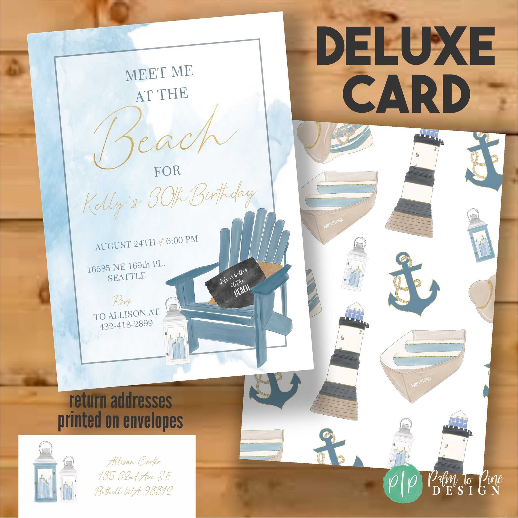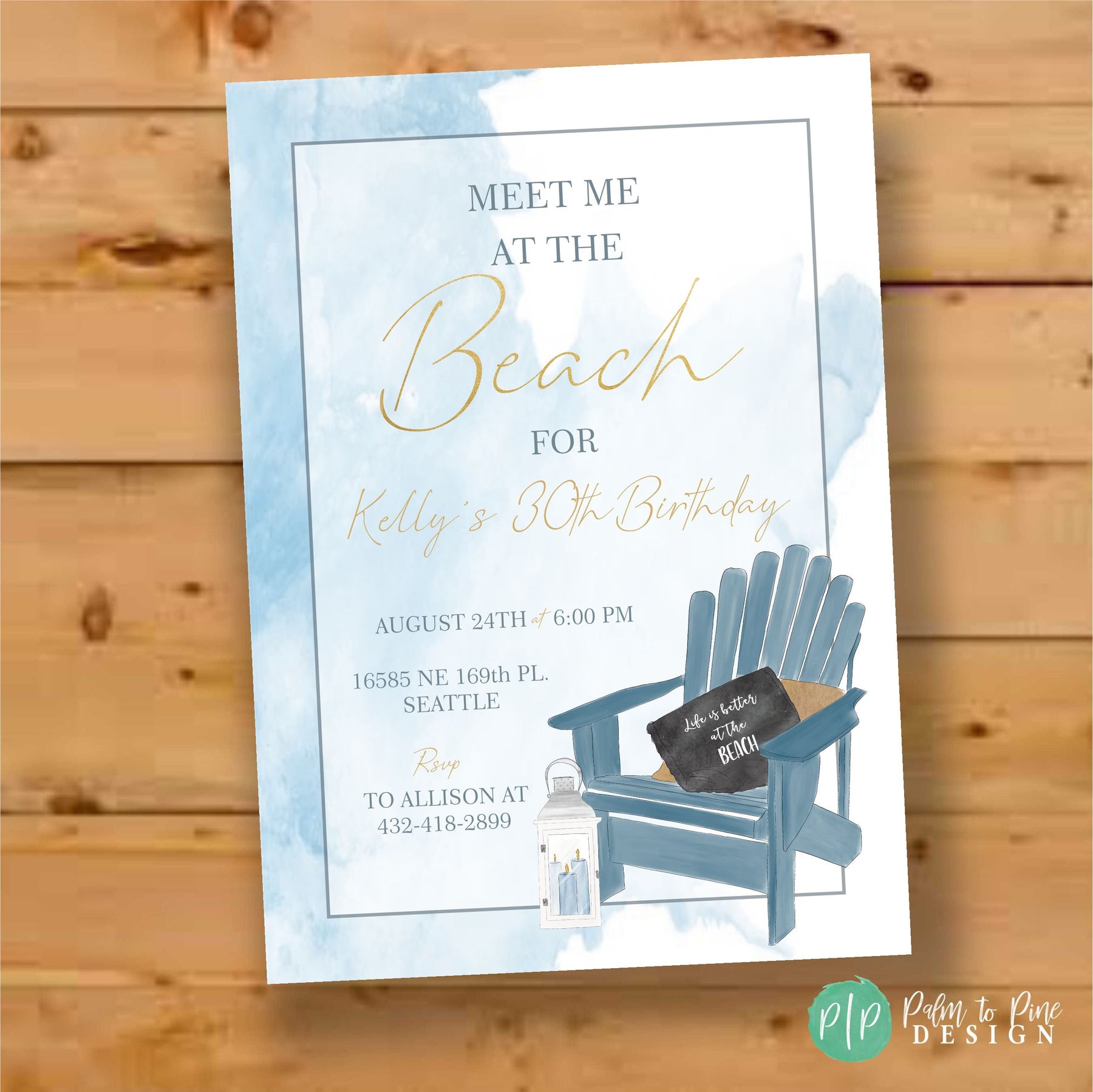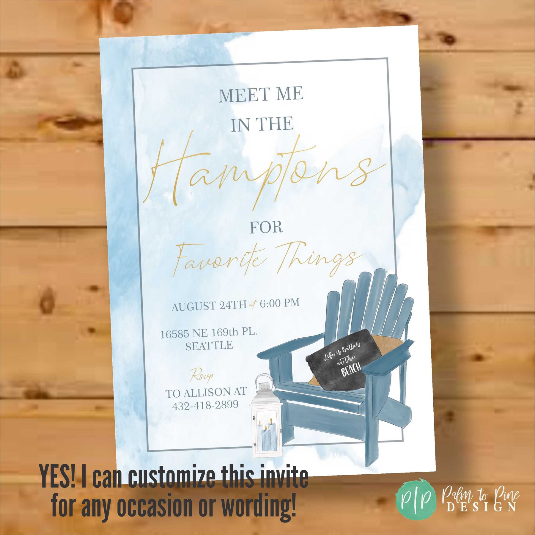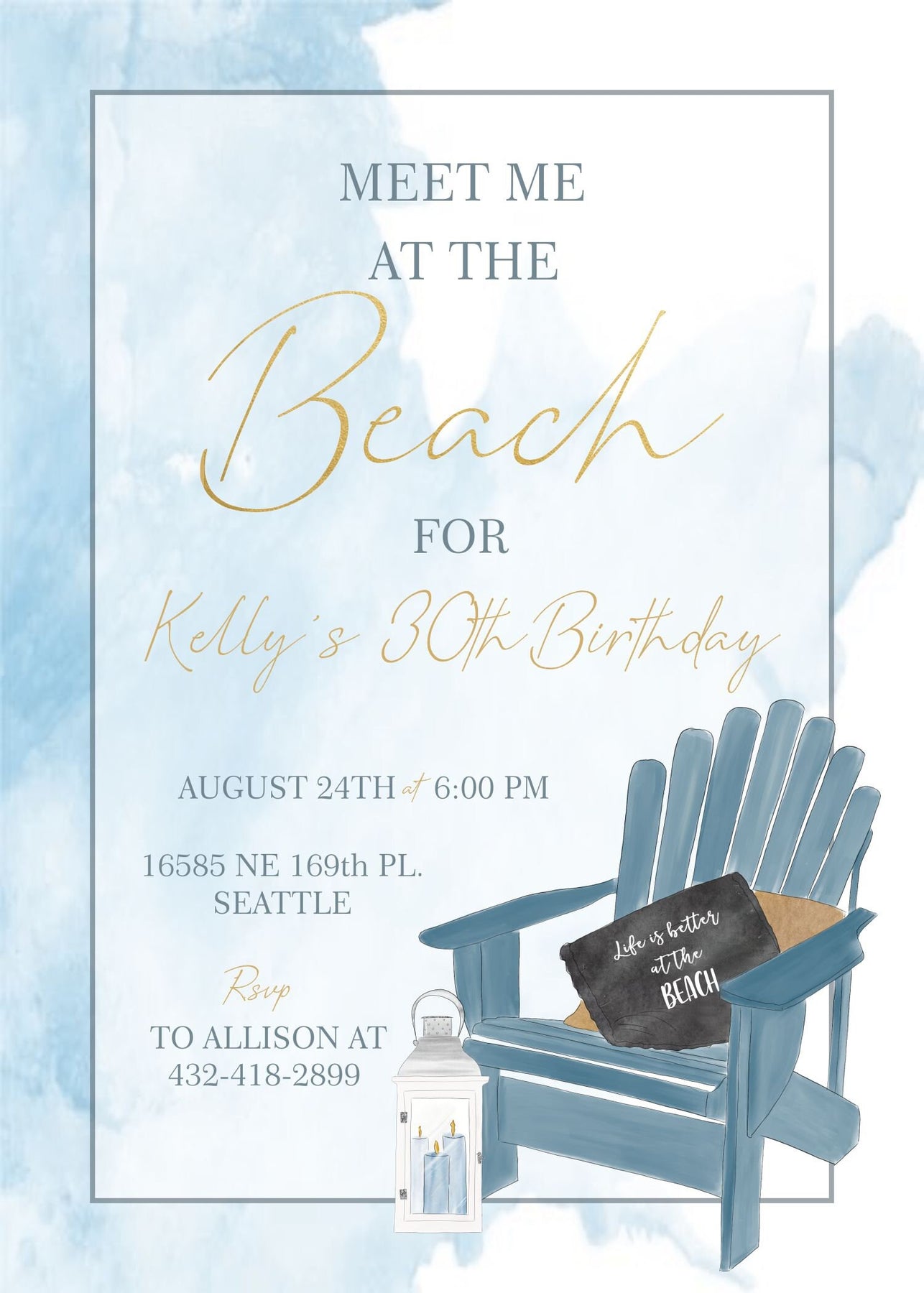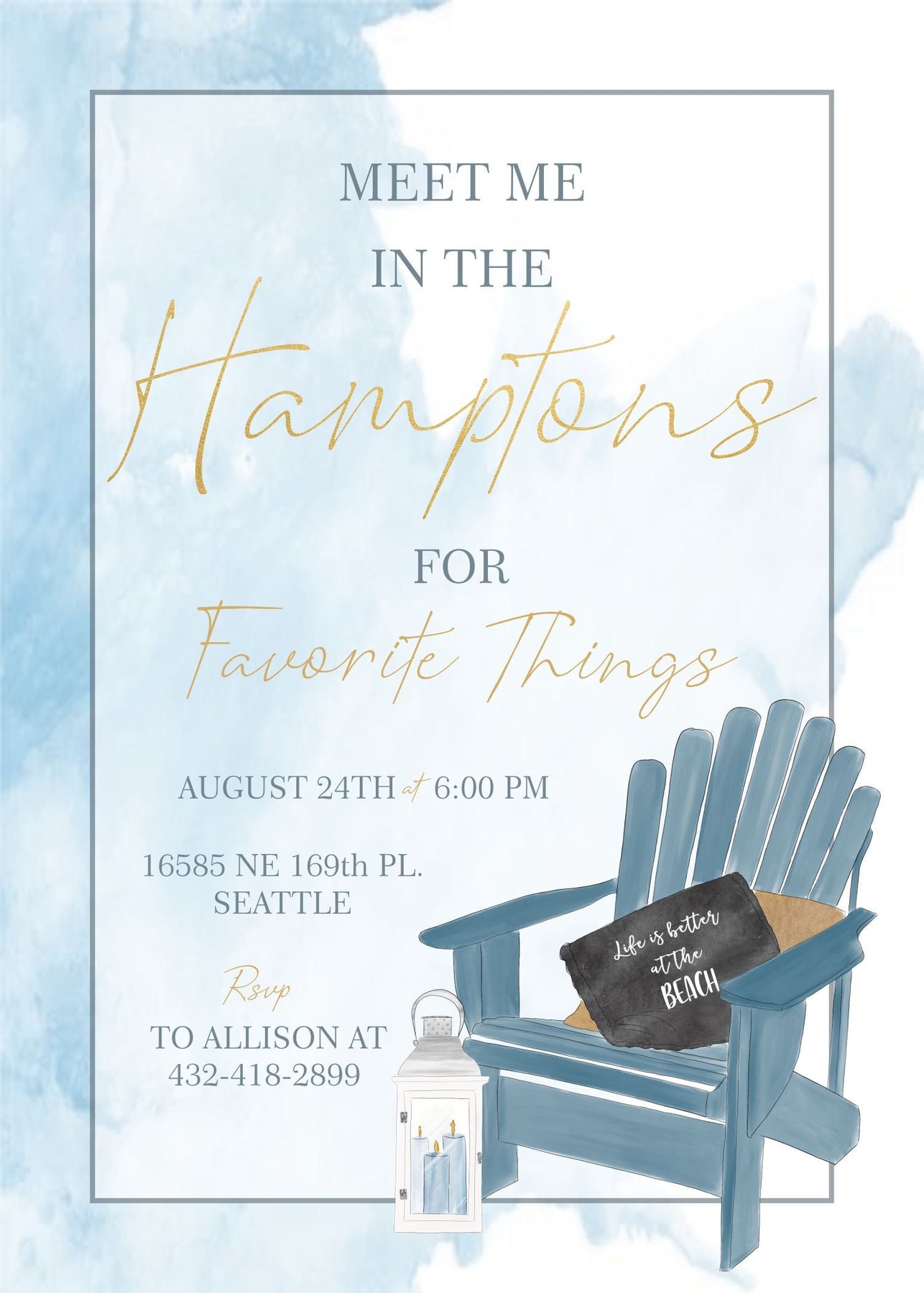 This modern Hampton's inspired coastal invitation with blue watercolor ocean background, Adirondack chair and beach lanterns is perfect to celebrate a Thirtieth, Fortieth, Fiftieth birthday party, upscale beach bridal shower, elegant Hampton's bachelorette weekend, beach retirement party or even a girls night out Favorite Things Party. All the text on this "Meet me at the Beach" party invitation is customizable for your party type or age, just include your personalized wording requests in the notes to seller section at checkout.