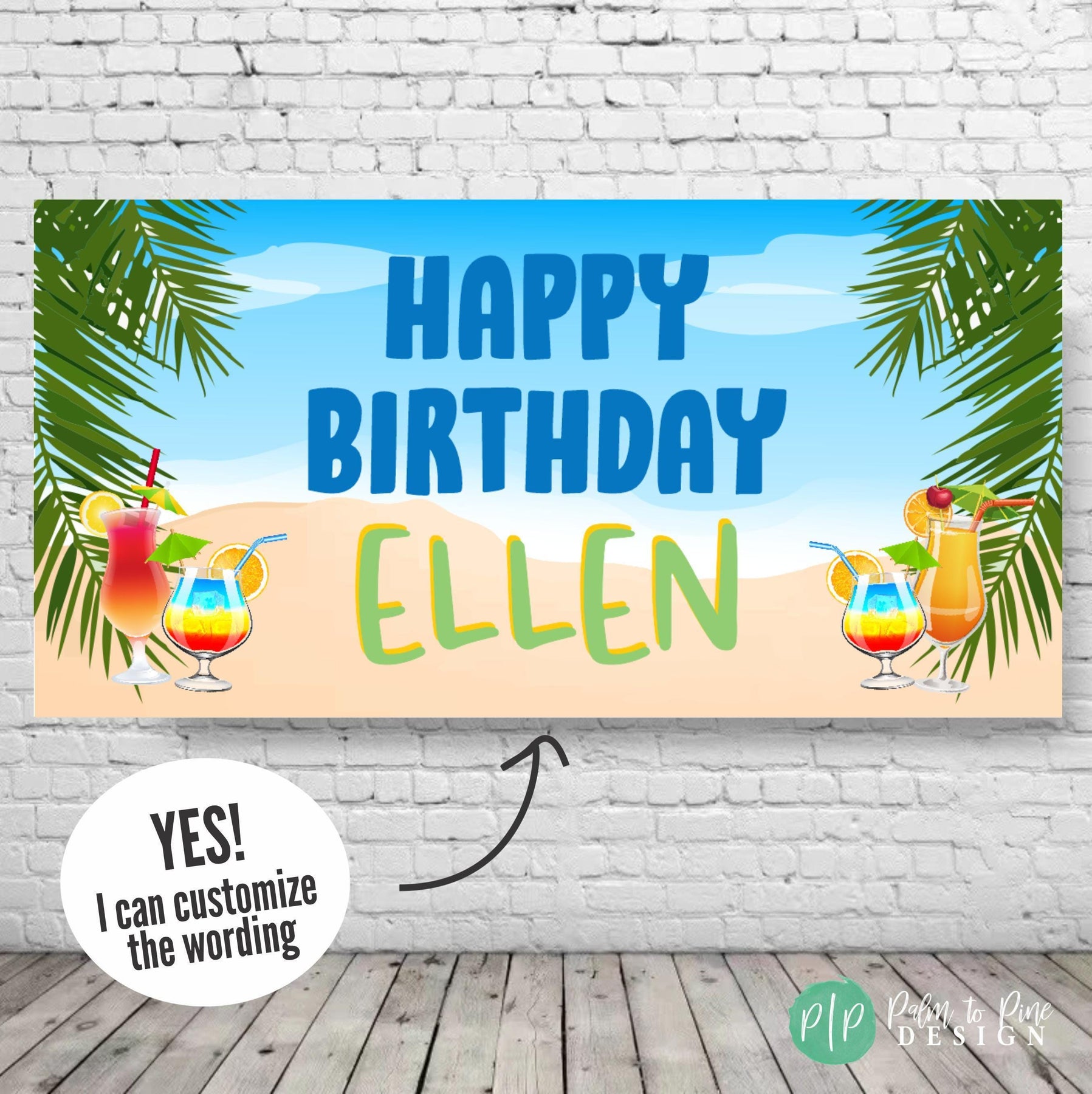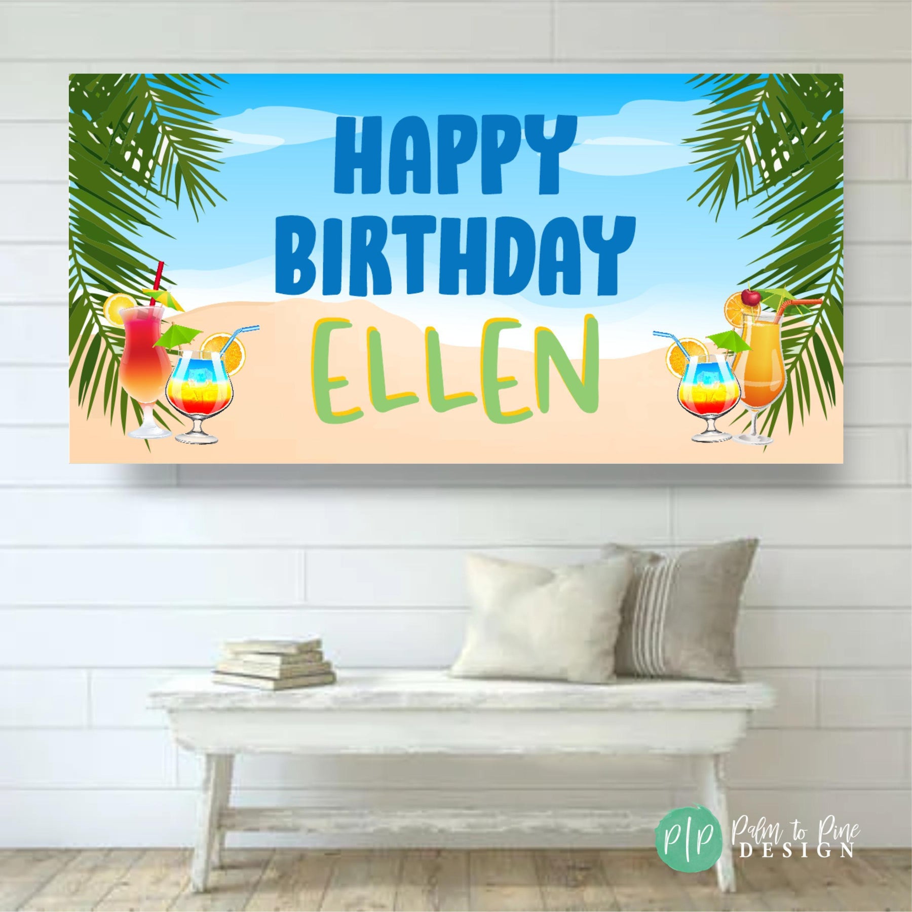 Personalized tropical retirement decor with palm fronds, ocean view, and cocktail illustrations reading Happy Retirement [Name]