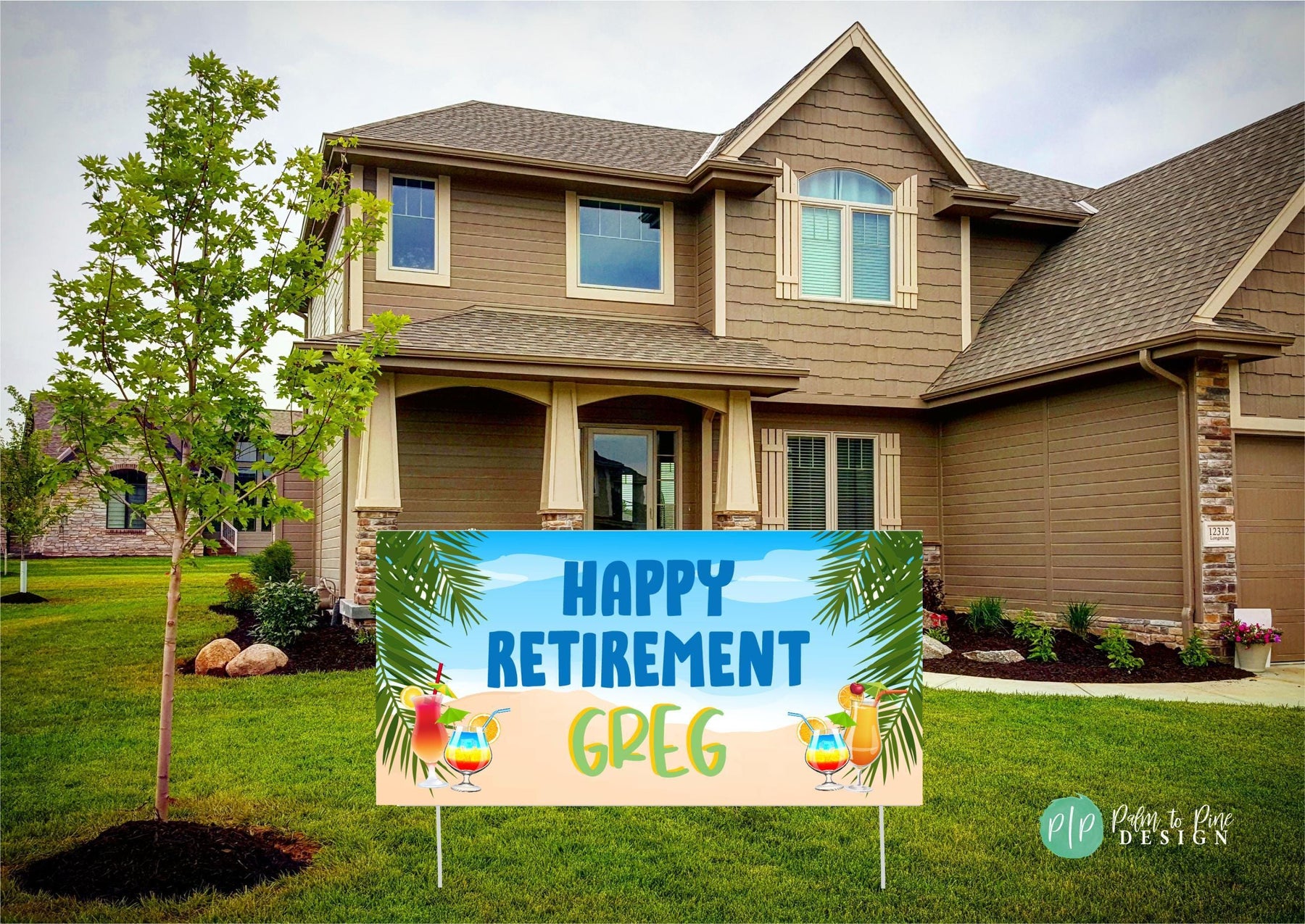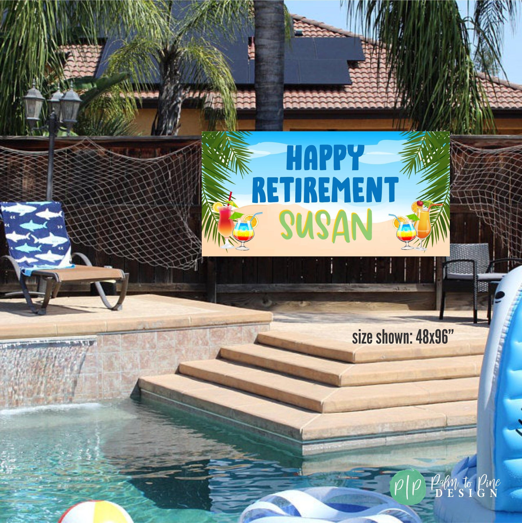 Beachy retirement party sign with personalized text Happy Retirement [Name], palm trees, and colorful tropical drinks